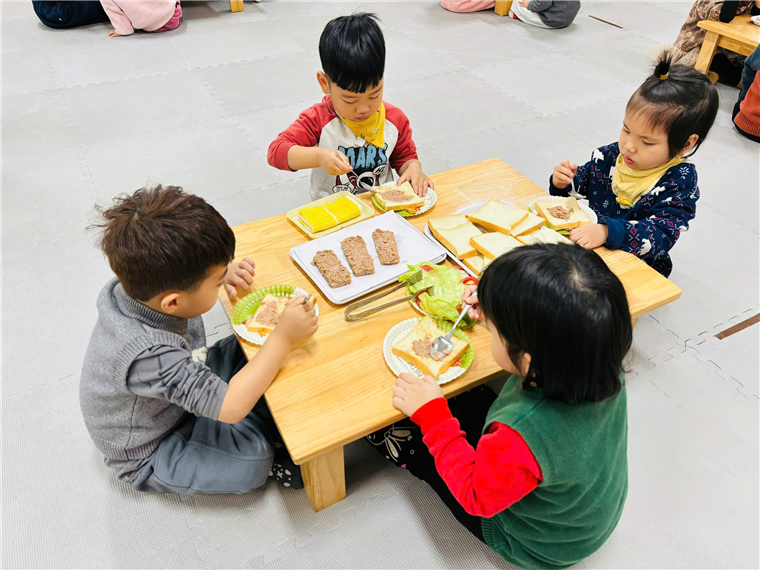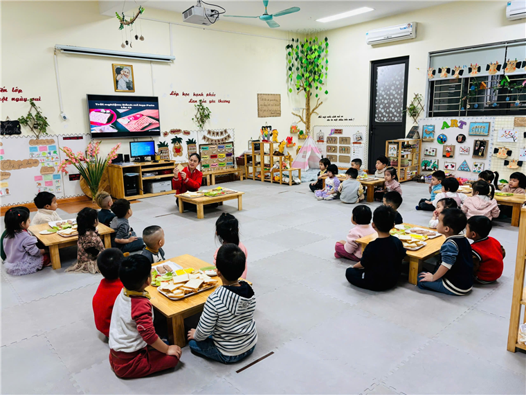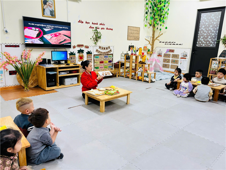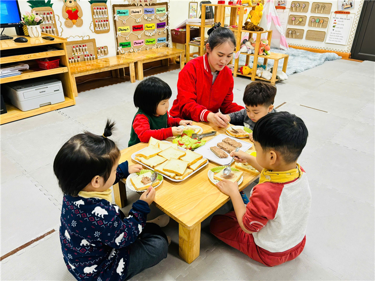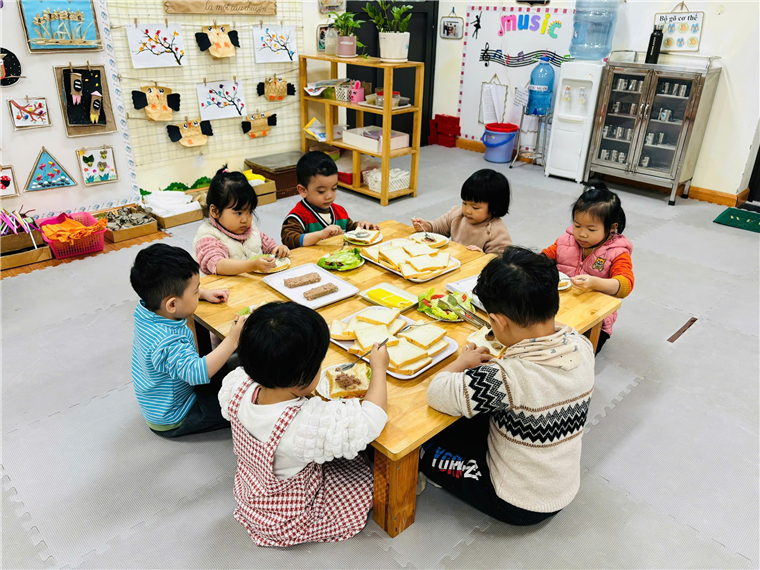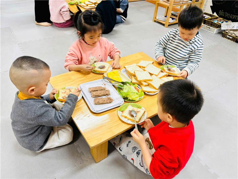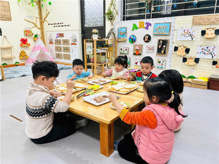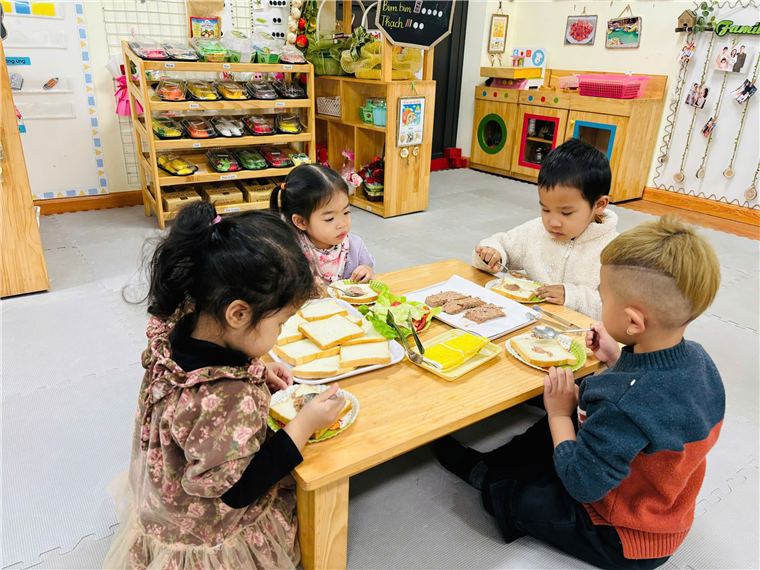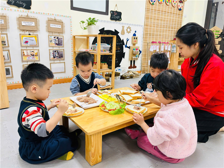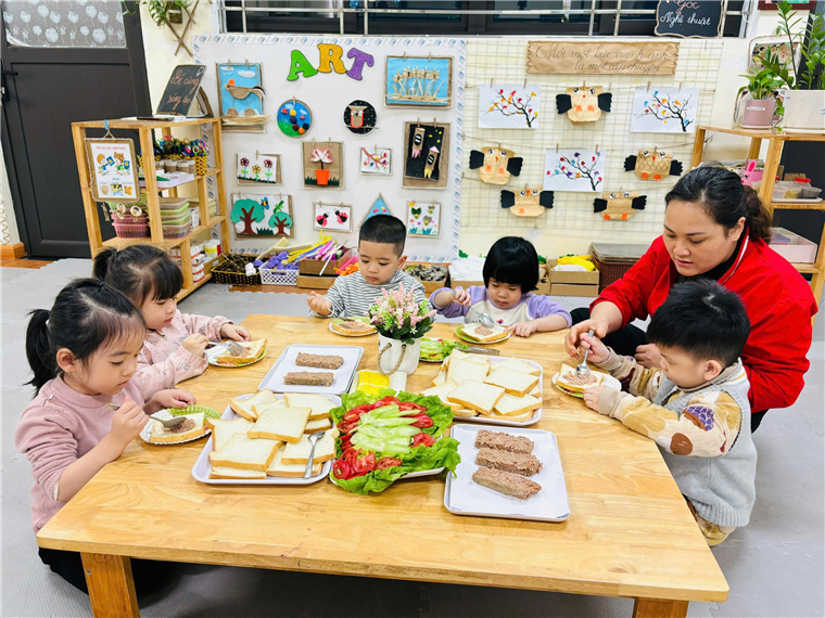 Các bé lớp MGB C2 trải nghiệm: Làm bánh mỳ kẹp ba tê