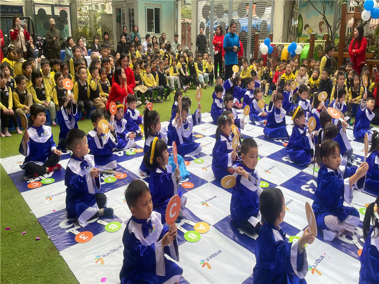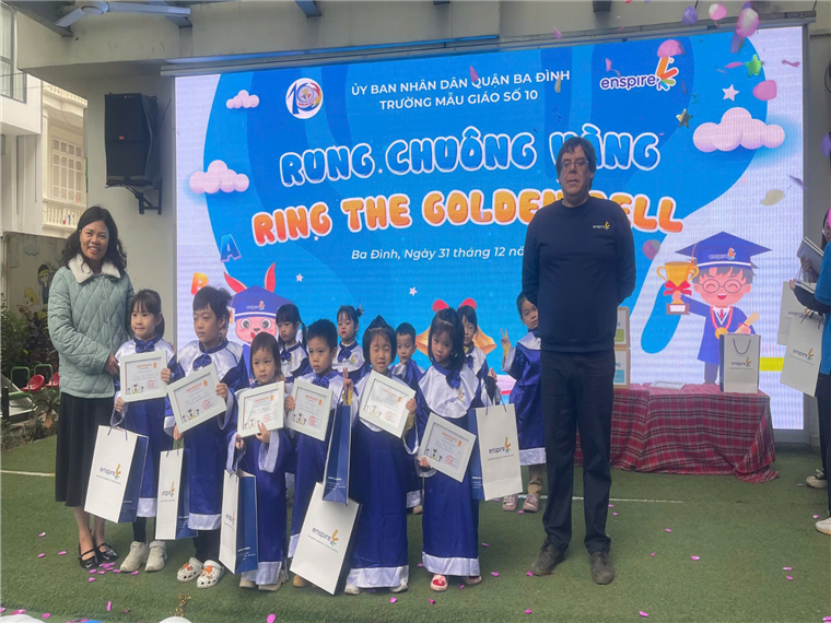 Sáng Ngày 31/12/2024 trường Mẫu giáo Số 10 phối kết hợp cùng trung tâm anh ngữ Enspire đã tổ chức cuộc thi “Ring The Golden Bell” dành cho các bé Khối MGN và MGL . Lớp MGN_B2 có 17 thí sinh tham gia thi. Trong đó có 1 thí sinh đạt giải 3, các thí sinh còn lại đạt giải khuyến khích. Đây là “sân chơi” thú vị, giúp các con thể hiện các kỹ năng về từ vựng, ngữ pháp, cấu trúc câu và ngữ âm tiếng Anh.