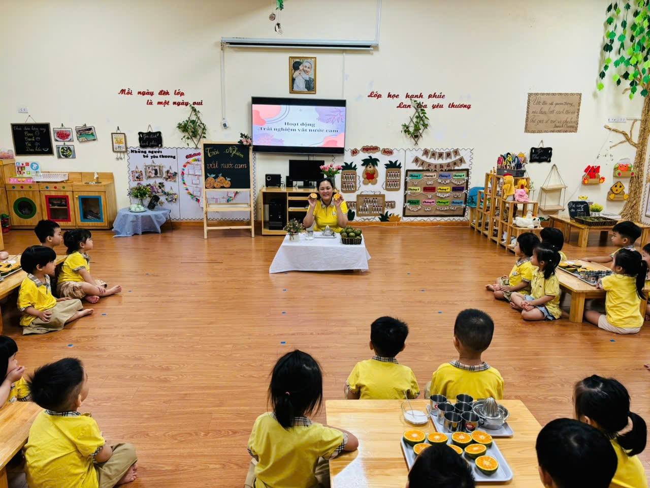 Ảnh cô giáo đang giới thiệu về quả Cam và cách vắt Cam.