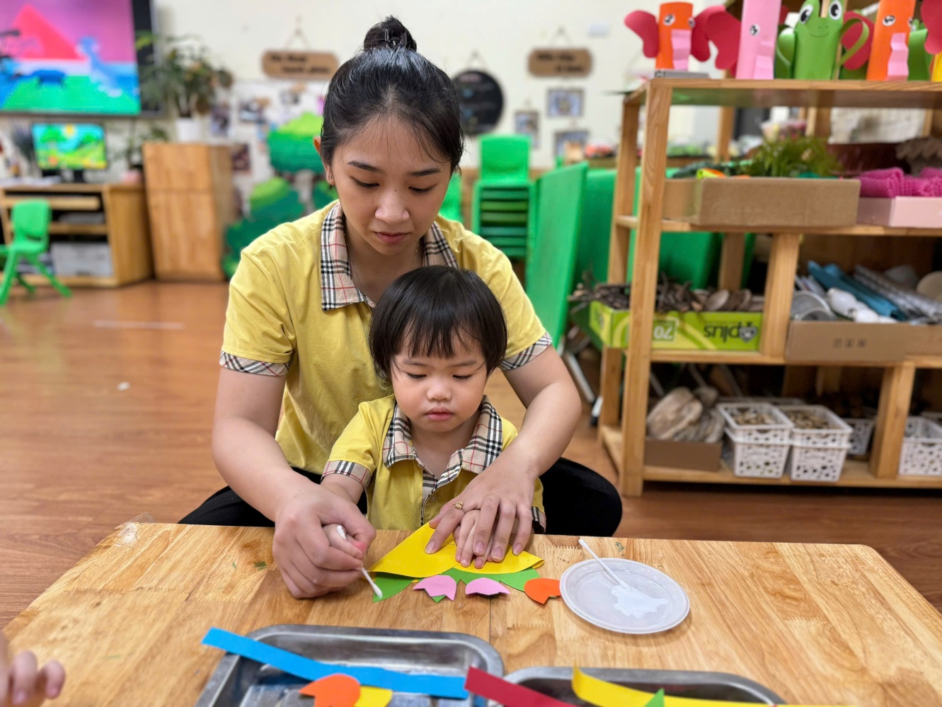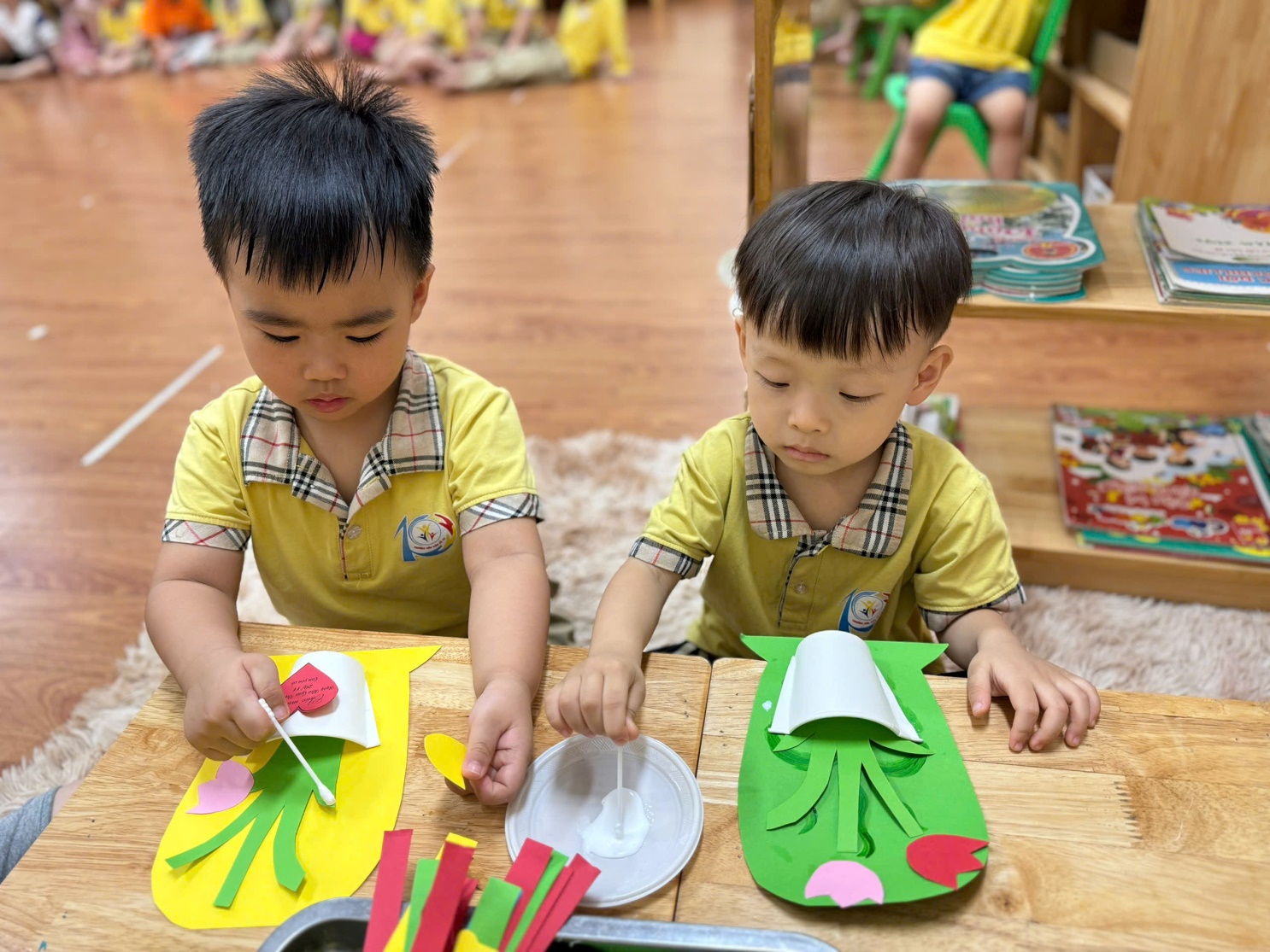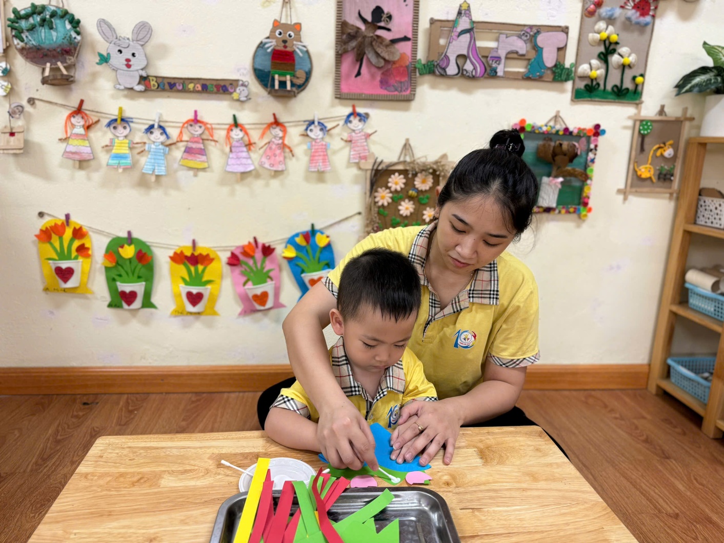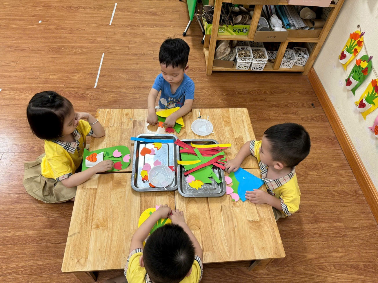 Từ những nguyên liệu thật đơn giản như bìa màu, kéo, hồ dán, bút màu…, mỗi bé được tự cắt dán và trang trí một tấm bưu thiếp thật sinh động để dành tặng riêng cho mẹ. Chắc chắn các mẹ sẽ rất vui khi nhận được món quà mà tự tay các con thực hiện và các con cũng sẽ cảm thấy tự hào khi mình đã đem đến niềm vui cho mẹ.