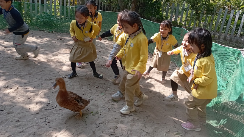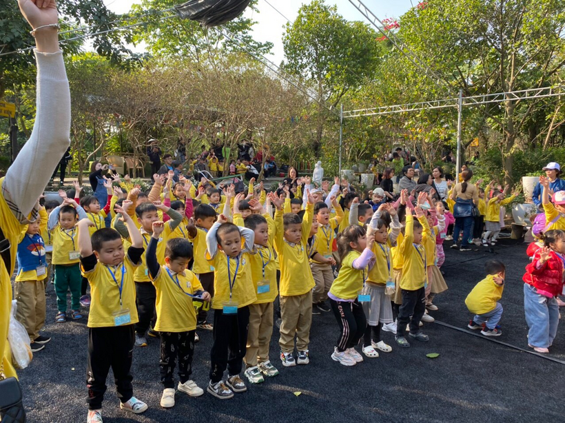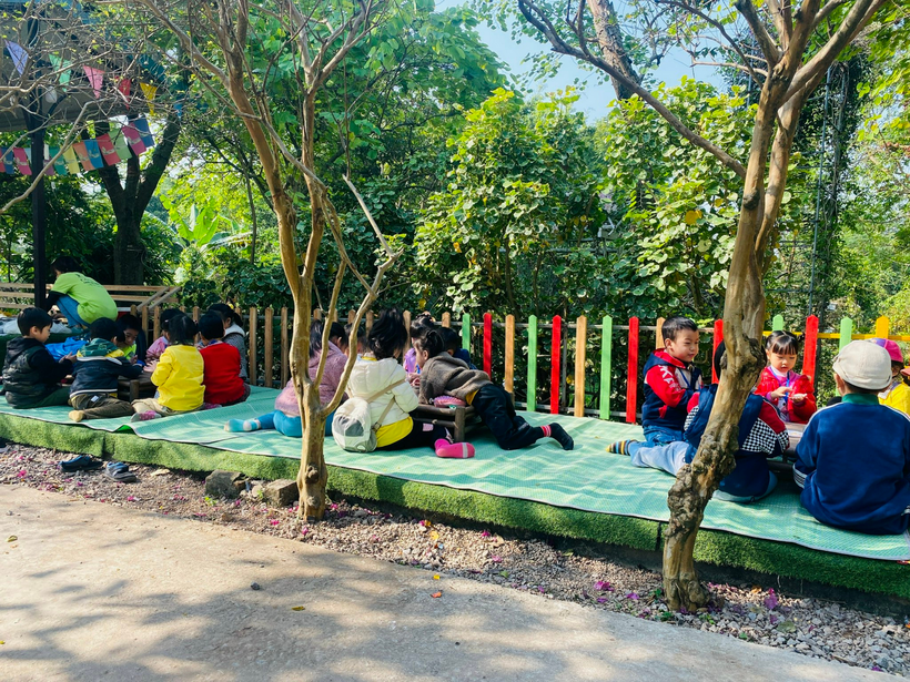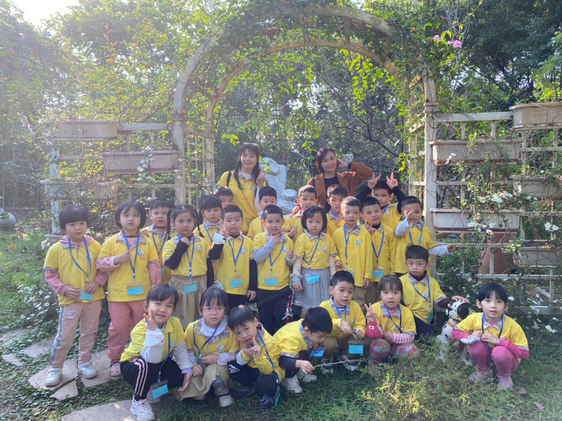 Bước chân đến công viên, là một cảm giác khoan khoái dễ chịu của cô và trò khi được đứng giữa màu xanh của cây cỏ hoa lá. Hai bên đường những hàng cây Tường vi như đón chào các bé, như mời gọi sự tò mò khám phá của trẻ đối với thiên nhiên.