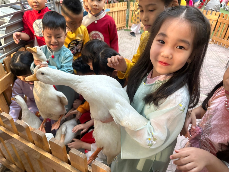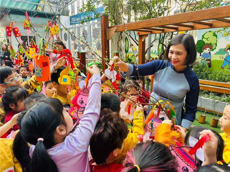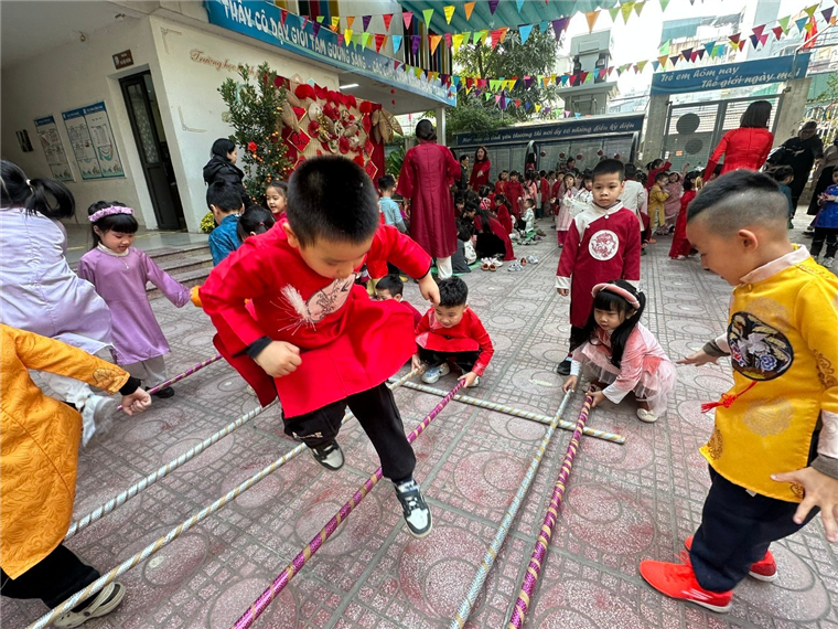Khai mạc lễ hội các bé cùng múa hát giai điệu “Chúc xuân”, được treo những chiếc đèn lồng xinh xắn có ghi những lời chúc, lời mong ước của các bé cho một năm mới tốt đẹp, nhiều niềm vui. Sau đó các bé được tham gia các nhóm chơi dân gian trải nghiệm tại sân trường với nhiều các hoạt động phong phú và hấp dẫn như: làm tò he, làm tranh khắc, làm chuồn chuồn tre, làm câu đối Tết, bịt mắt đập niêu, kéo co, bắt vịt, nhảy bao bố, nhảy sạp… Và hoạt động mang hương vị ngày tết đặc trưng nhất là khu gói bánh chưng tết, các bé được trực tiếp quan sát, nghe cô bác hướng dẫn và tham gia gói bánh. Những chiếc bánh xinh xắn được hình thành khiến các bé vô cùng thích thú.