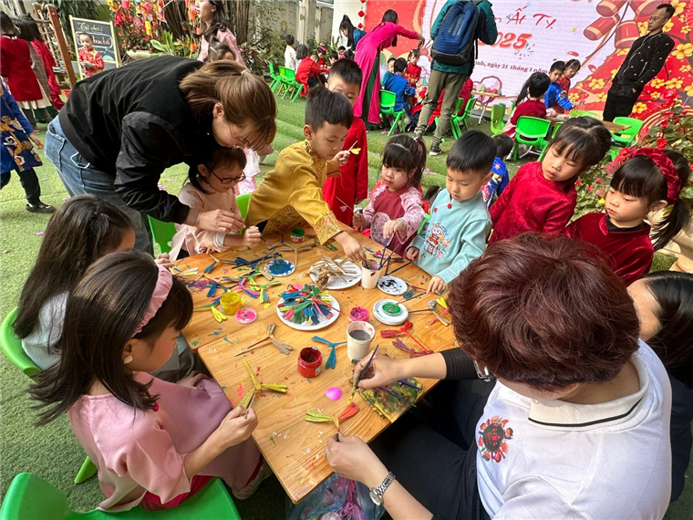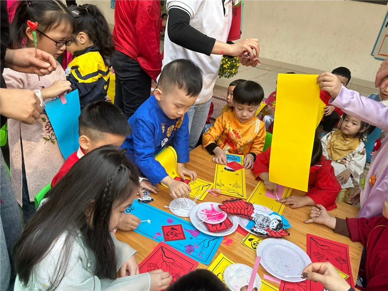 Các bé đã rất vui vẻ hứng thú tham gia các nhóm chơi để tự tạo cho mình các sản phẩm mang về làm quà tặng người thân trong gia đình nhân dịp Tết Ất Tỵ.