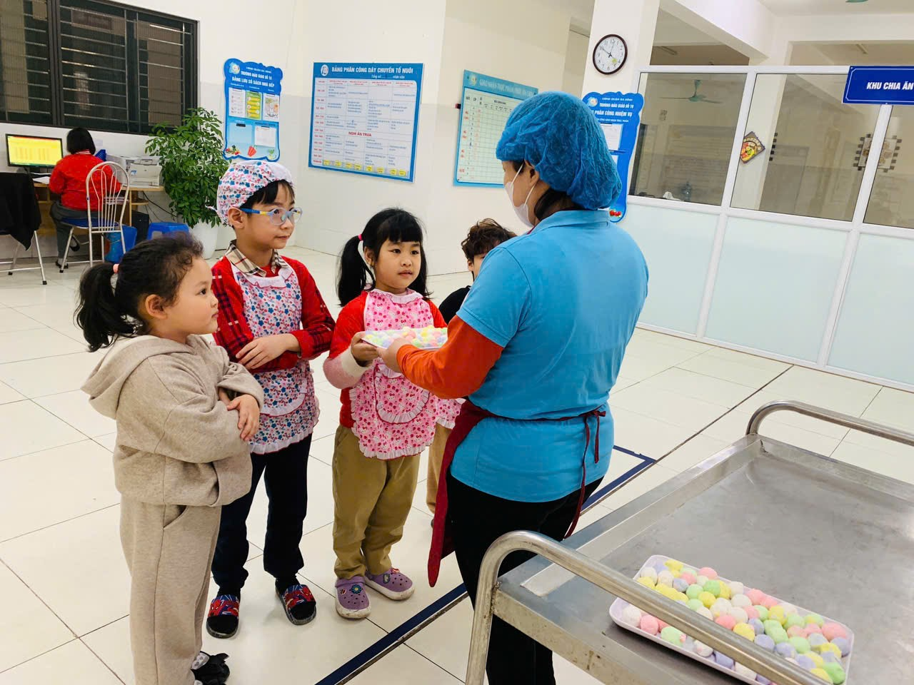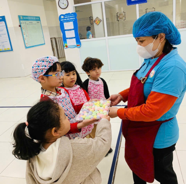 Sau khi làm xong bánh, các bạn nhóm trưởng cùng cô giáo mang lên nhờ các bác trong tổ bếp luộc giúp. Qua đó các con còn được thực hành kỹ năng biết cảm ơn và trân trọng người đã giúp đỡ mình.