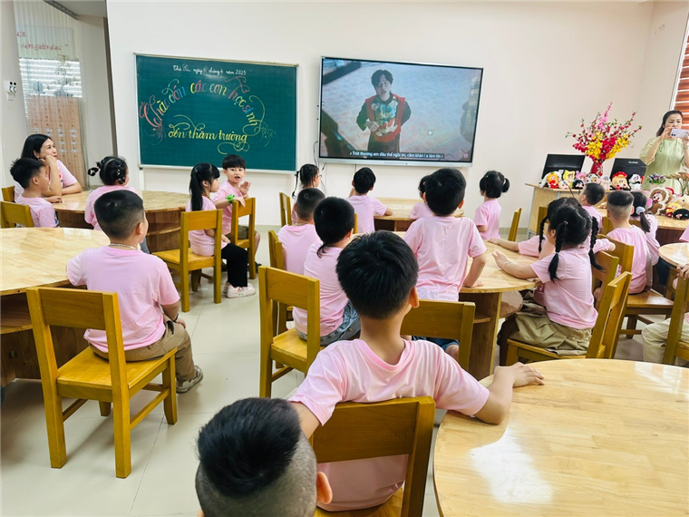 Các bé được xem những hình ảnh giới thiệu về trường, những thành tích mà trường đạt được. Sau đó là màn giao lưu văn nghệ giữa 2 trường.