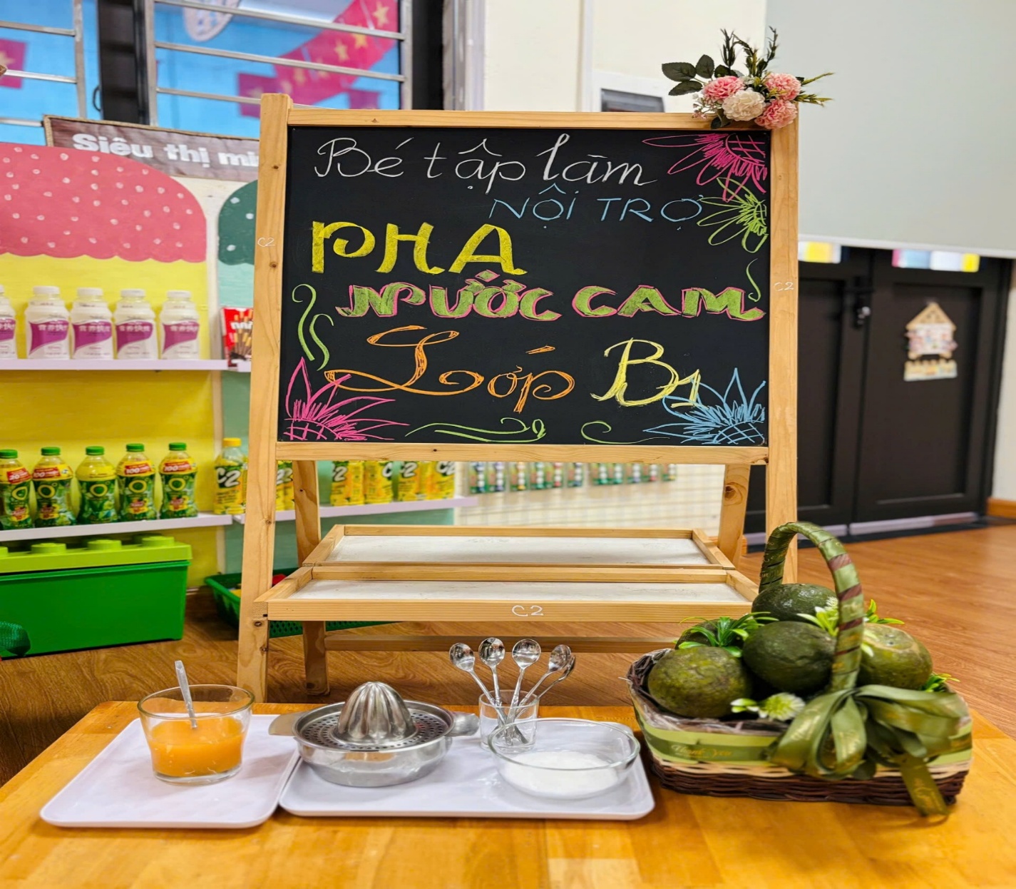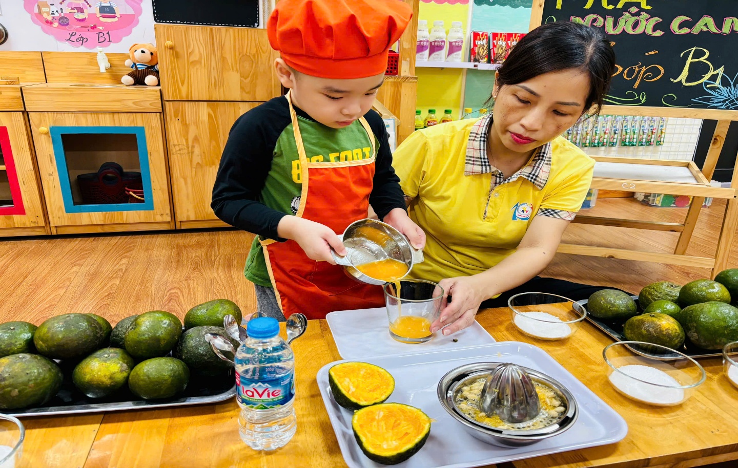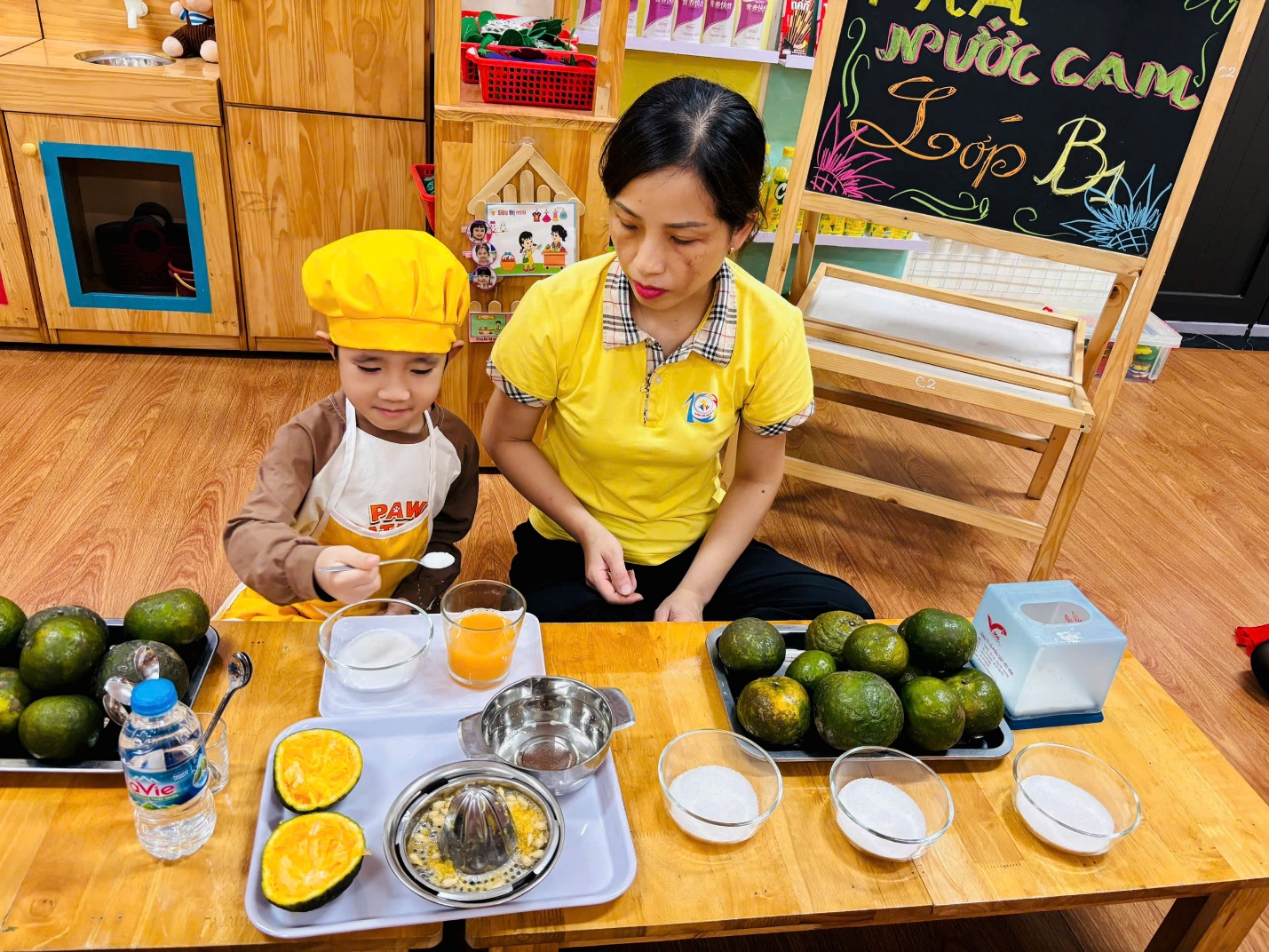 Hoạt động không chỉ giúp các con rèn luyện kỹ năng khéo léo, tự lập mà còn hình thành thói quen uống nước trái cây tốt cho cơ thể. Bạn nào cũng rất hào hứng và thích thú với ly nước cam “do chính tay mình làm”
