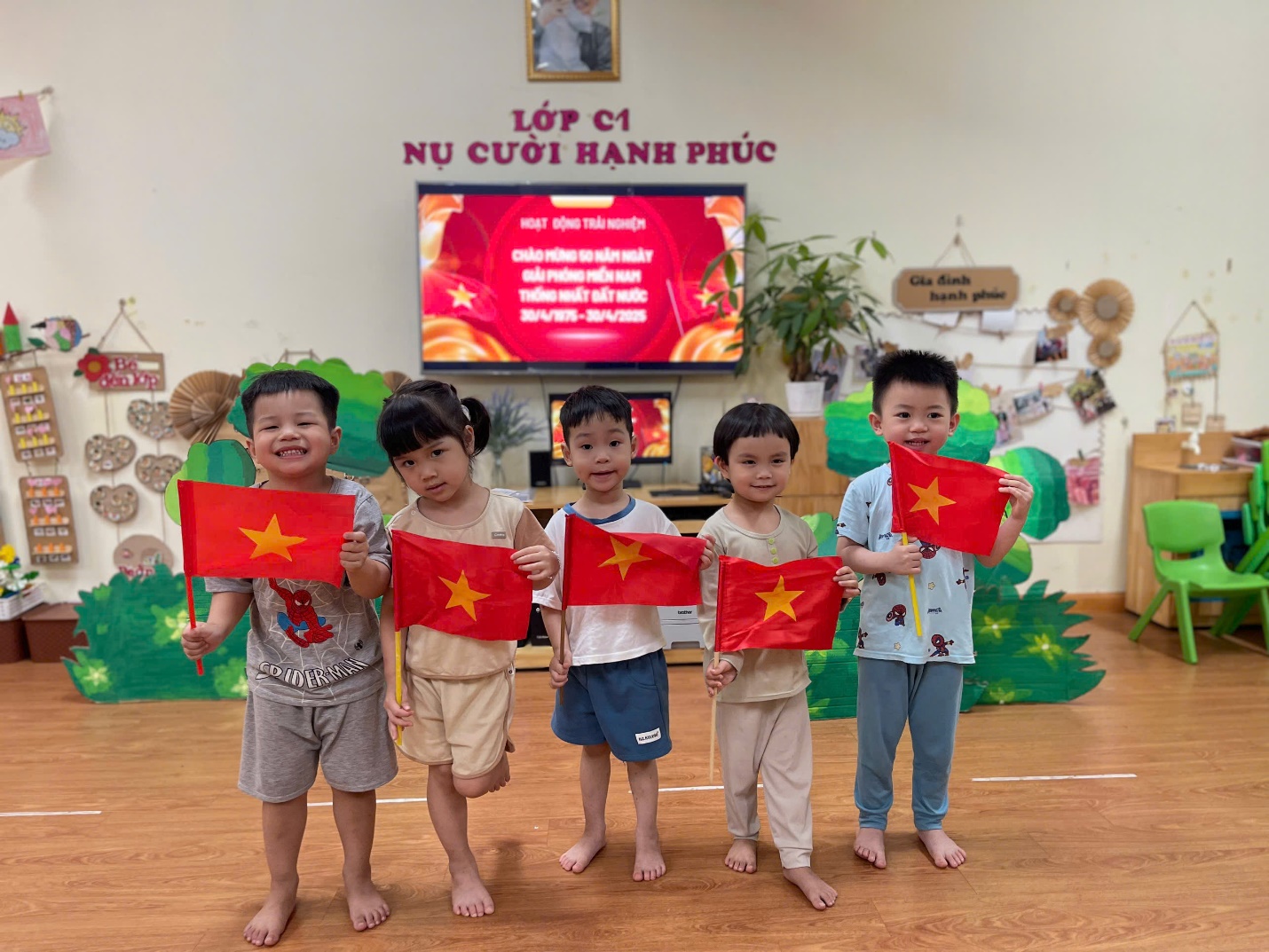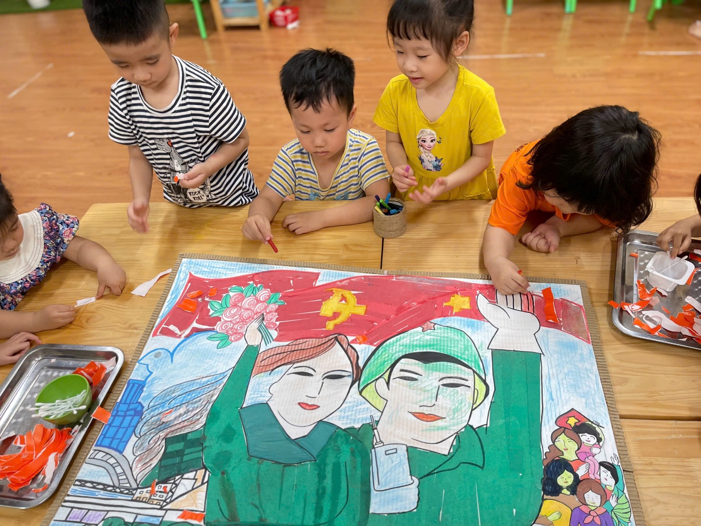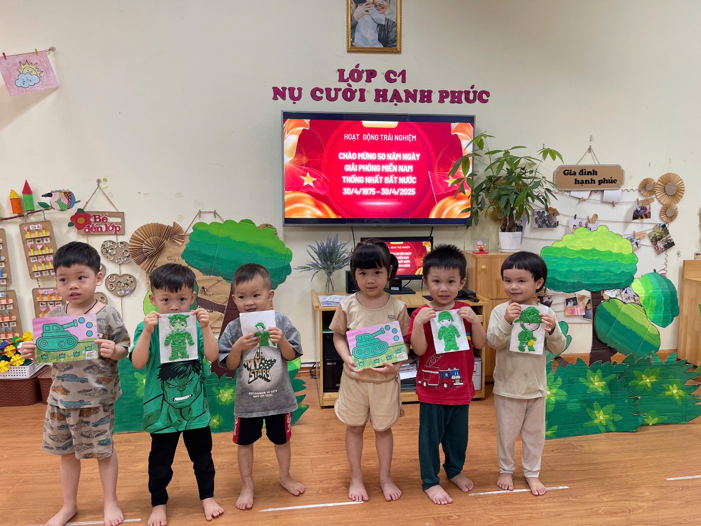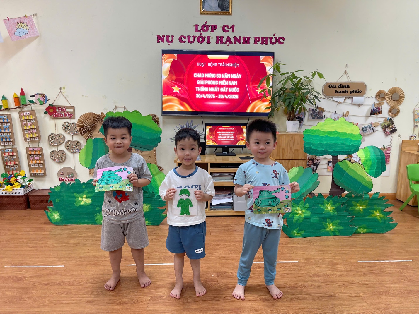 Chào mừng Ngày Giải phóng miền Nam 30/4 và 1/5, các bé đã được tham gia nhiều hoạt động ý nghĩa và vui nhộn. Với sự chuẩn bị chu đáo, nhiệt tình từ các cô giáo và sự đồng hành của các bậc phụ huynh. Các bé cùng cô giáo dán, trang trí tranh cổ động về Đảng, chú bộ đội , xe tăng và được nghe các cô kể chuyện về ngày thống nhất đất nước. Ngoài ra, các bé còn được tham gia múa hát những bài hát thiếu nhi vui tươi như: “Như có Bác Hồ trong ngày vui đại thắng”, “Em yêu Tổ quốc Việt Nam”. Thông qua các hoạt động chào mừng kỷ niệm 50 năm ngày giải phóng miền Nam, không chỉ mang lại niềm vui mà còn giúp các con hiểu rằng: chính nhờ sự hy sinh, dũng cảm của các cô chú bộ đội ngày xưa mà hôm nay các bé mới được sống trong hoà bình, ấm no.