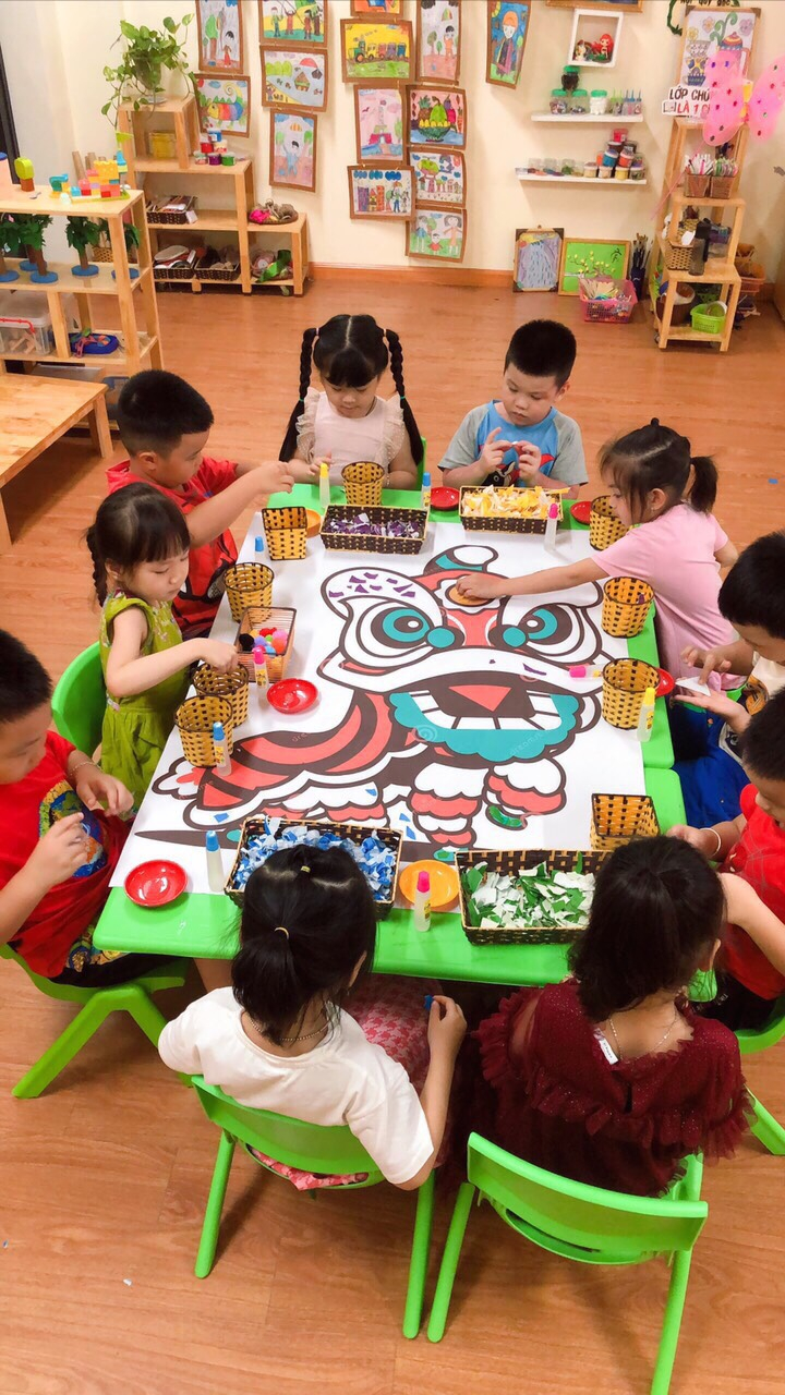 Với những nguyên vật liệu đã qua sử dụng tưởng chừng như đã bỏ đi như: Vỏ thùng catton, lõi giấy vệ sinh, giấy bìa, giấy màu, vỏ lon, que kem…. Với sự hướng dẫn tỉ mỉ của các cô, với đôi tay khéo léo cần mẫn, với đầu óc sáng tạo của các bé đã tạo ra những chiếc đèn lồng, chiếc mặt nạ, đầu sư tử…. và cả những con tò he thật ngộ nghĩnh, đáng yêu.
