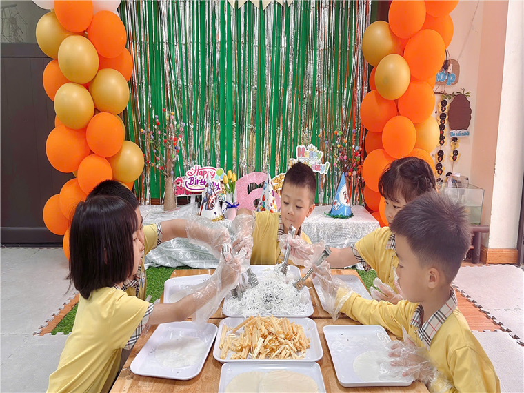Bò bía ngọt là món ăn vặt tuổi thơ của biết bao thế hệ, vị ngọt, béo béo của nó làm ai ăn cũng khó quên. Với những nguyên liệu đơn giản nhưng không kém phần hấp dẫn: Bánh tráng bò bía; Mạch nha cứng; Dừa tươi nạo sợi; Vừng đen thơm lừng… Dưới sự hướng dẫn của cô giáo, các con đã tự tay làm ra những chiếc bánh bò bía ngọt thơm ngon và vô cùng đẹp mắt. Đây không chỉ là cơ hội để các bé học hỏi, mà còn là khoảnh khắc để các con tự hào về "thành quả" do chính mình tạo ra. Niềm vui được nhân đôi khi các bé có thể thưởng thức món ngon mình làm ra và chia sẻ cùng cô giáo và các bạn!