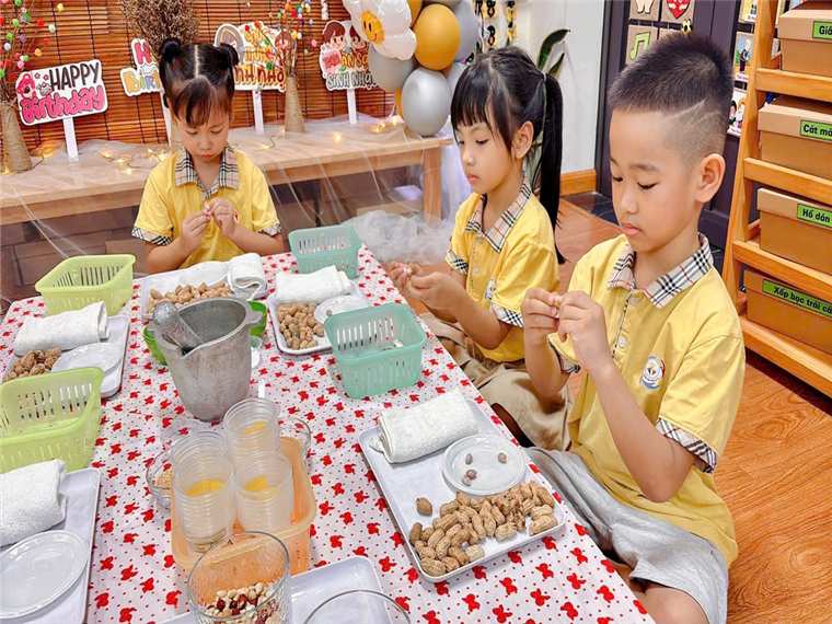 Nhằm giới thiệu đến cho trẻ nhiều món ăn phong phú, hấp dẫn nhưng vẫn đảm bảo dinh dưỡng. Muối vừng lạc là một món muối chấm vô cùng thơm ngon và hấp dẫn với vị bùi, thơm của đậu phộng cùng với vị mặn vừa ăn. Đây là món ngon khi kết hợp ăn cùng với các món như: xôi, cơm trắng, bánh khoai mì hấp ... Các con trải nghiệm làm “Muối vừng” từ bóc vỏ lạc, xát sạch vỏ lạc sau khi rang đến giã lạc và trộn muối vừng ... tuy vẫn còn vụng về nhưng các con vô cùng thích thú và hào hứng.