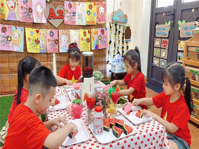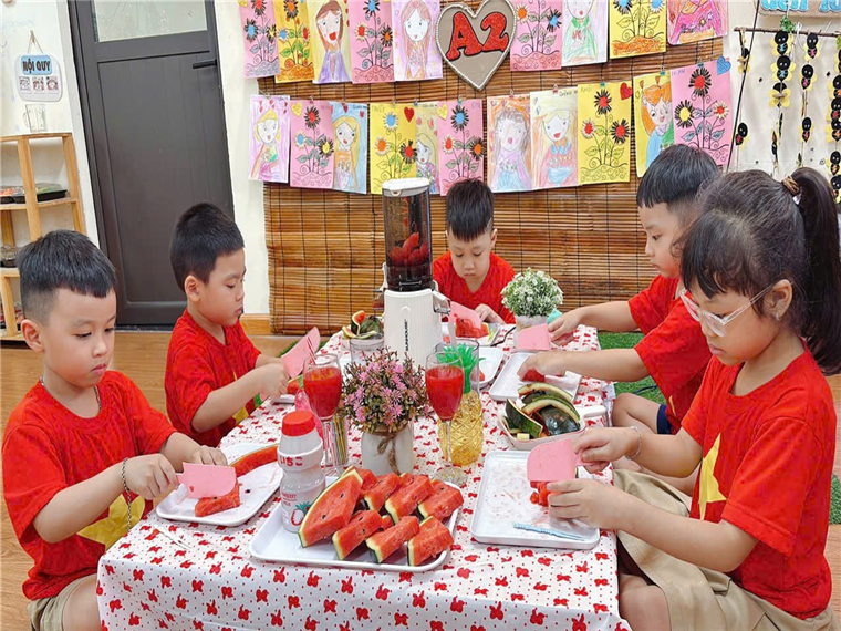 Các loại nước ép chứa khá nhiều các loại vitamin và khoáng chất, có thể giúp tăng cường hệ miễn dịch của trẻ và giúp hấp thu sắt trong cơ thể. Nước ép dưa hấu là một thức uống được rất nhiều người ưa thích đặc biệt là trẻ nhỏ. Hoạt động trải nghiệm “Làm nước ép dưa hấu”, một thức uống vô cùng hấp dẫn. Nước ép dưa hấu có cách chế biến khá đơn giản. Dưới sự chuẩn bị chu đáo của BPH lớp và cách hướng dẫn của cô giáo, các con đã tự tay làm cho mình những cốc nước ép bổ dưỡng và đẹp mắt. Và… Còn gì tuyệt vời hơn là thưởng thức thành quả của mình…. Các con vừa trò chuyện vừa cùng nhau uống một cách ngon lành và thích thú.