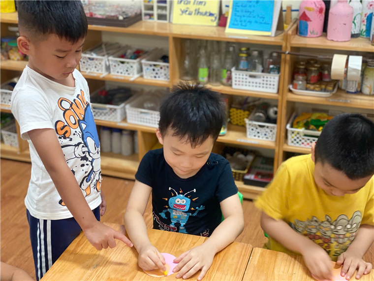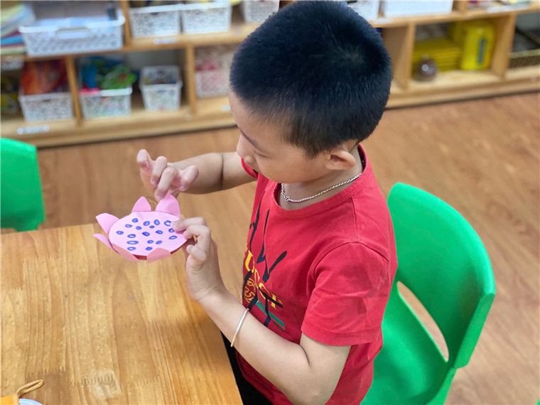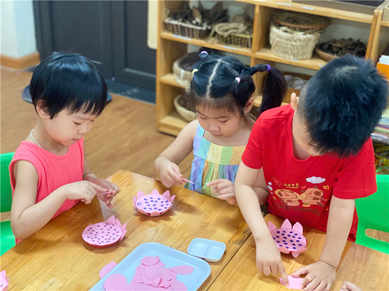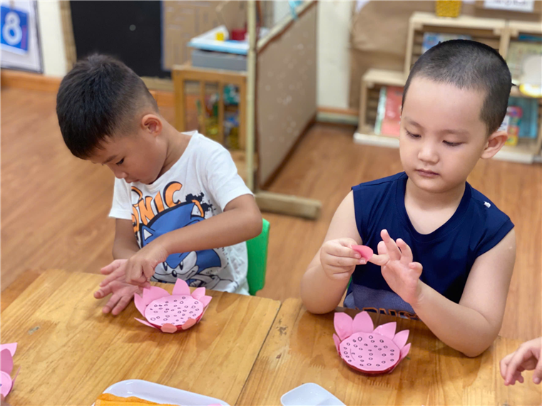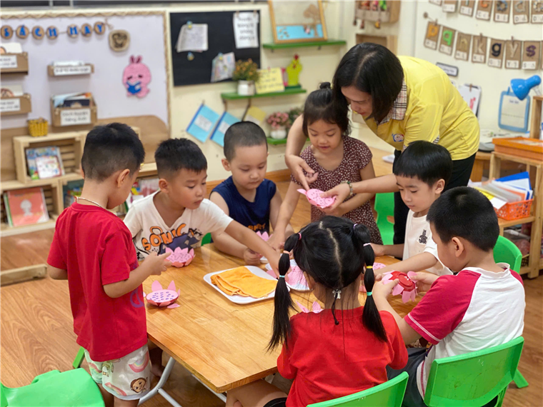 Hiểu được ý nghĩa của hoa sen, các cô còn cho trẻ biết được hình ảnh hoa sen gắn liền với Bác Hồ- Vị lãnh tụ vĩ đại của dân tộc Việt Nam. Từ đó các cô xây dựng hoạt động “ Tạo hình hoa sen” cho trẻ thực hiện. Trẻ vô cùng hào hứng, chăm chú thực hiện tạo ra được những bông sen nở xòe với màu hồng rực rỡ như nở trong nắng.