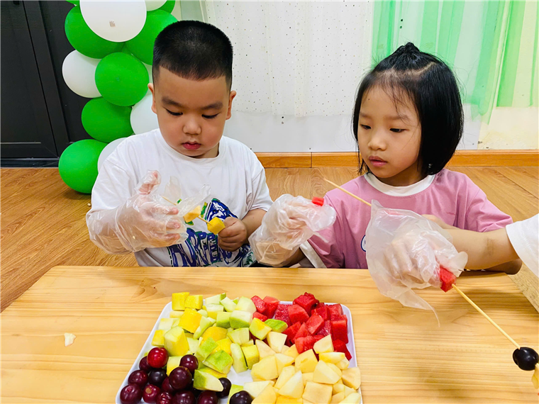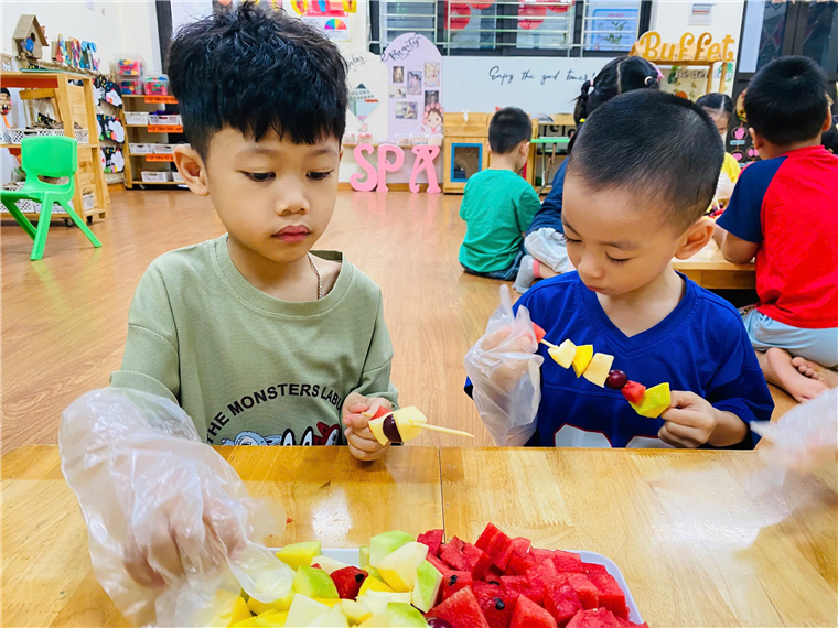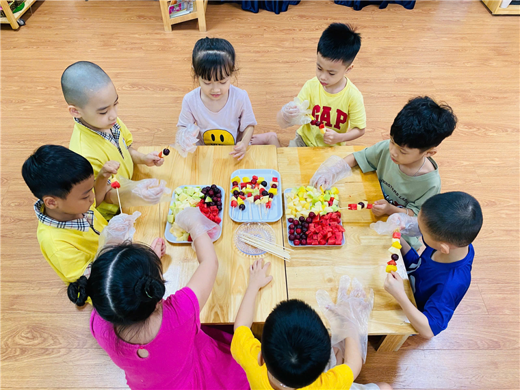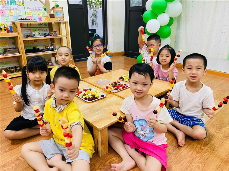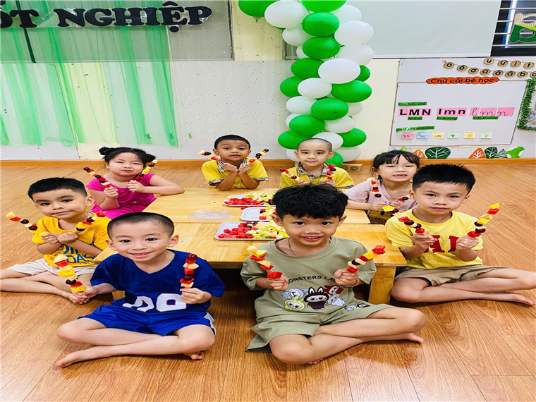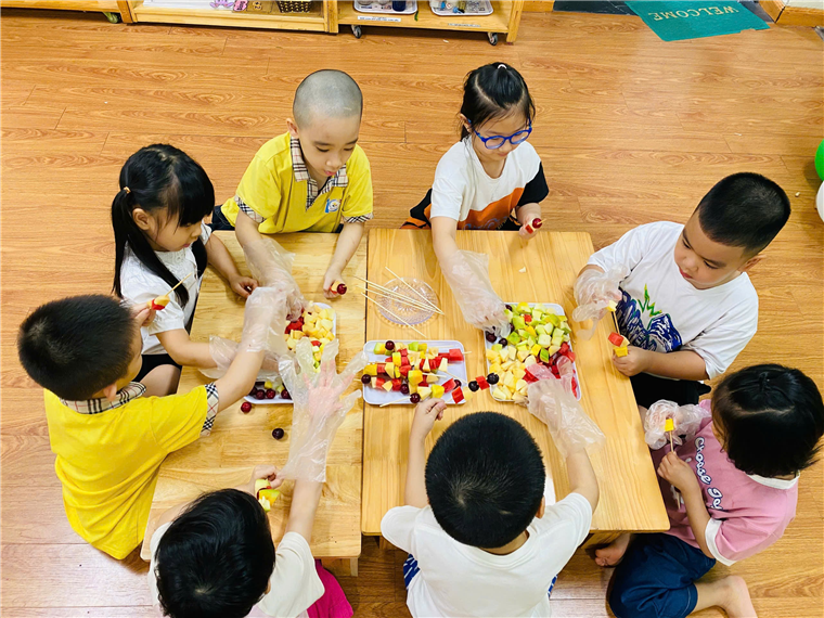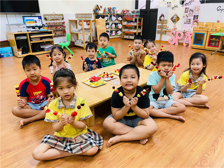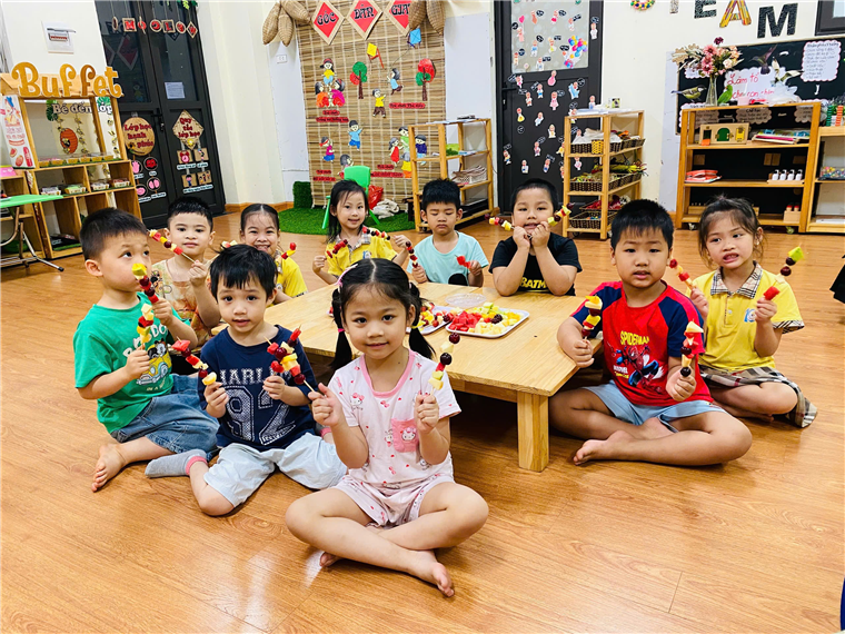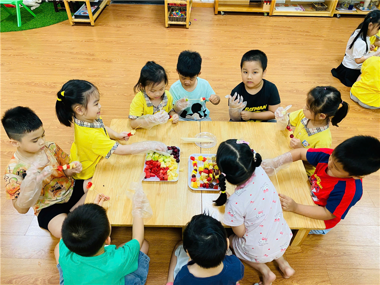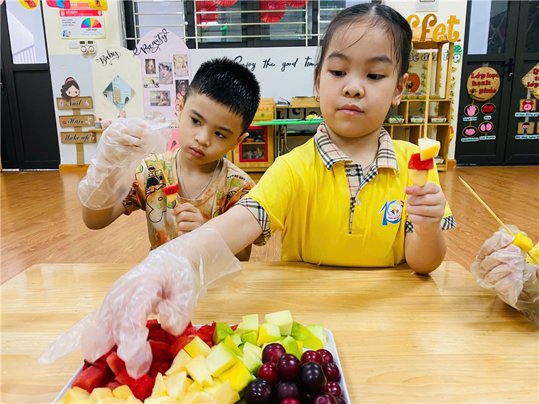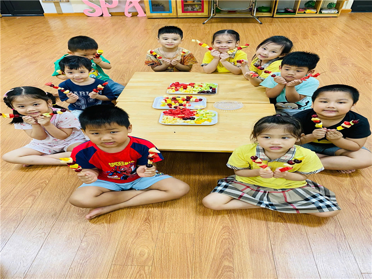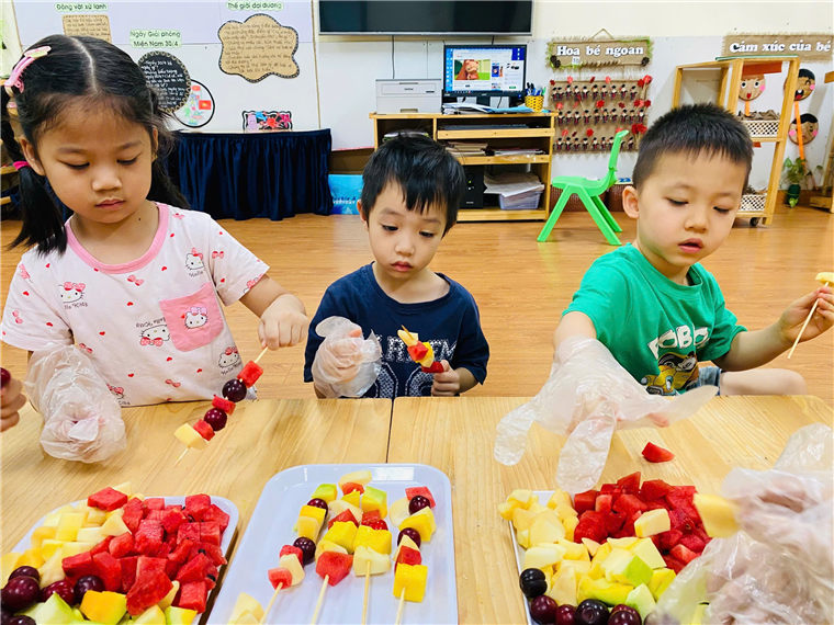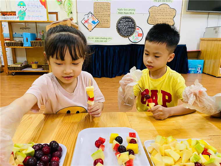 Thông qua hoạt động trải nghiệm này, các con được thể hiện sự khéo léo của đôi bàn tay, phối hợp nhịp nhàng tay mắt mà còn luyện cho bé tính kiên trì, tỉ mỉ tạo cho mình những xiên hoa quả thật đẹp mắt, và còn được học bài toán “sắp xếp theo quy tắc”. Ở đây trẻ được trải nghiệm, tự mình khám phá. Bên cạnh đó, trẻ còn gì thích thú hơn khi cùng vui vẻ bên nhau thưởng thức vị ngon ngọt của trái cây và được thưởng thức thành quả của mình tự làm ra.