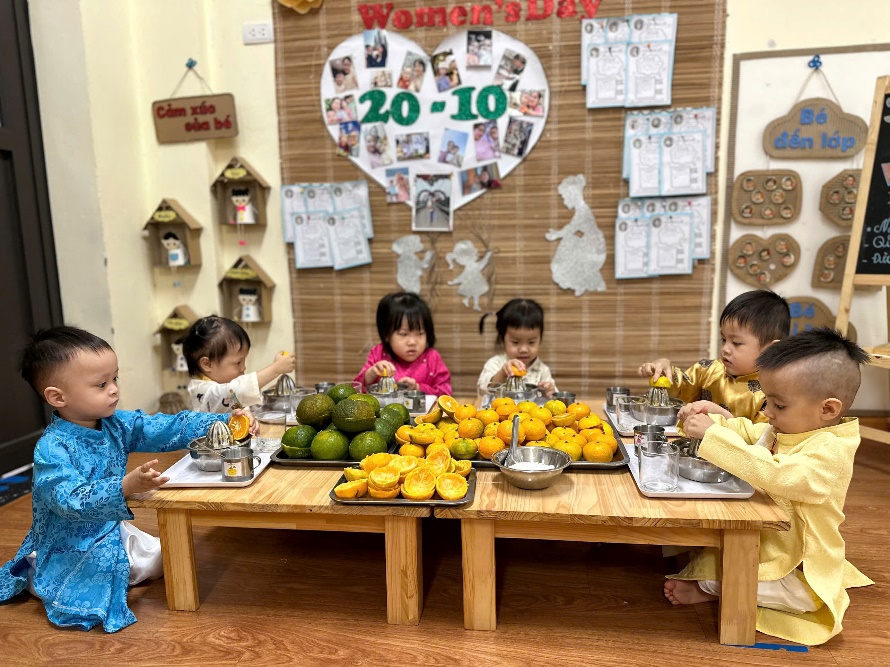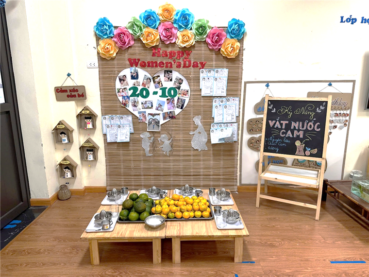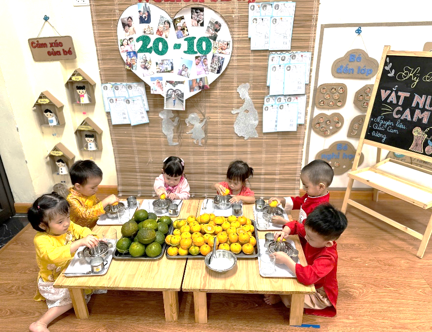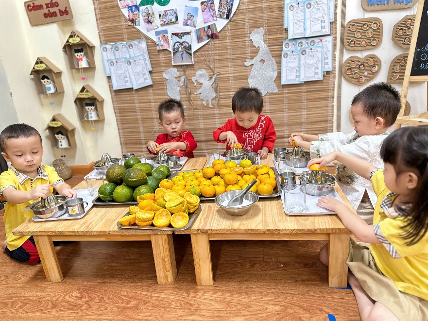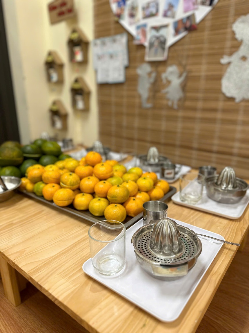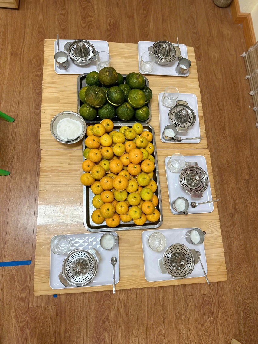 Góc chuẩn bị kỹ năng vắt nước cam các cô chuẩn bị cho các bé