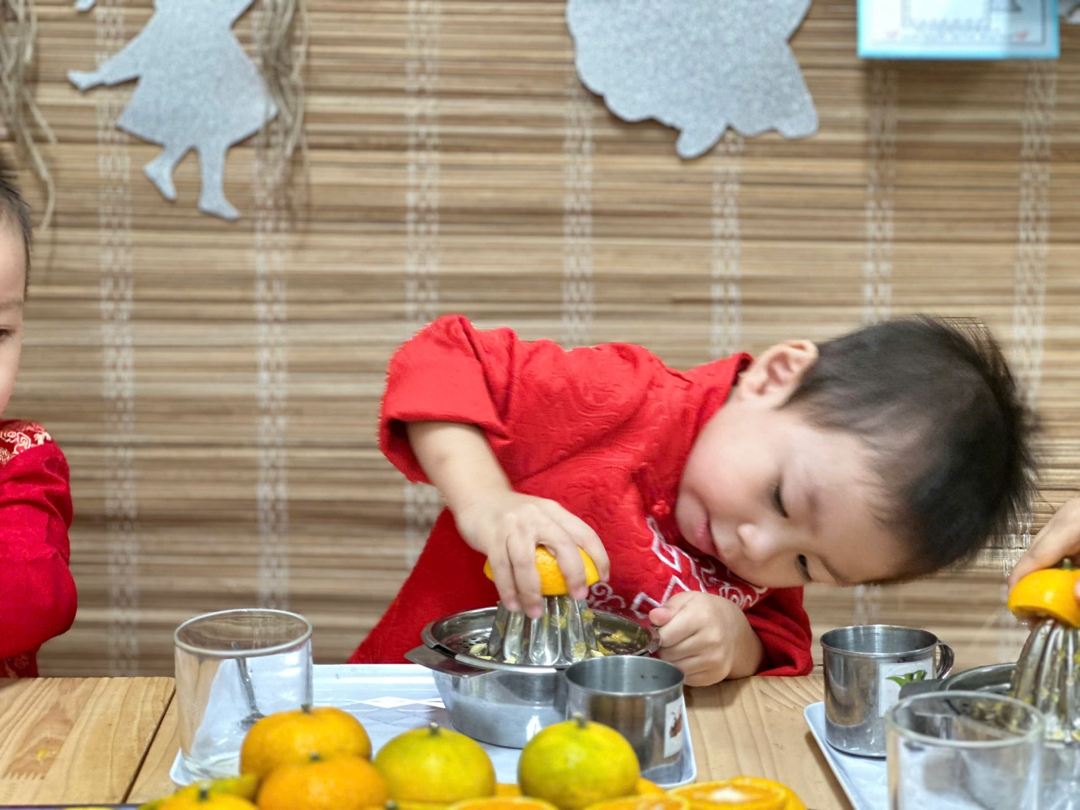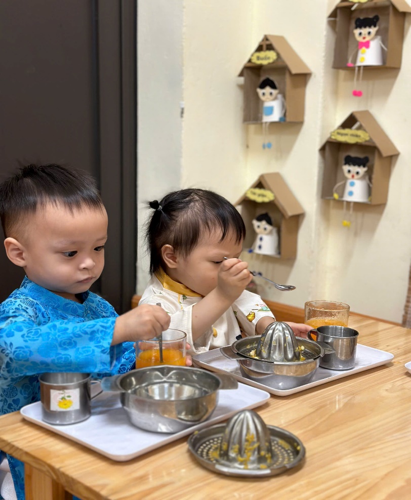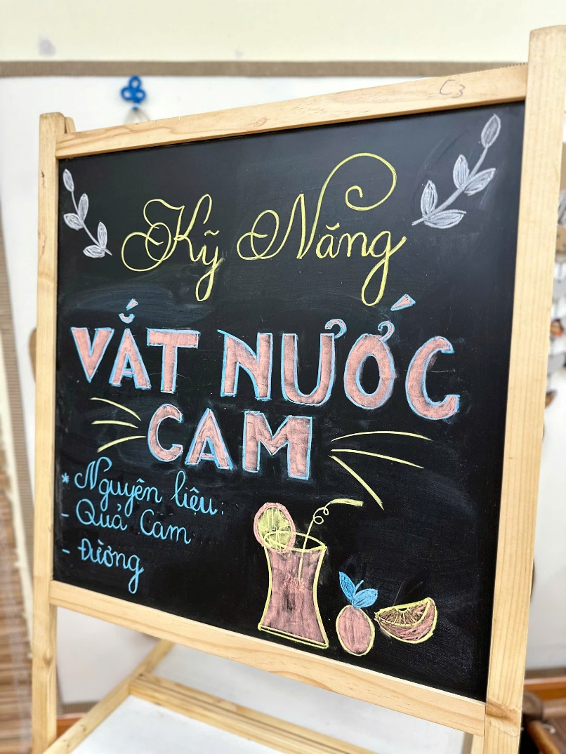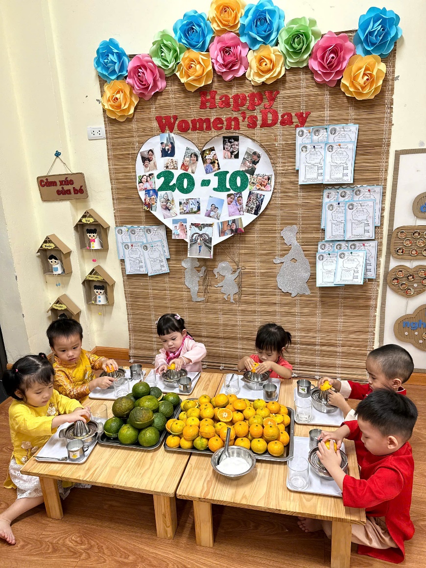 Góc chuẩn bị kỹ năng vắt nước cam các cô chuẩn bị cho các bé