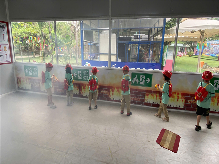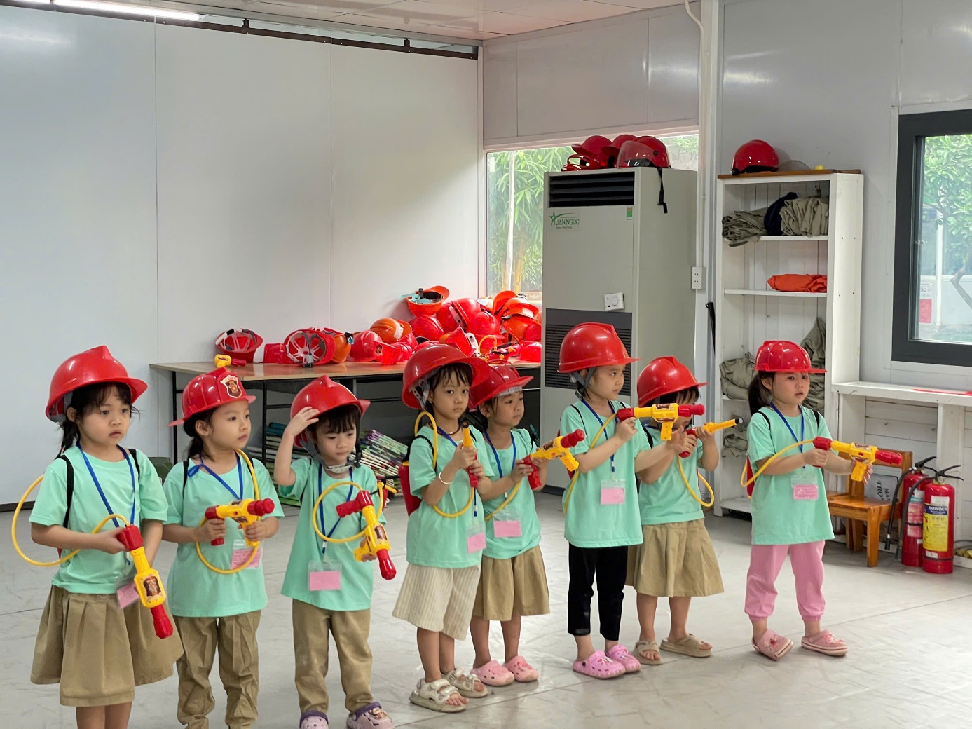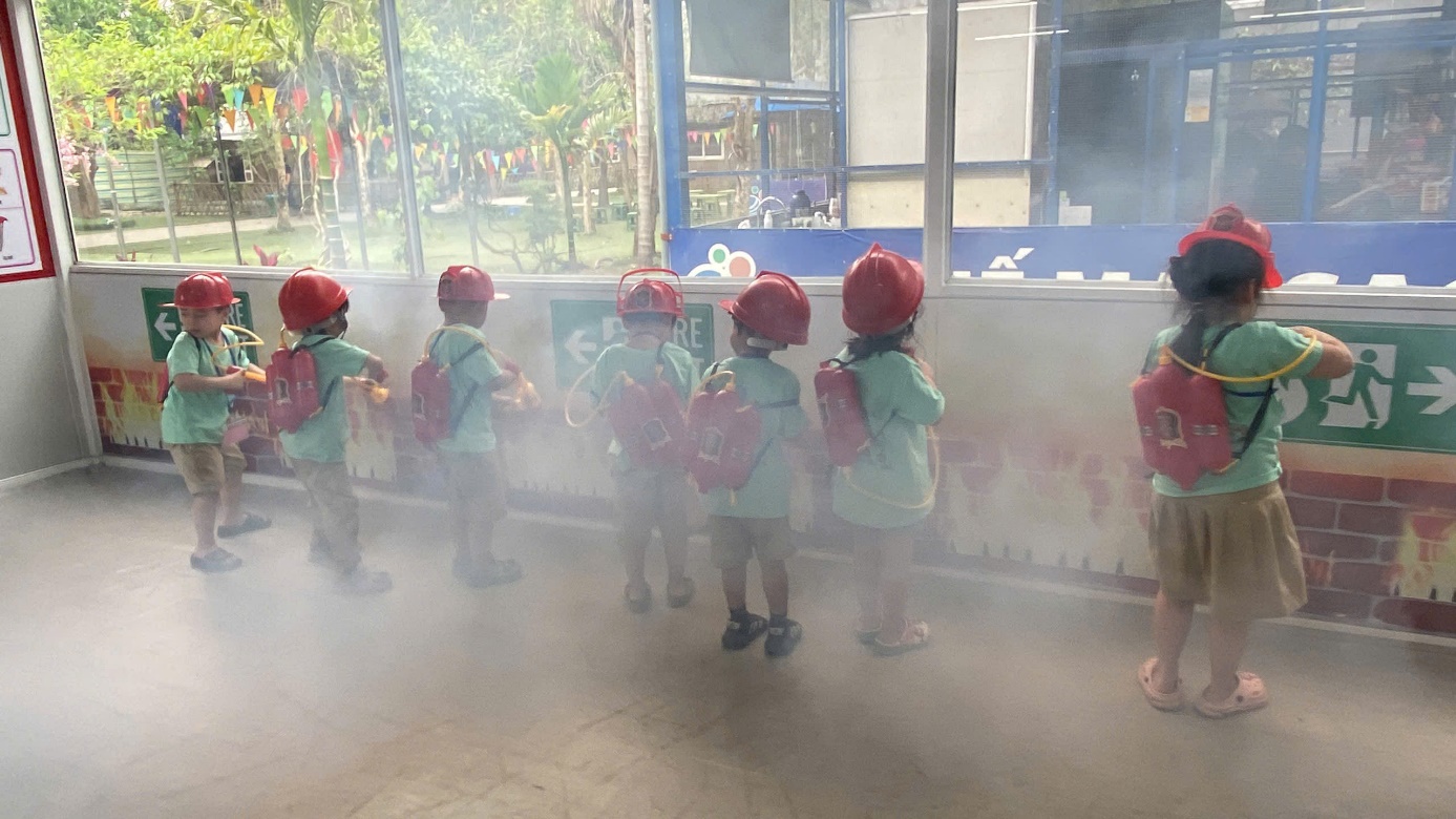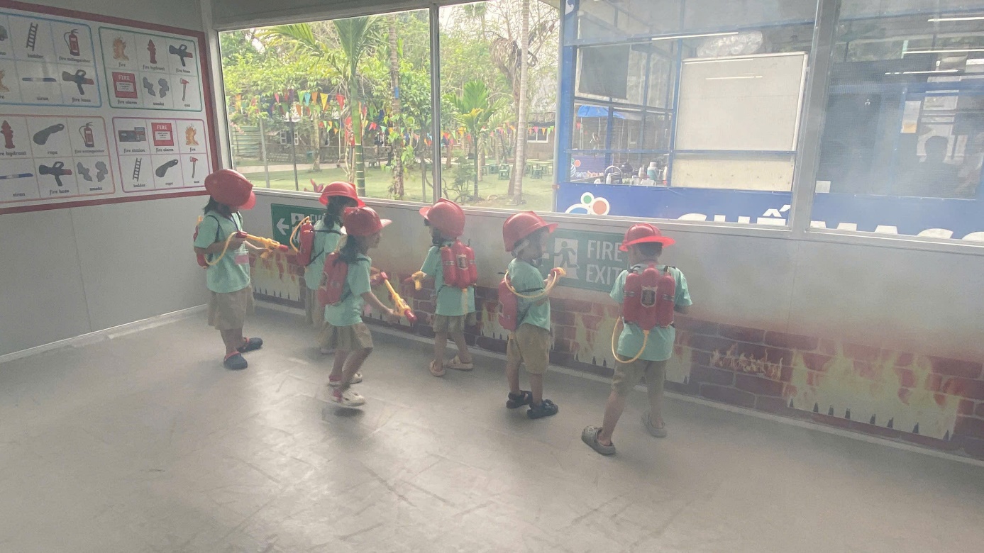 Ảnh: Các con đóng vai lính cứu hoả.