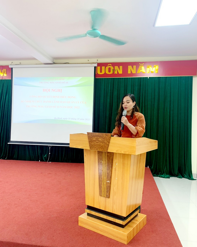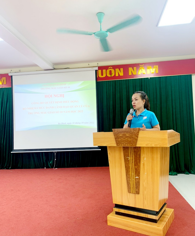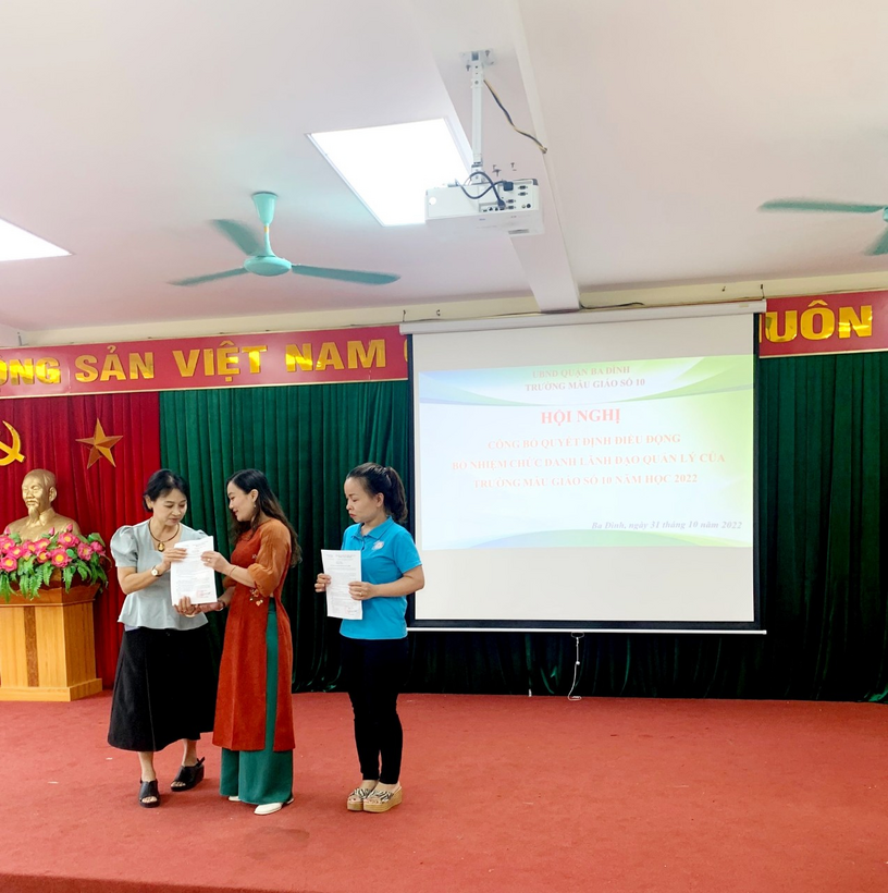 Tại Hội nghị, Bà Trần Thị Mai Anh – Bí thư chi bộ - Hiệu trưởng trường Mẫu giáo Số 10 đã công bố Quyết định về công tác cán bộ của UBND quận Ba Đình đối với đ/c Phạm Thị Phương là giáo viên của trường được điều động và bổ nhiệm chức vụ Phó Hiệu trưởng trường MN Hoa Hướng Dương và đồng chí Dương Thu Giang giáo viên trường Mẫu giáo Số 7 được điều động và bổ nhiệm giữ chức Phó Hiệu trưởng trường Mẫu giáo Số 10. Đây là 1 quyết định đúng đắn của UBND Quận Ba Đình nhằm bổ sung lực lượng nguồn và điều hòa chất lượng giữa các trường Mầm non trong quận.