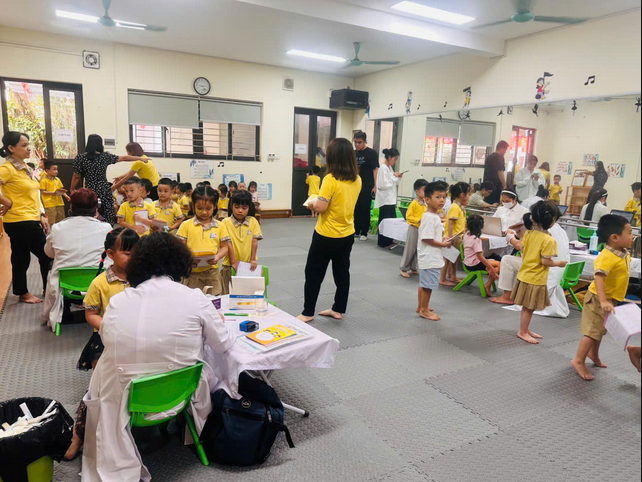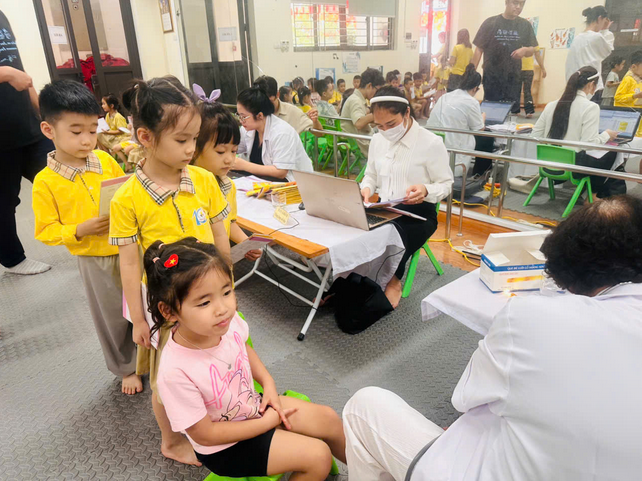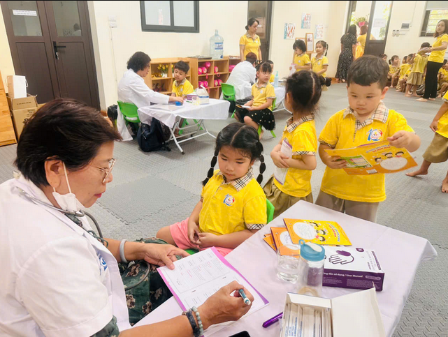 Buổi khám sức khỏe được thực hiện bởi đội ngũ y tế đến từ Phòng khám đa khoa quốc tế Việt Nga. Các con được bác sĩ kiểm tra tổng quát về tình trạng sức khỏe và những thông tin sẽ được lưu lại để giáo viên và phụ huynh tiện theo dõi quá trình phát triển thể chất của các con trong suốt năm học.