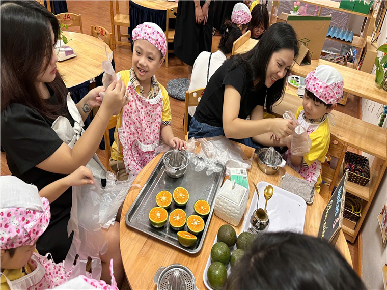 Các con đang chuẩn bị vắt cam để mời mọi người uống ạ!