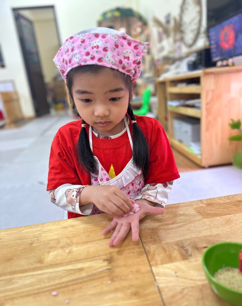Buổi trải nghiệm được thiết kế như một không gian văn hóa thu nhỏ, nơi các con được hóa thân thành những “nghệ nhân nhí”.. Dưới sự hướng dẫn tận tình của các cô giáo, các con được tự tay làm những chiếc bánh trôi.  Từ việc nhào bột, viên tròn từng viên bánh, đến thả bánh vào nồi nước sôi, mỗi bé đều trải qua từng bước làm bánh với ánh mắt ngây thơ đầy háo hức, món bánh không thể thiếu trong ngày Tết Hàn Thực. Dù đôi khi những viên bánh không được tròn trịa, nhưng đối với các con, đó chính là niềm tự hào khi được tự mình làm ra, từng bước một các con đều rất hào hứng và tỉ mỉ. Những đôi tay nhỏ bé, vụng về nhưng lại chứa đựng cả sự nỗ lực và niềm vui trẻ thơ.
