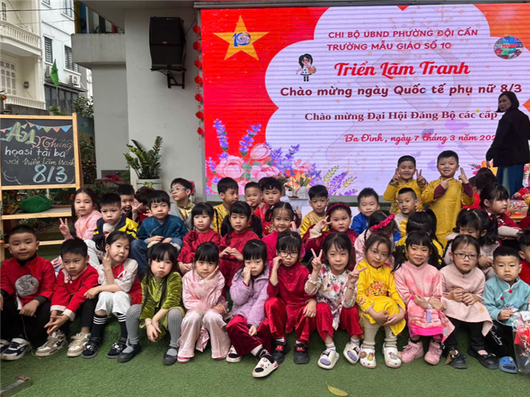 Để kỷ niệm ngày Quốc tế phụ nữ 8/3 và chào mừng đại hội đảng bộ Phường Đội Cấn, sáng ngày mùng 7/3 trường mẫu giáo số 10 tổ chức ngày hội sáng tác tranh tại sân trường. Cô và các bé lớp A1 tham gia cuộc thi với một tâm thế đầy hào hứng, phấn khởi. Đây là sân chơi bổ ích giúp các bé thỏa sức sáng tạo, thể hiện thế giới quan đầy màu sắc qua những nét vẽ hồn nhiên, các bé đã mang đến nhiều tác phẩm ấn tượng, từ cảnh thiên nhiên tươi đẹp, gia đình hạnh phúc đến những ước mơ ngộ nghĩnh về tương lai. Với hai bức tranh có nội dung về trẻ thơ và thủ đô Hà Nội là: “Tuổi thơ bên sắc hoa và khoảnh khắc giao thừa” các bé lớp A1 đã cùng cô xé dán, in màu, chắp tranh, cũng vẽ rất đẹp và sáng tạo. Mỗi bức tranh đều toát lên sự ngây thơ, trong trẻo và chứa đựng nhiều ý nghĩa sâu sắc.