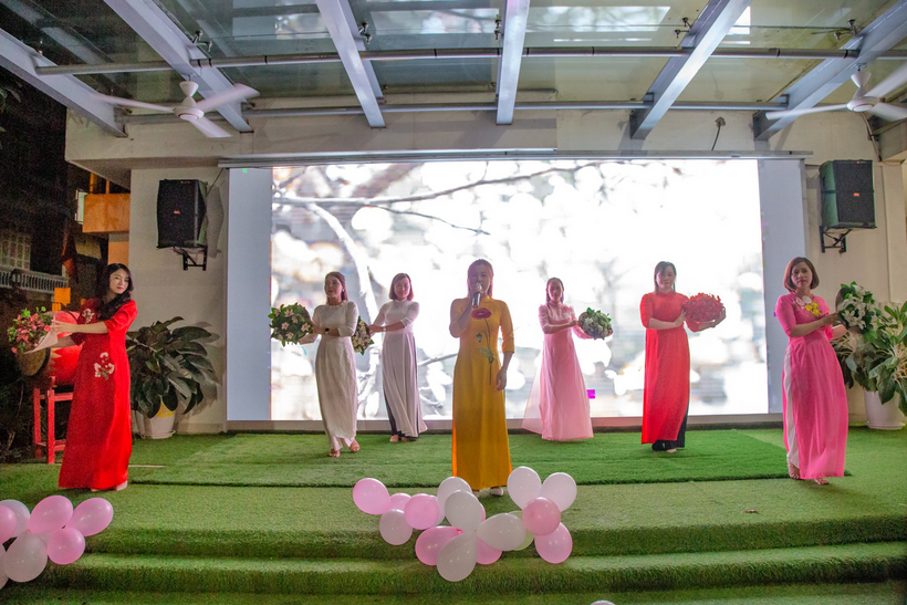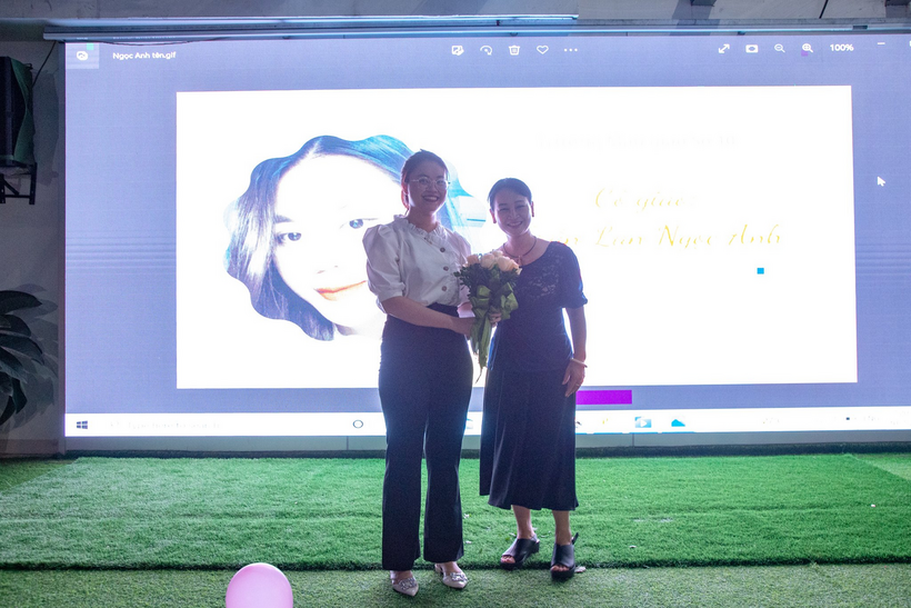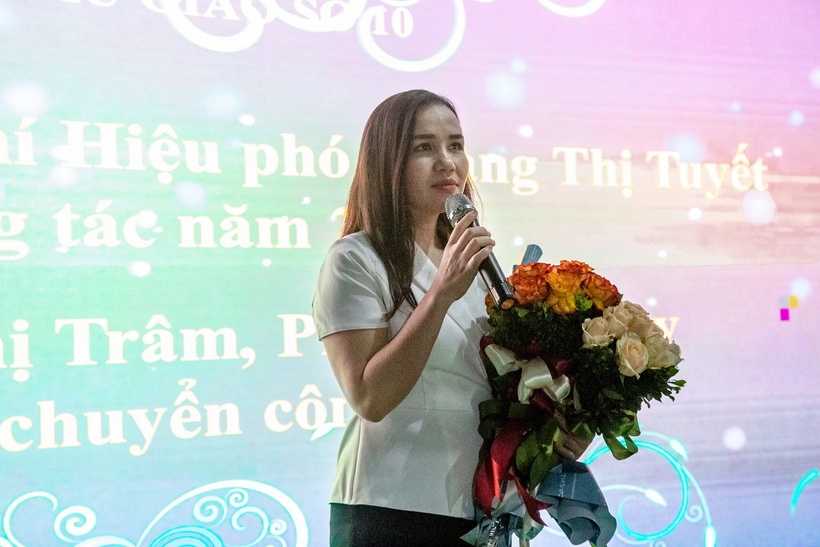 Cũng trong buổi Gala, Công đoàn và Nhà trường cũng có bó hoa tươi thắm và món quà chia tay, chúc mừng 2 đ/c nhân viên nấu ăn là Trần Thị Trâm và Phạm Thị Thủy xin chuyển công tác sau gần 15 năm gắn bó với nhà trường.