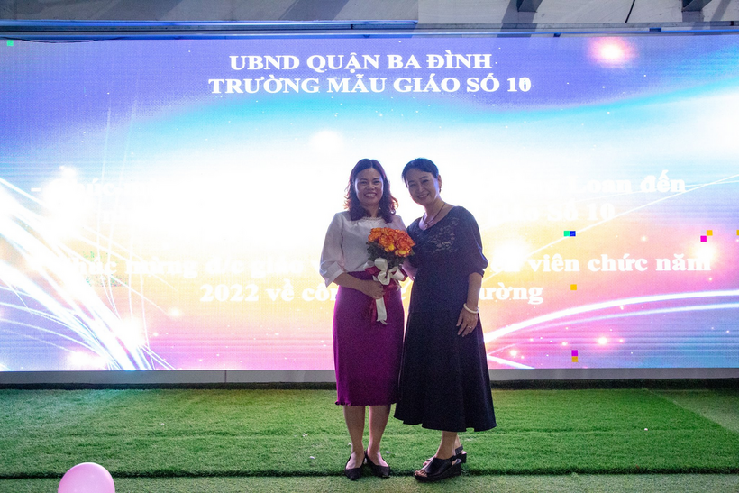 Lưu luyến chia tay các đồng chí chuyển công tác, phấn khởi chúc mừng đ/c Trần Thị Hồng Loan được bổ nhiệm làm Phó hiệu trưởng trường Mẫu giáo Số 10, và đón giáo viên trúng tuyển viên chức năm 2022 là đ/c Trần Lan Ngọc Anh là thành viên mới của hội đồng nhà trường. Phát biểu trong buổi gala, đ/c Trần Thị Mai Anh – Bí thư Chi bộ, Hiệu trưởng nhà trường đã chúc mừng 2 đ/c CBQL và viên chức mới, đồng thời mong muốn tất cả cán bộ giáo viên nhân viên trường Mẫu giáo Số 10 hãy cùng nhau xây dựng trường MG Số 10 thành ngôi nhà chung đoàn kết một lòng, phấn đấu hoàn thành xuất sắc nhiệm vụ, nhà trường được tặng Bằng khen của thủ tướng Chính phủ năm học 2022 – 2023.