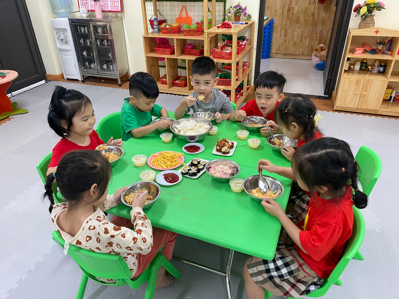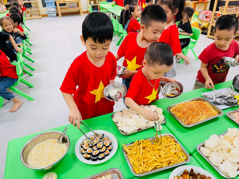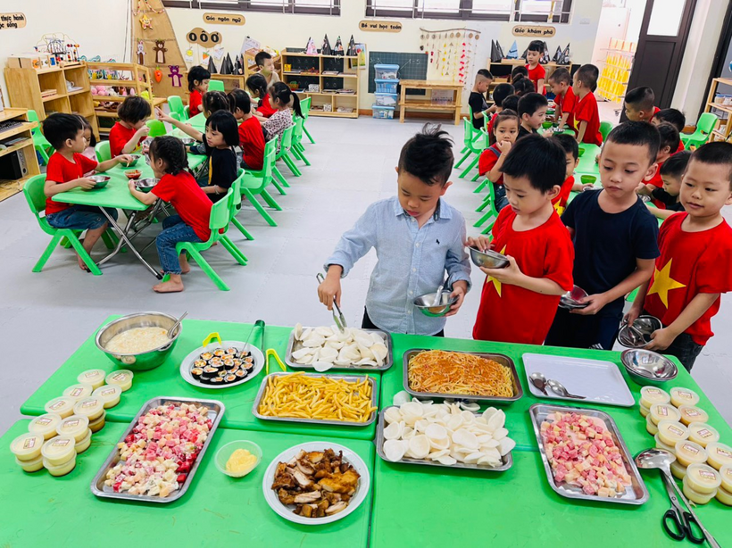 Kết thúc lễ hội tại sân trường trẻ trở về lớp để dự bữa tiệc bufe Halloween với các món ăn ngon và thú vị: Cơm cuộn rong biển, mỳ spaghety, xalat củ quả, khoai tây chiên, phồng tôm chiên, thịt xiên nướng, cháo thịt bí đỏ, kem caramen do chính bàn tay của các bác đầu bếp trường mẫu giáo Số 10 chế biến.