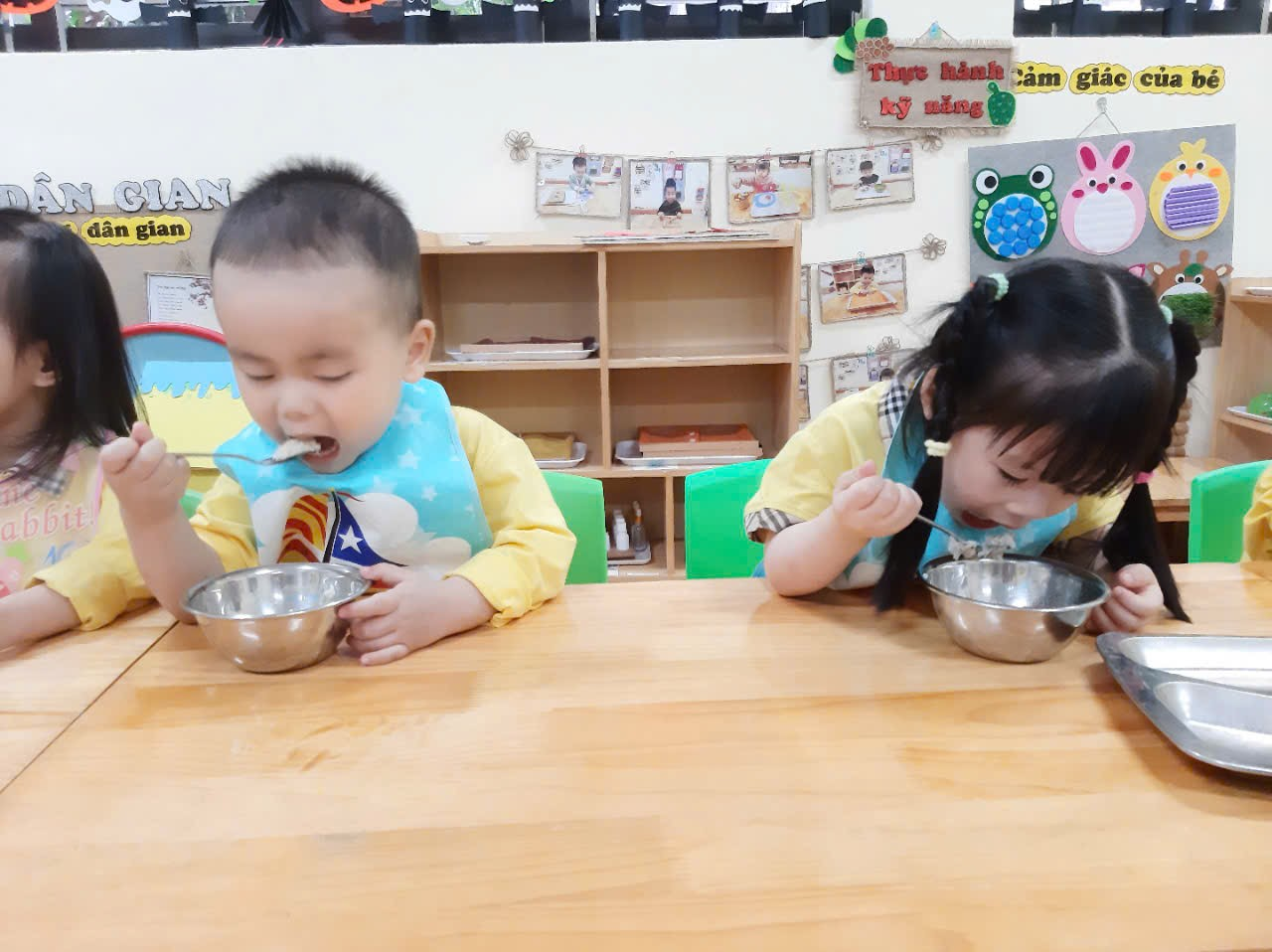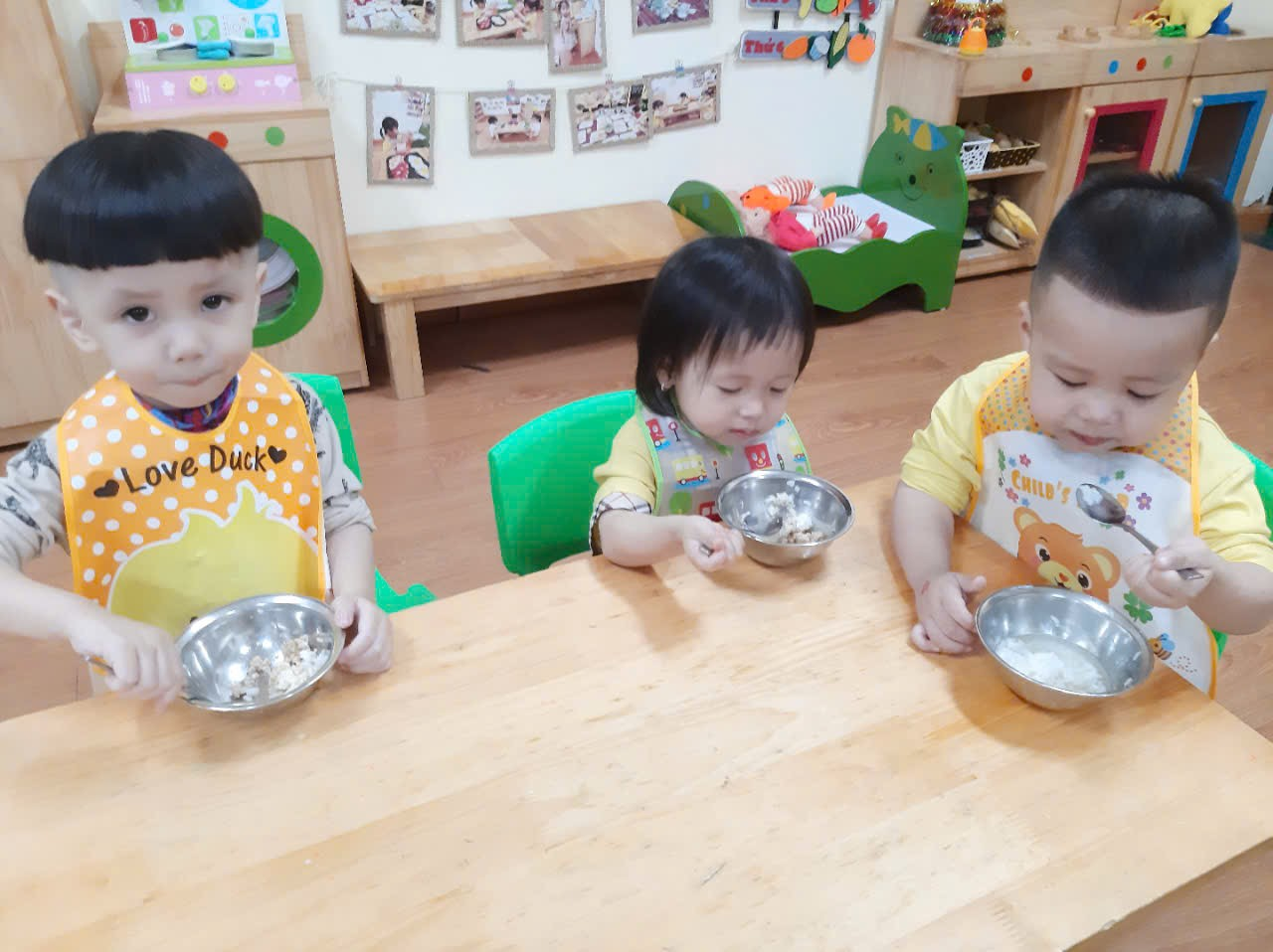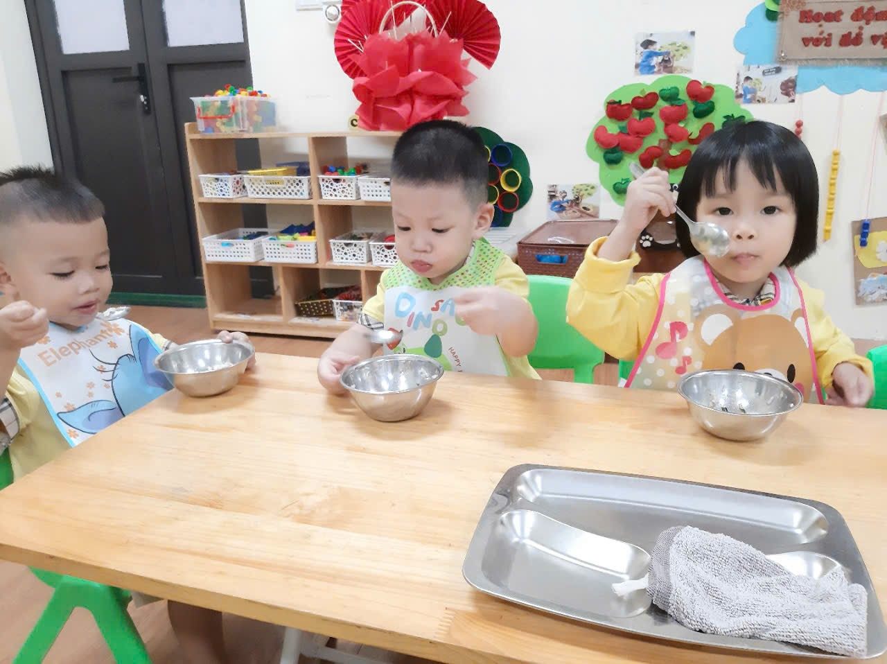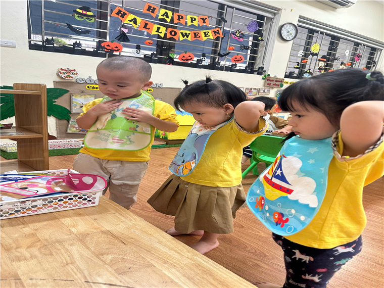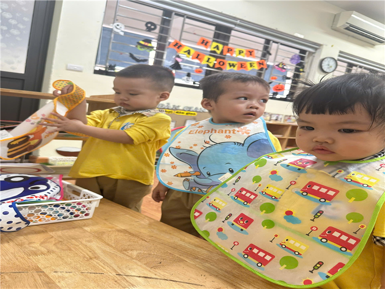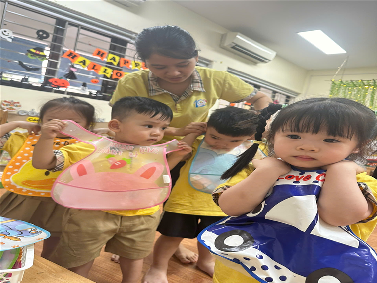 Trước khi ăn cô cho trẻ đi vệ sinh rửa tay và đeo yếm rồi ngồi vào bàn. Trên bàn các cô chuẩn bị 1 đĩa đựng khăn lau tay, 1 đĩa để cơm