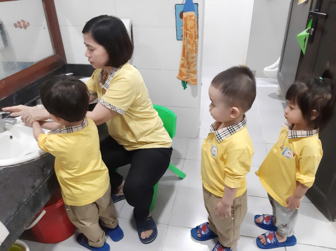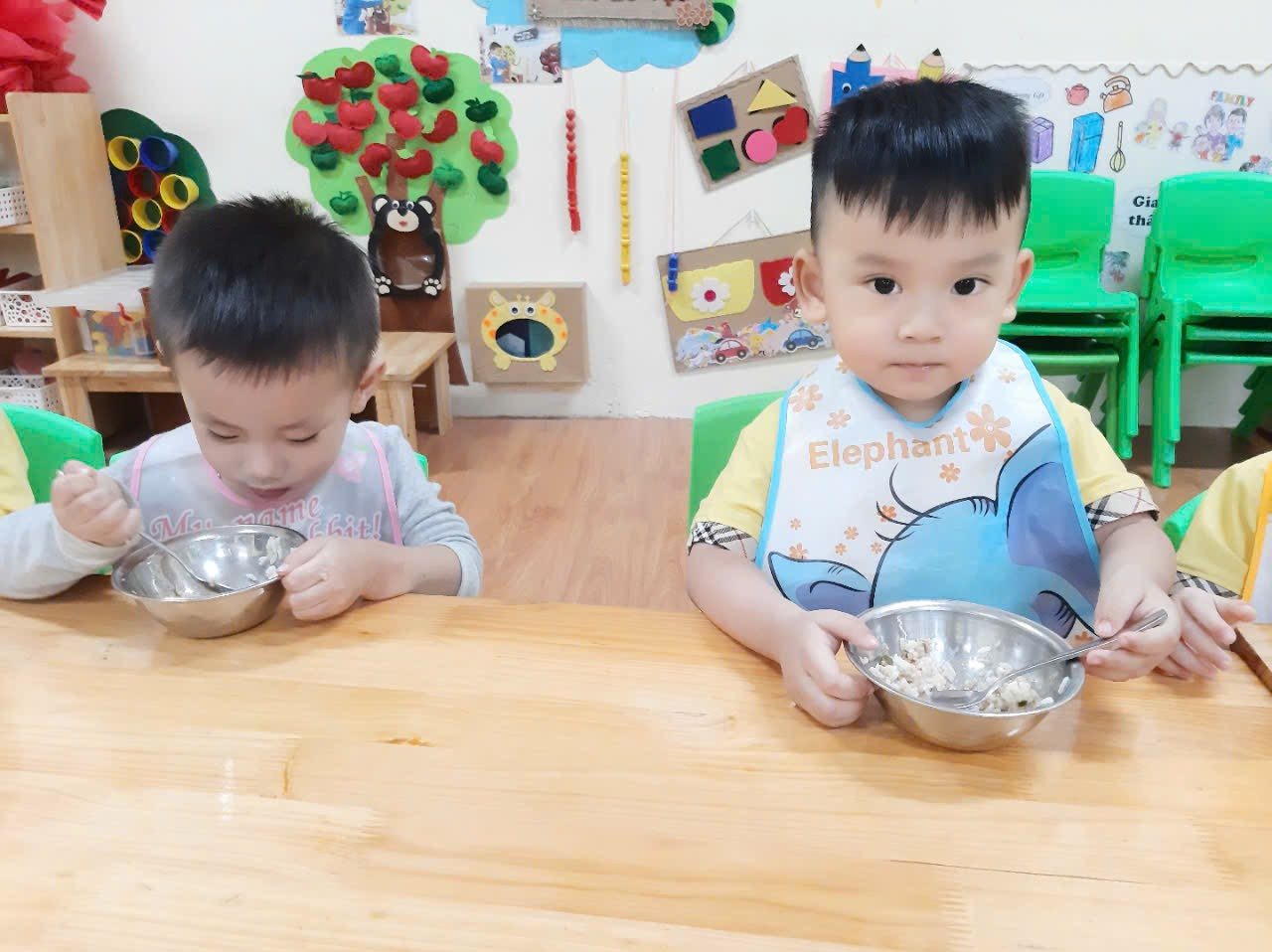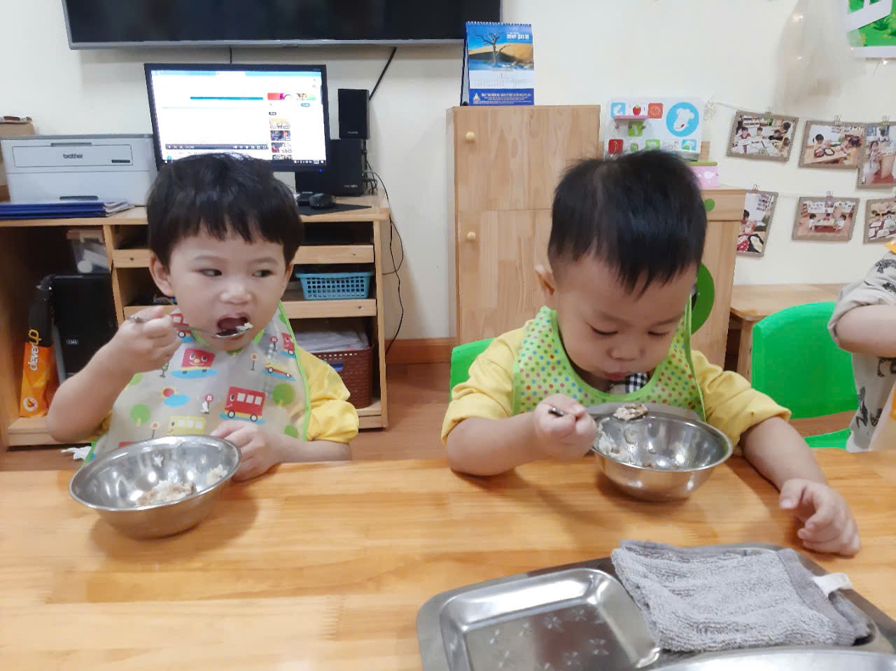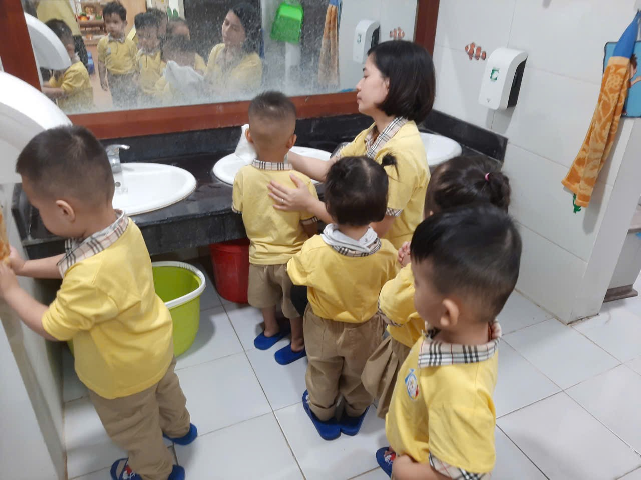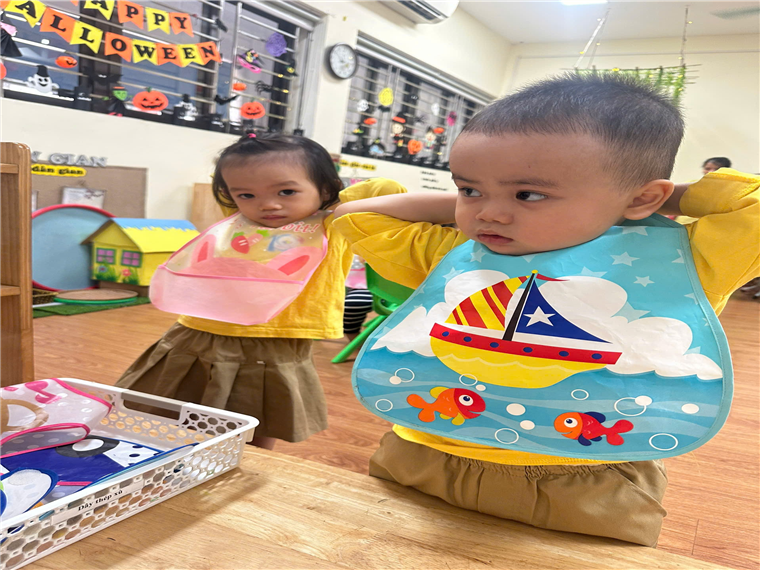 Trước khi ăn cô cho trẻ đi vệ sinh rửa tay và đeo yếm rồi ngồi vào bàn. Trên bàn các cô chuẩn bị 1 đĩa đựng khăn lau tay, 1 đĩa để cơm