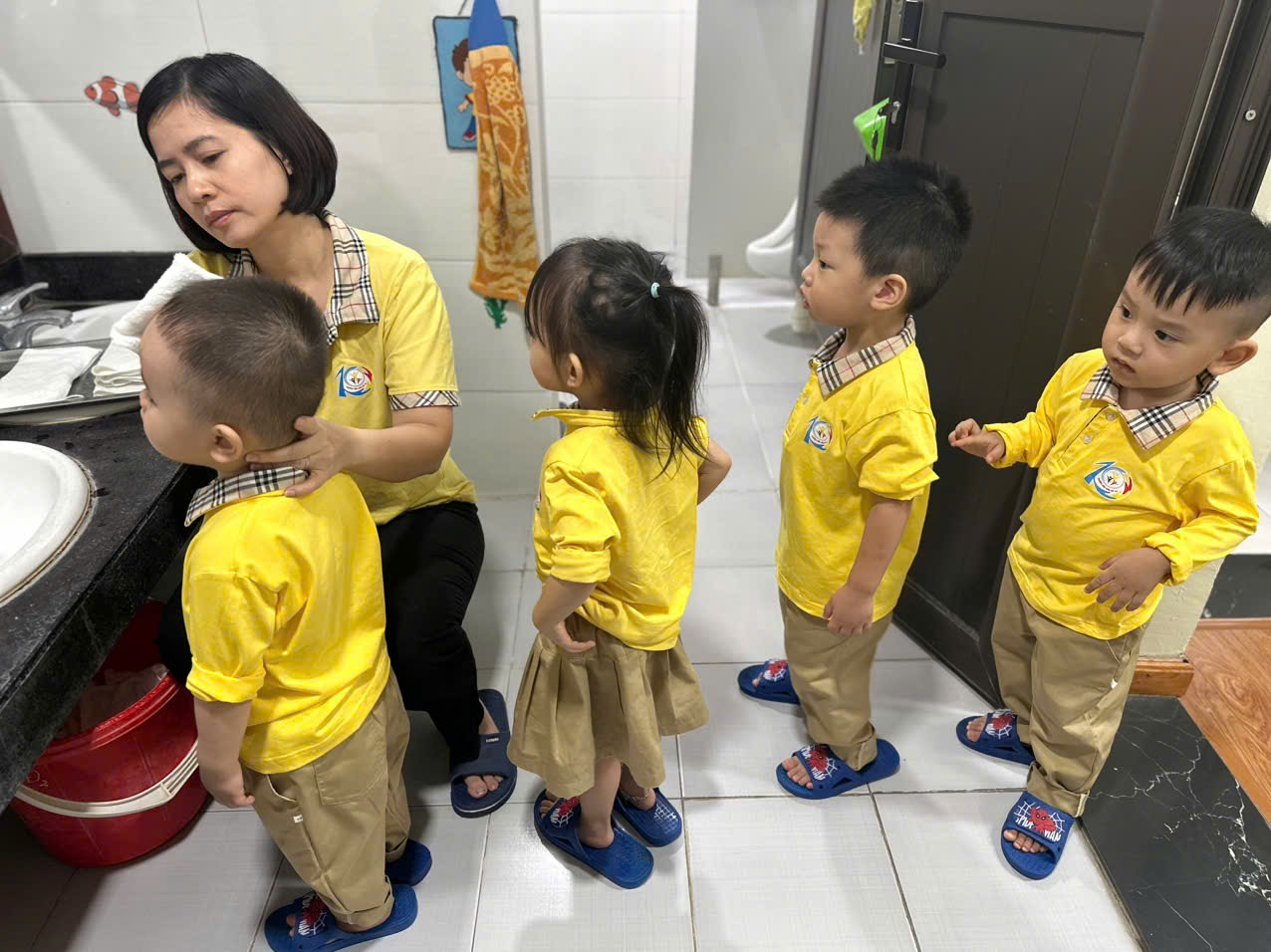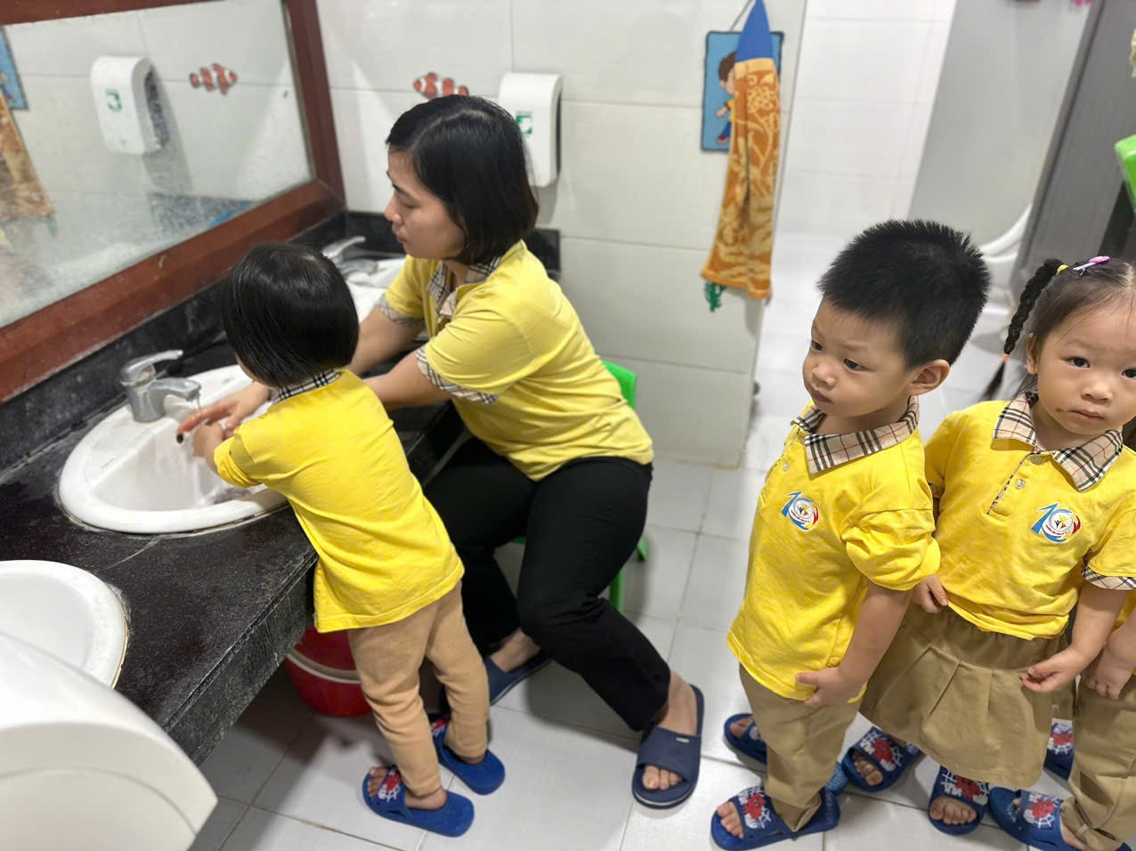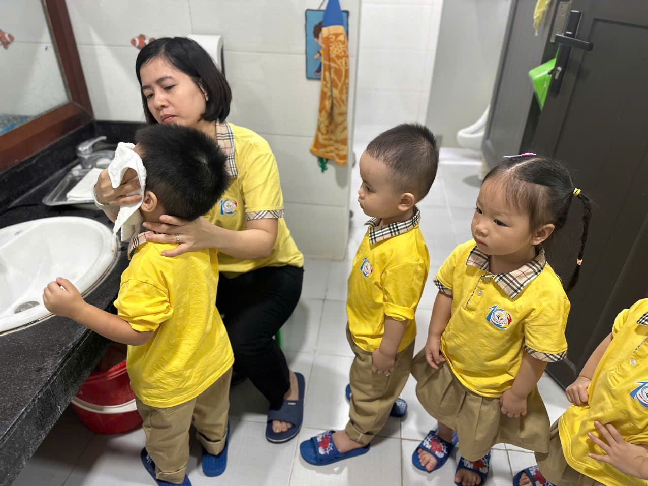 Ảnh: Trẻ xếp hàng rửa mặt, rửa tay trước khi ăn cơm