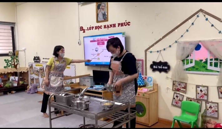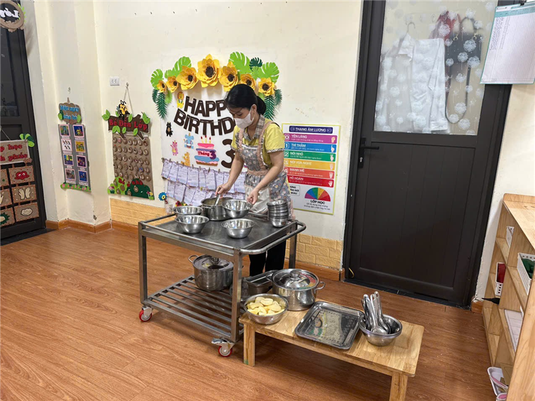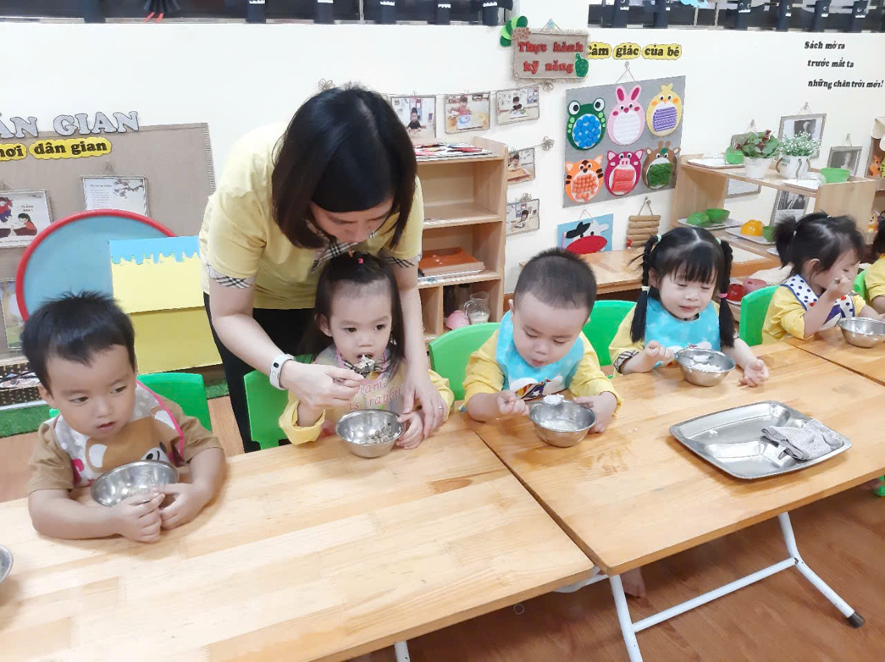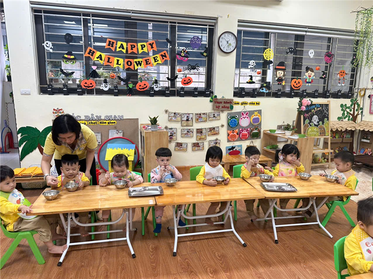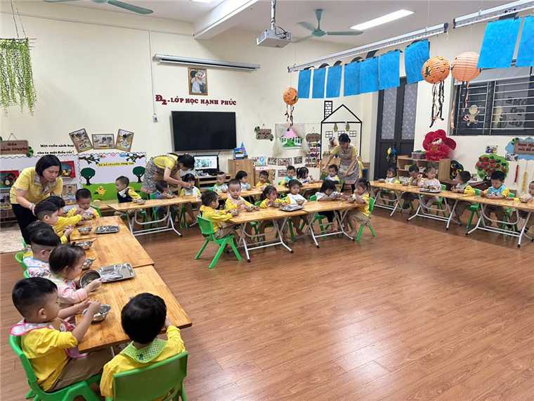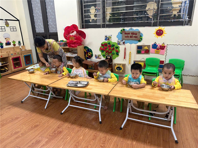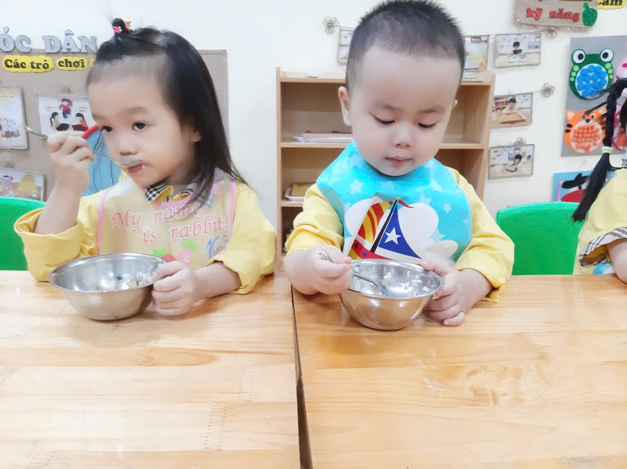 Trong khi ăn, cô chia đều cơm, thức ăn cho trẻ ra bát sau đó giới thiệu tên món ăn, giá trị dinh dưỡng của các món ăn để tạo sự ngon miệng. Động viên trẻ ăn hết xuất, bón cho trẻ mới đi học, ăn chậm, lười ăn, mới ốm dậy. tôi luôn nhắc trẻ giữ trật tự trong khi ăn, không đùa nghịch, nói chuyện to, không làm rơi vãi cơm thức ăn, muốn ho hay hắt xì thì phải lấy tay che miệng, không nhai nhồm nhoàm, không để chân lên ghế, không xúc cơm đổ sang bát bạn khác….Khuyến khích trẻ tự xúc ăn. Một số trẻ ăn hay ngậm tôi tổ chức cuộc thi ăn để tạo động lực cho các con ăn nhanh hơn. Sau khi trẻ ăn xong tôi nhắc trẻ cất ghế, bát thìa vào đúng nơi quy định, nhắc trẻ uống nước, lau miệng, đi vệ sinh, cho trẻ chơi vận động nhẹ nhàng khoảng 20 phút sau đó vào giờ đi ngủ.