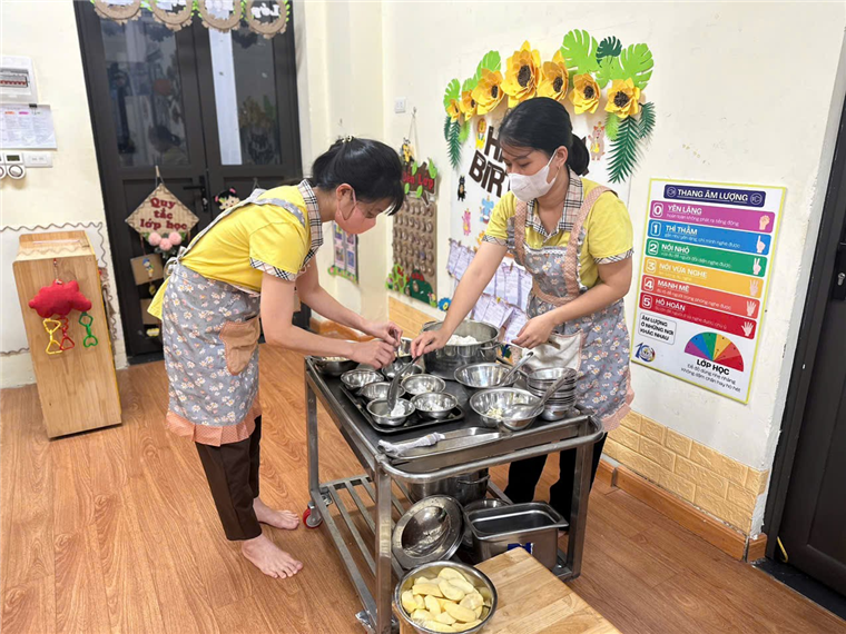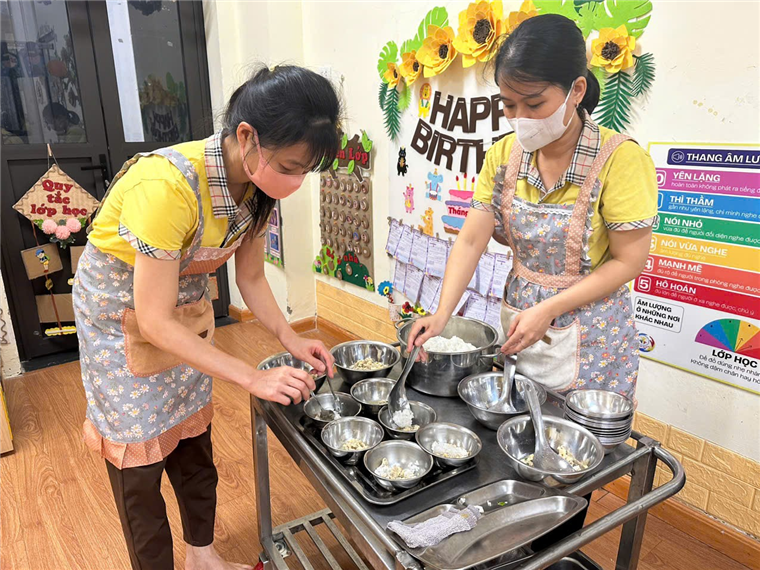 Ảnh: Cô chia thức ăn vào từng bát cho trẻ