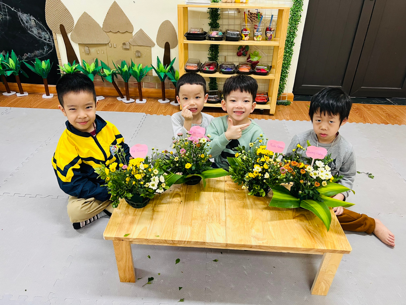 Các bé tỏa về từng nhóm, trò chuyện, trao đổi sôi nổi về ý định của nhóm mình. Bé thì chọn giỏ hoa, bé thì cắt tỉa hoa… Nhóm nào cũng thích thú và hào hứng với công việc của mình. Chỉ một lát sau những giỏ hoa xin xắn, đáng yêu được hoàn thiện. Bé nào cũng tự hào về sản phẩm do mình làm ra.