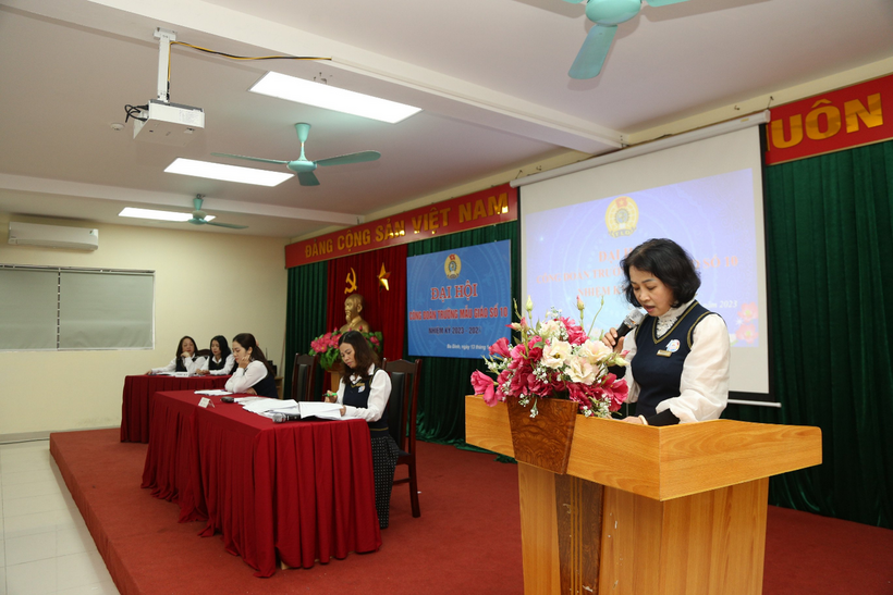 Đồng chí Trần Thị Hồng Loan thay mặt đoàn chủ tịch đã báo cáo về công tác Công đoàn nhiệm kỳ 2017-2022 và phương hướng, nhiệm vụ nhiệm kỳ 2023- 2028 trước đại hội.