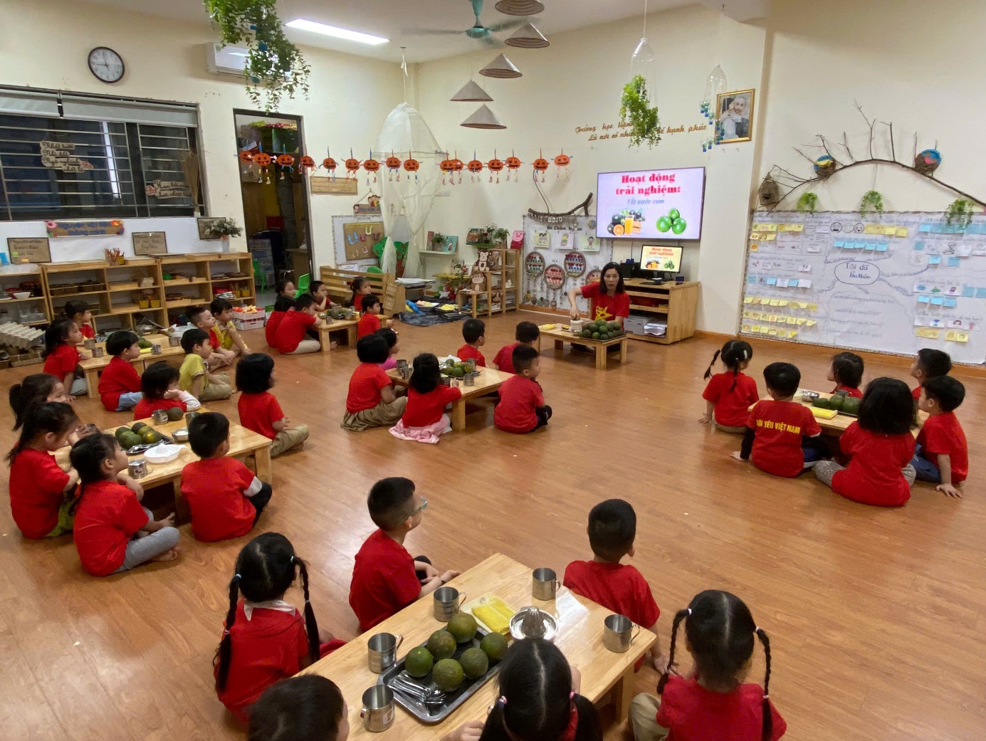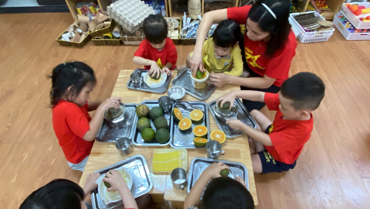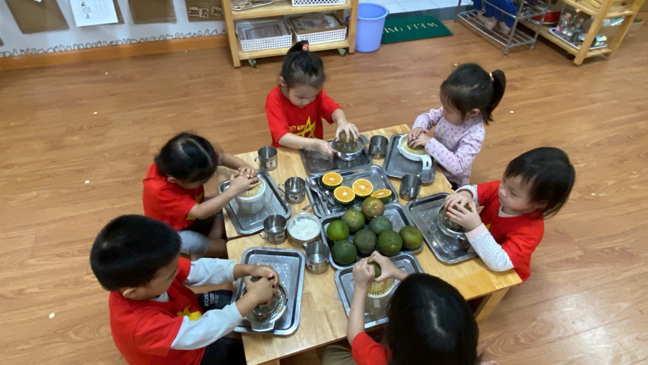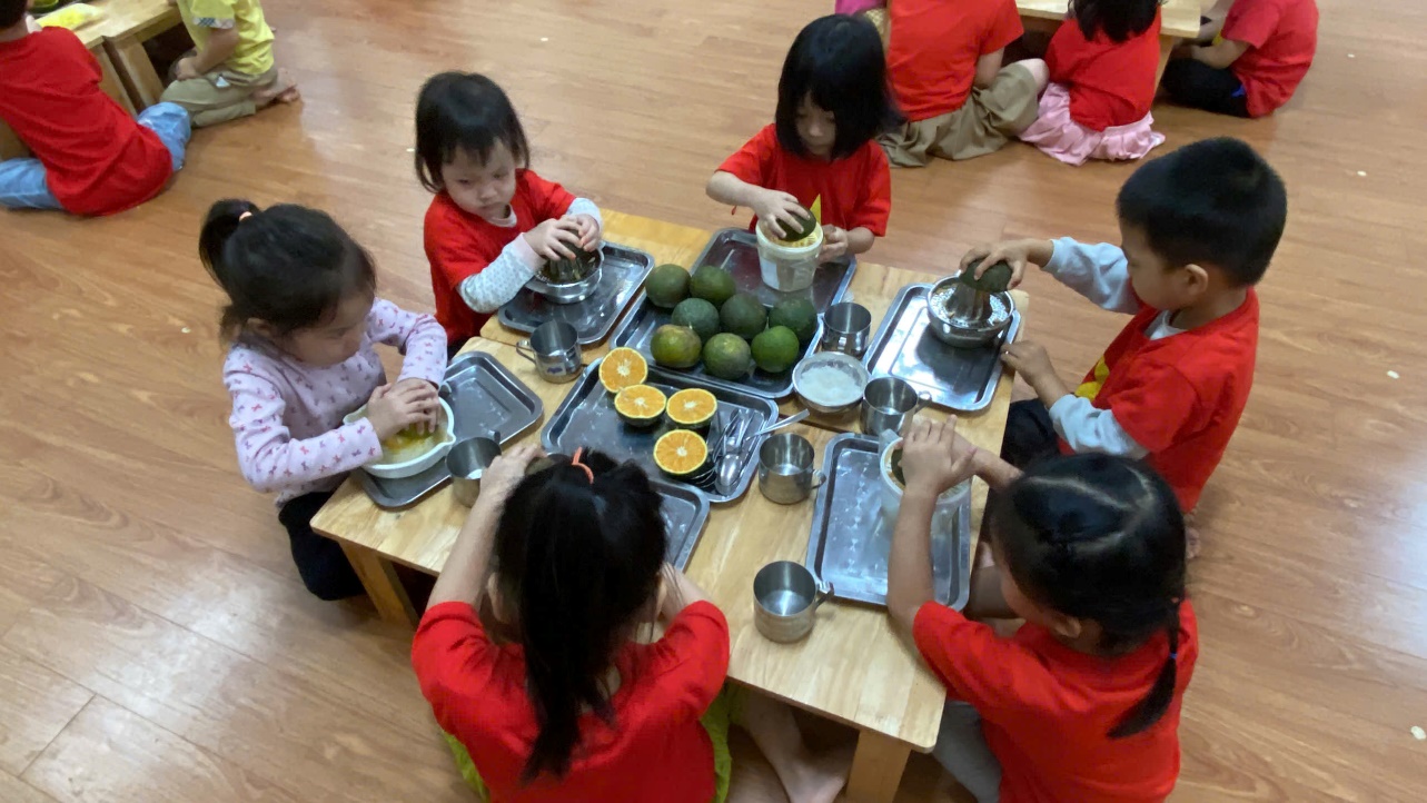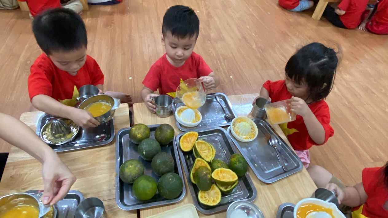 Hoạt động "vắt nước cam" khiến các bé rất thích thú vì các bé được thưởng thức cốc nước cam ngon, ngọt do chính mình tự tay mình làm. Các bé còn hiểu được muốn cơ thể khoẻ mạnh và lớn lên cần phải ăn uống đủ chất và cần uống bổ sung các loại nước hoa quả chứa nhiều vitamin. Đặc biệt nước cam có tác dụng giải khát và bồi bổ thể lực vì có nhiều vitamin C. Các bé được cô giáo hướng dẫn cụ thể từng kỹ năng cầm, xoay để vắt cam sao cho ra hết nước trong miếng cam và cùng thưởng thức cốc nước cam thơm ngon bổ dưỡng.