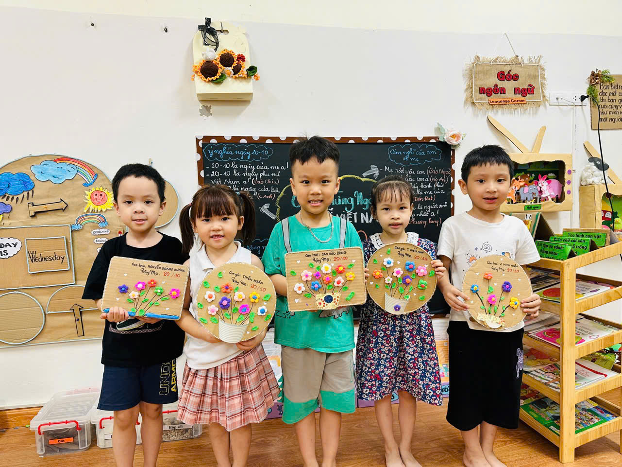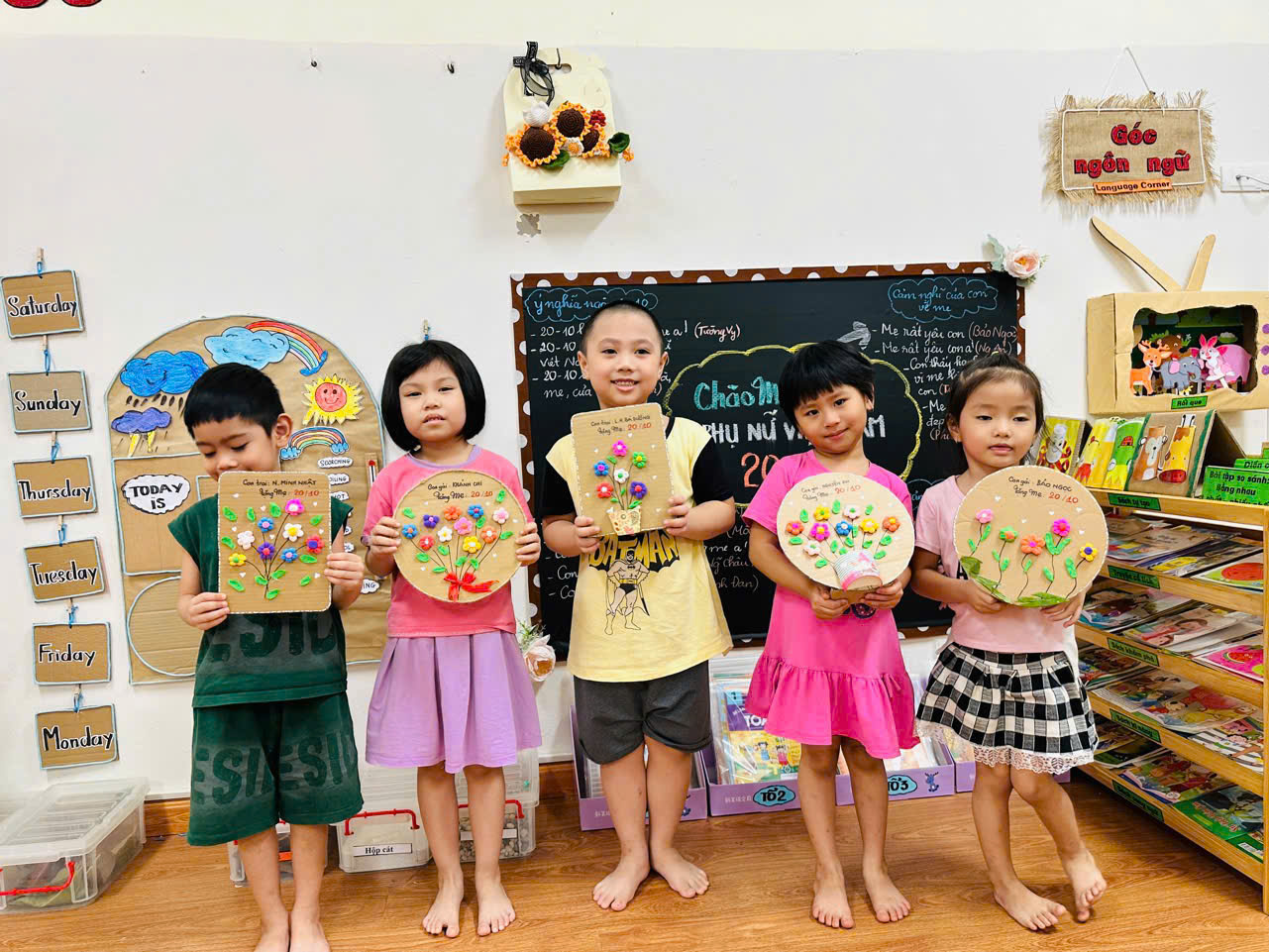 Hoà chung không khí vui tươi rộn ràng, các bé đã tự tay làm những bức tranh xinh xắn. Hoạt động này có ý nghĩa giúp các con biết trân trọng, yêu thương, những người phụ nữ xung quanh mình. Dù đôi tay bé nhỏ còn chút vụng về, những bằng tất cả nỗ lực và tình yêu dành cho bà, cho mẹ các con đã tạo lên những bức tranh thật xinh đẹp và đáng yêu.