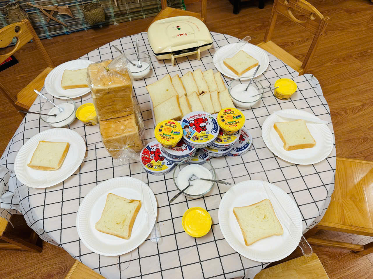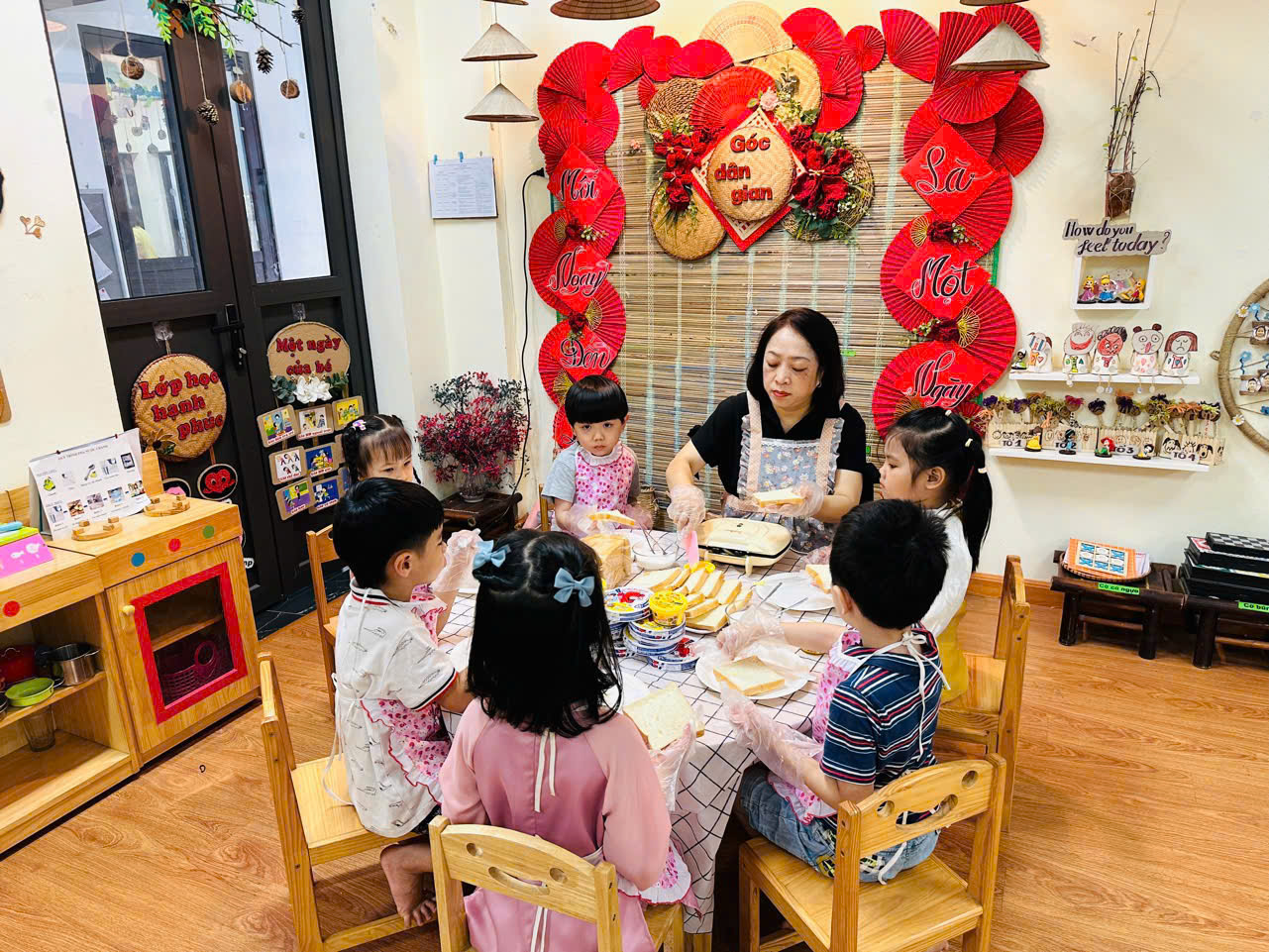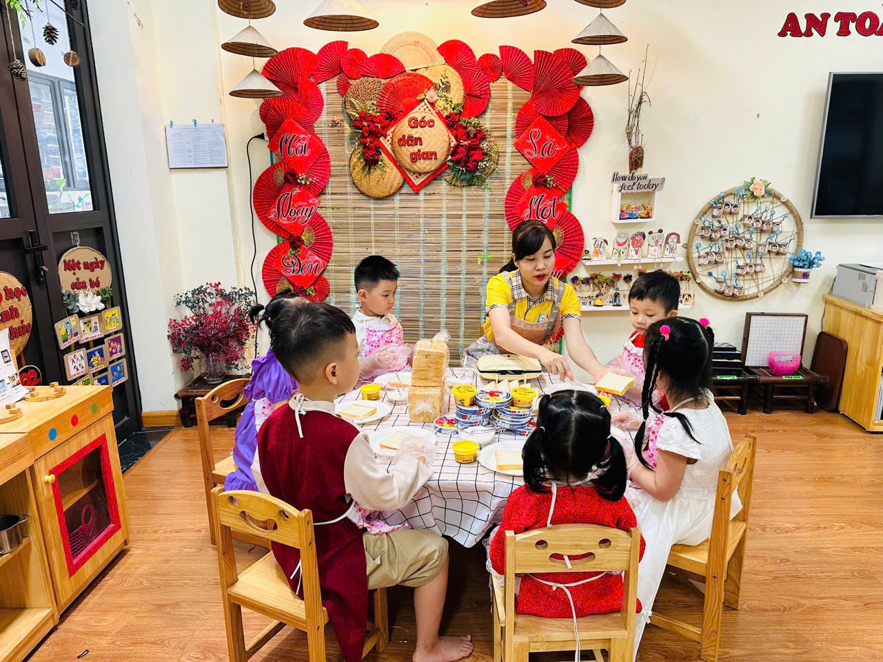 Kết hợp với “Bé tập làm nội trợ”, các con được tham gia bày tiệc Buffet và quây quần thưởng thức bữa tiệc có món “bánh mì phết bơ” do chính tay các con làm.