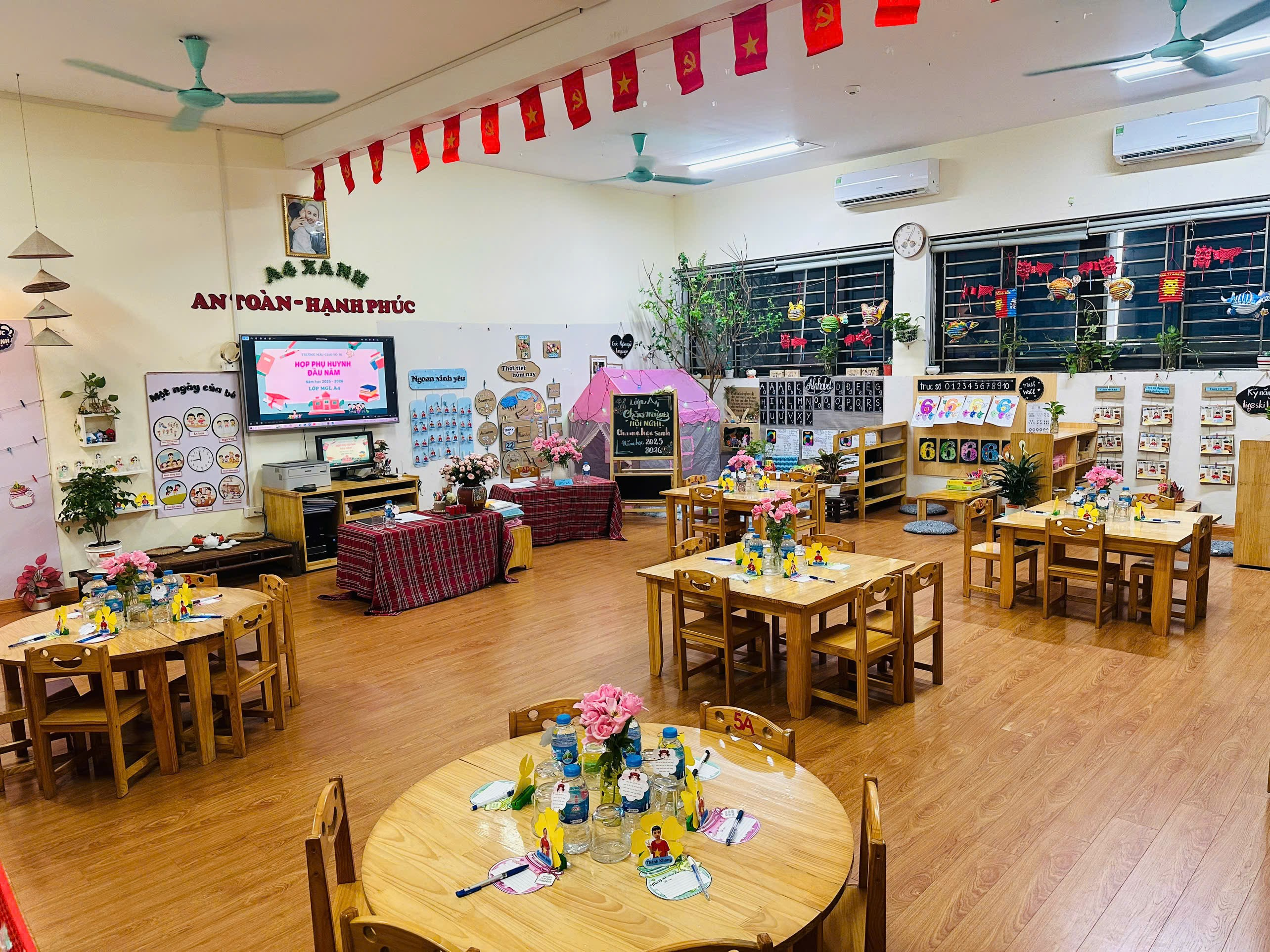 Nhà trường cũng đã có sự chuẩn bị chu đáo về cơ sở vật chất, môi trường lớp học, sân chơi, các phòng chức năng… để mang lại cho các con không gian học tập và vui chơi an toàn, thân thiện.