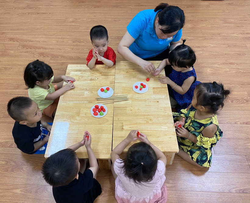 Cô giáo hướng dẫn trẻ nặn tò he quả hồng