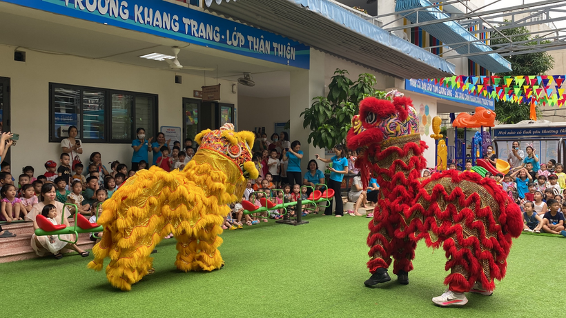 Tại sân trường các bé được trải nghiệm không khí trung thu với màn múa lân đặc sắc