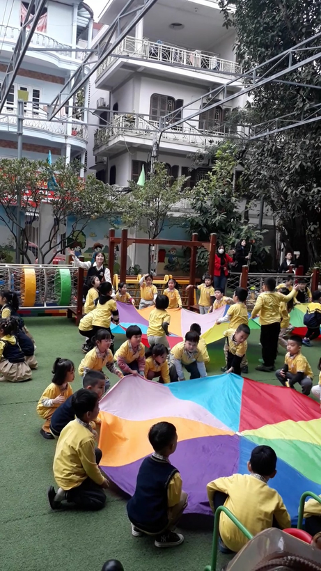 Hoạt động thể dục sáng với dù của khối mẫu giáo lớn