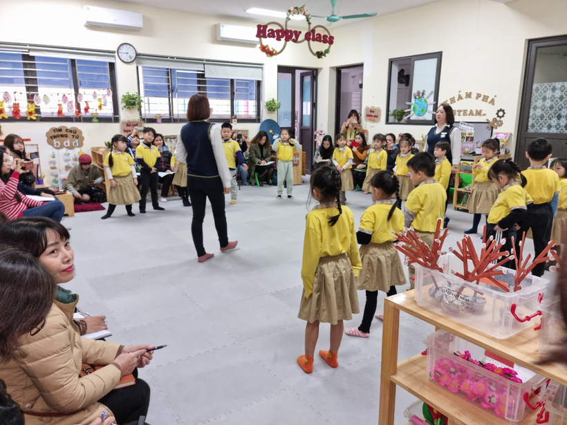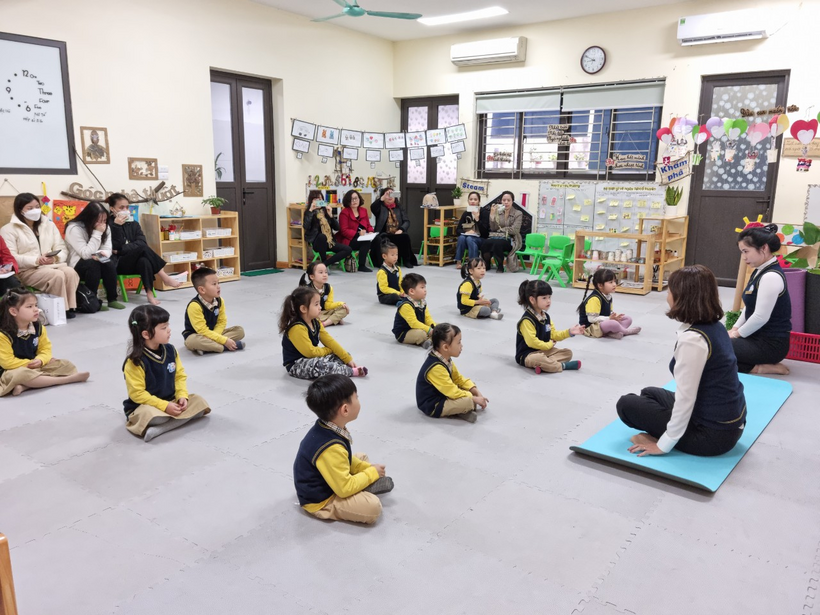 Sau khi dự các hoạt động giáo dục, đoàn đã thăm quan cơ sở vật chất, môi trường giáo dục của nhà trường bao gồm: Các lớp học, các phòng chức năng của cô và trẻ: phòng Thư viện, Thể chất, Máy tính & chiếu phim, Steam, Tạo hình, nhà bếp, nhà ăn của CB - GV - NV tại tầng 5 của trường.
