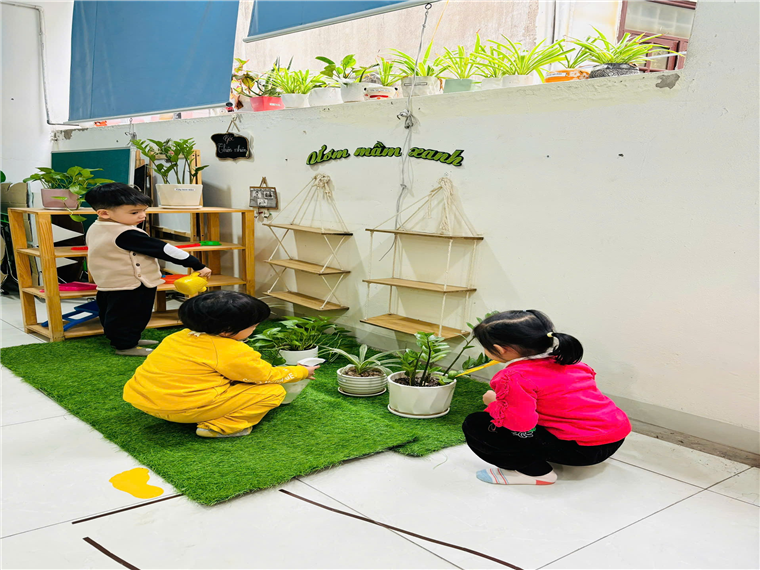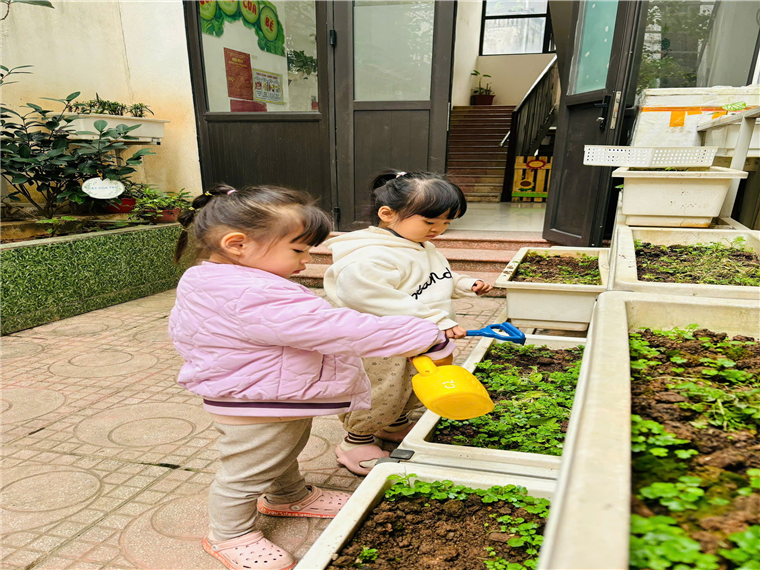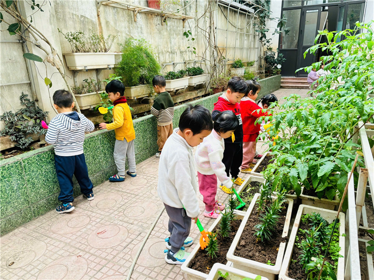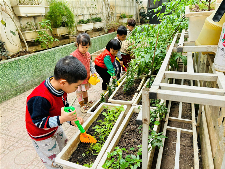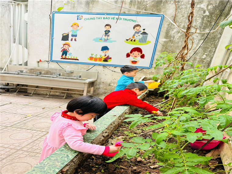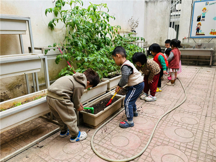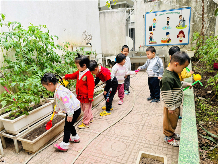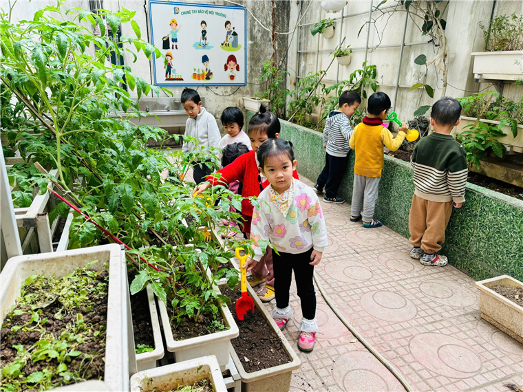 Ảnh các con đang chăm sóc vườn cây tại lớp