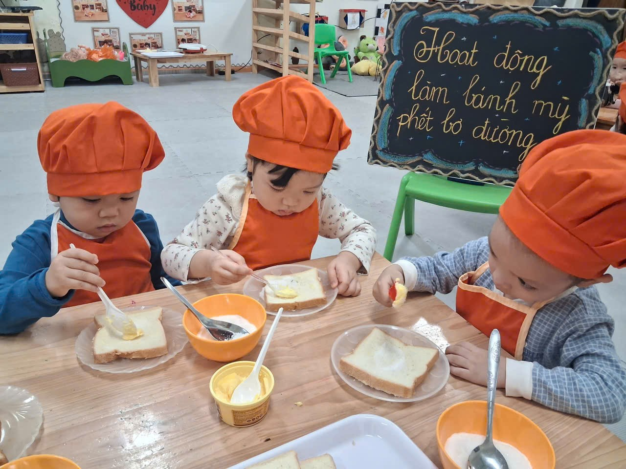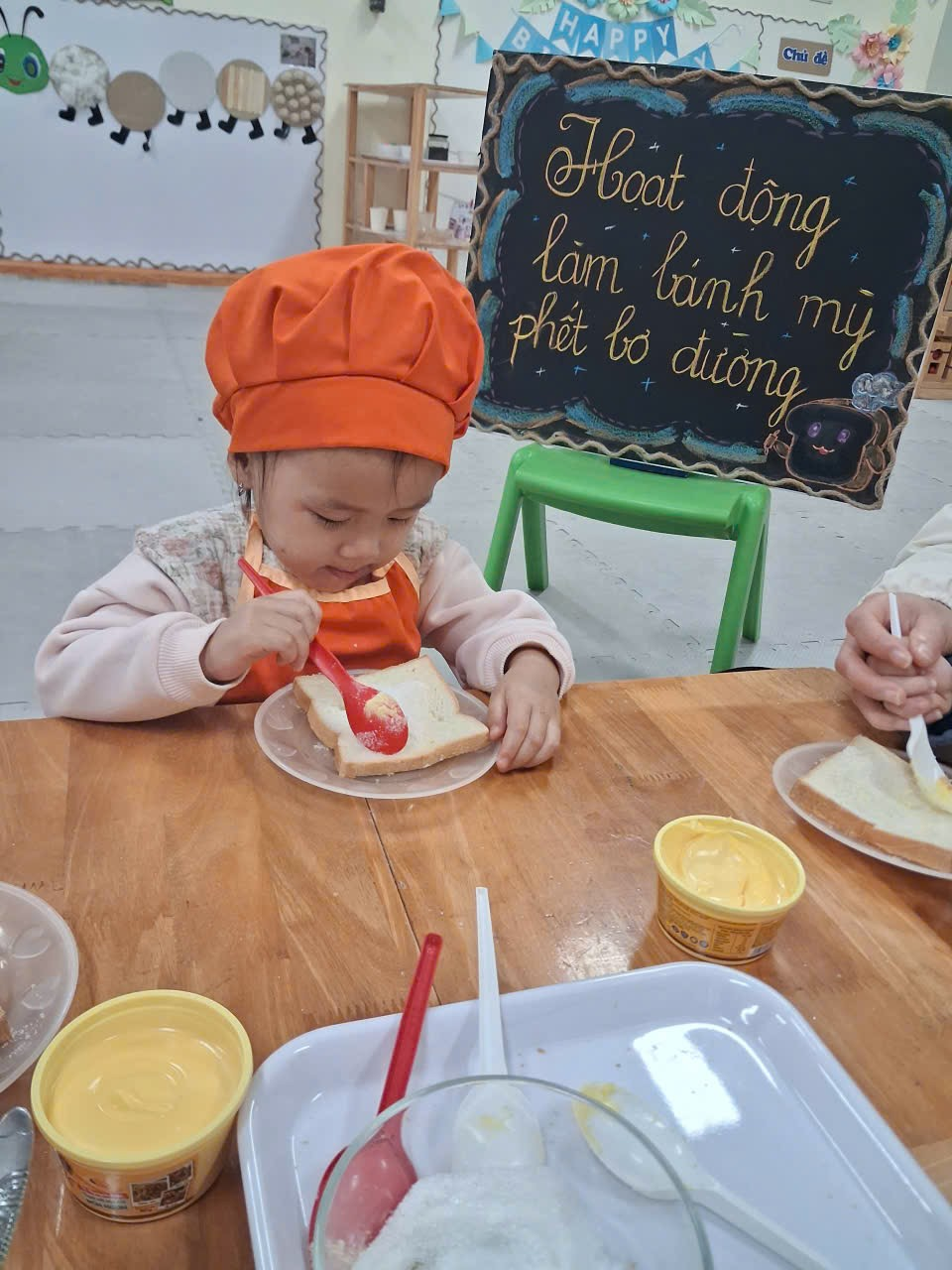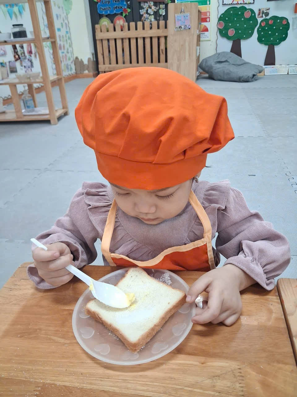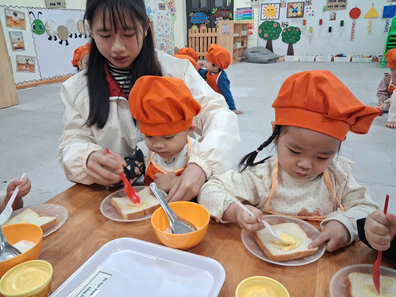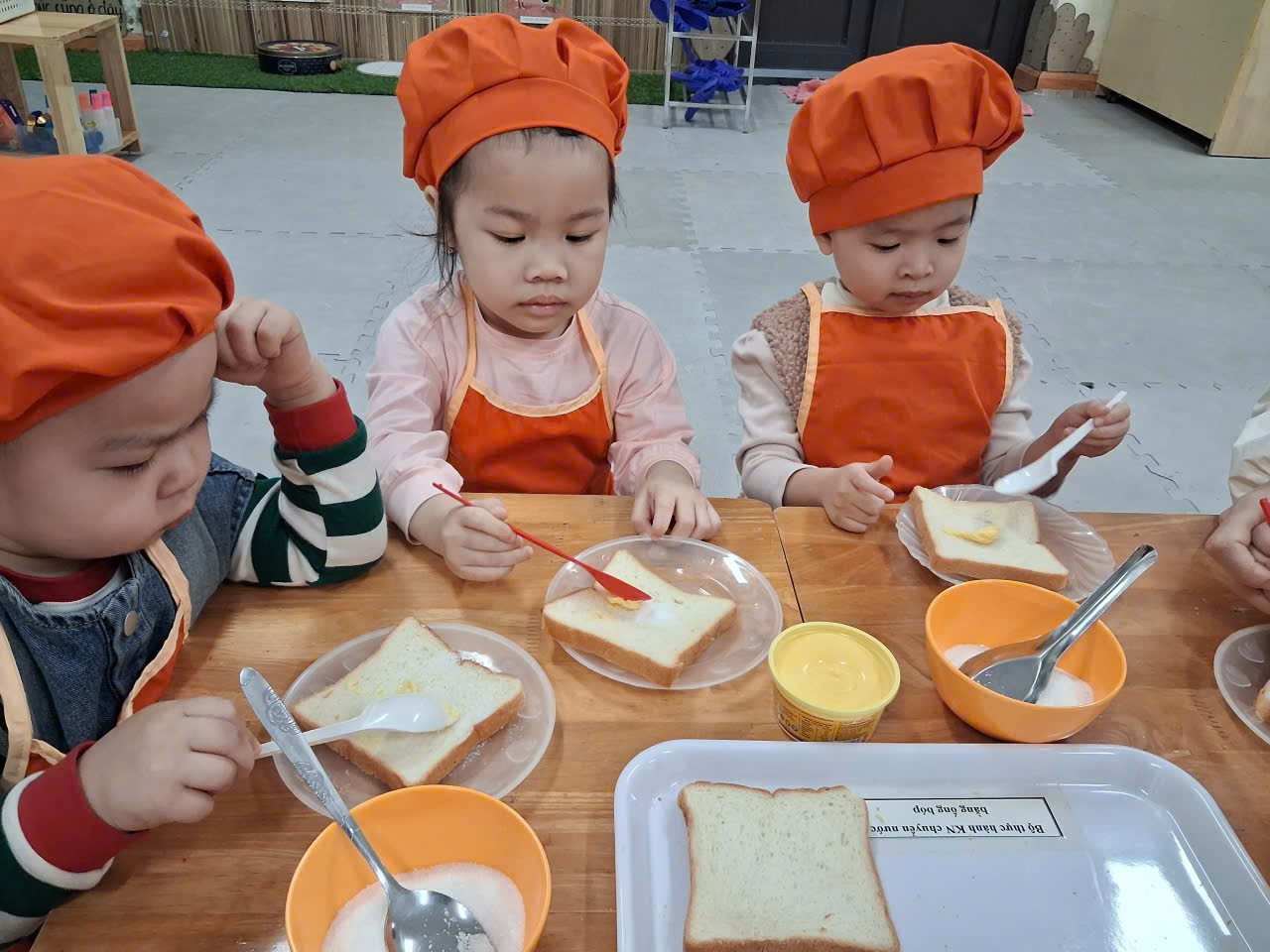Dưới sự hướng dẫn của cô, từng bạn được nhận dao phết bơ an toàn và nhẹ nhàng tập thao tác phết bơ lên mặt bánh. Có bạn còn chấm chấm thật nhiều bơ lên một chỗ, rồi cười khúc khích khi thấy bánh “béo ú”. Có bạn lại rất cẩn thận, phết từng chút một như một đầu bếp thực thụ. Trong đôi mắt trẻ thơ ánh lên sự thích thú, háo hứng và đầy mong chờ thành quả của mình.
