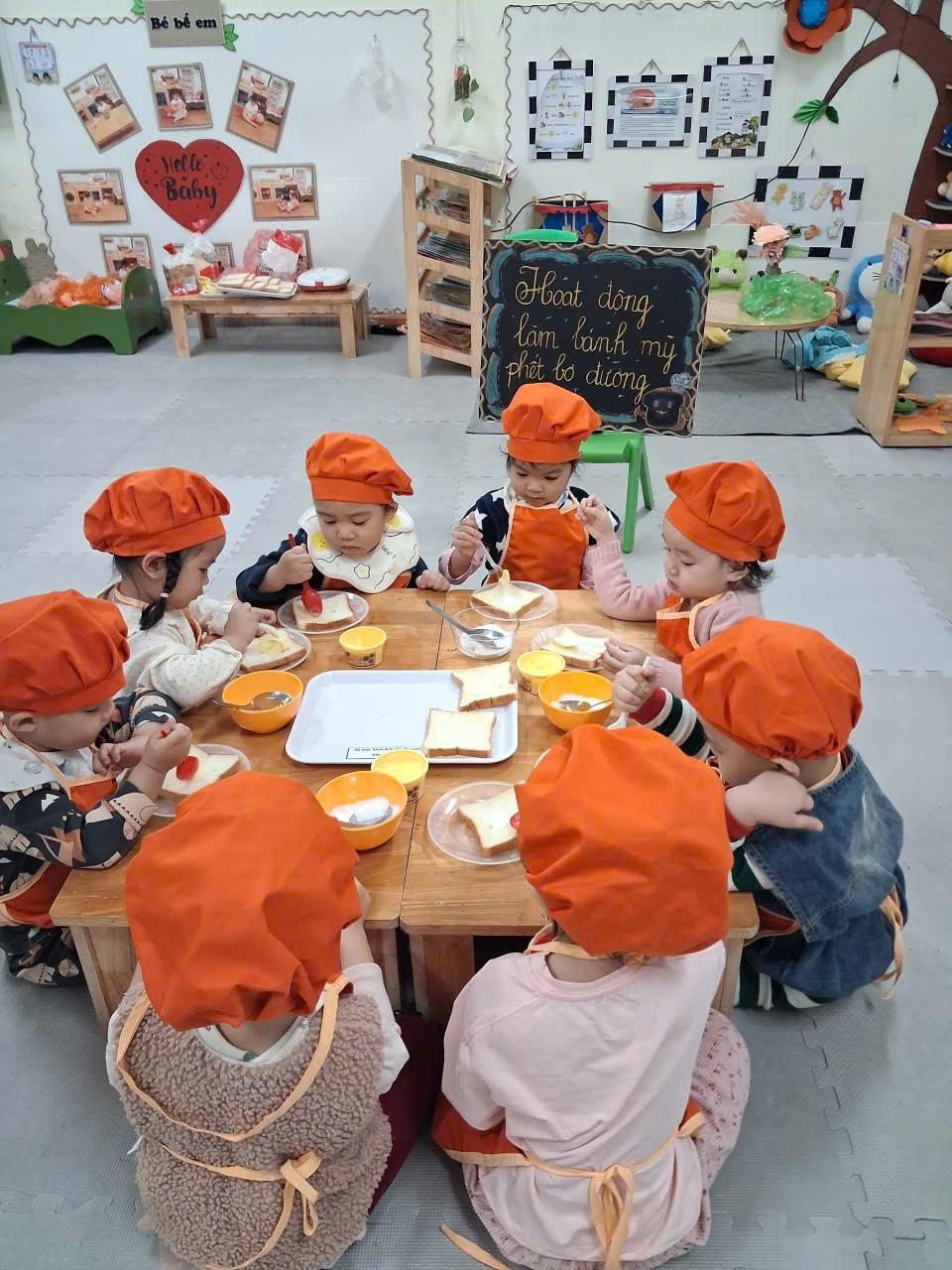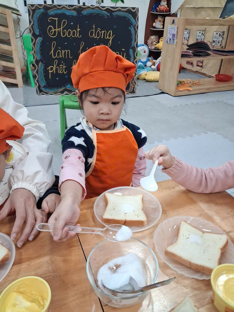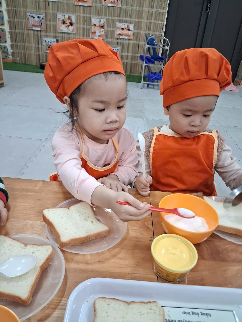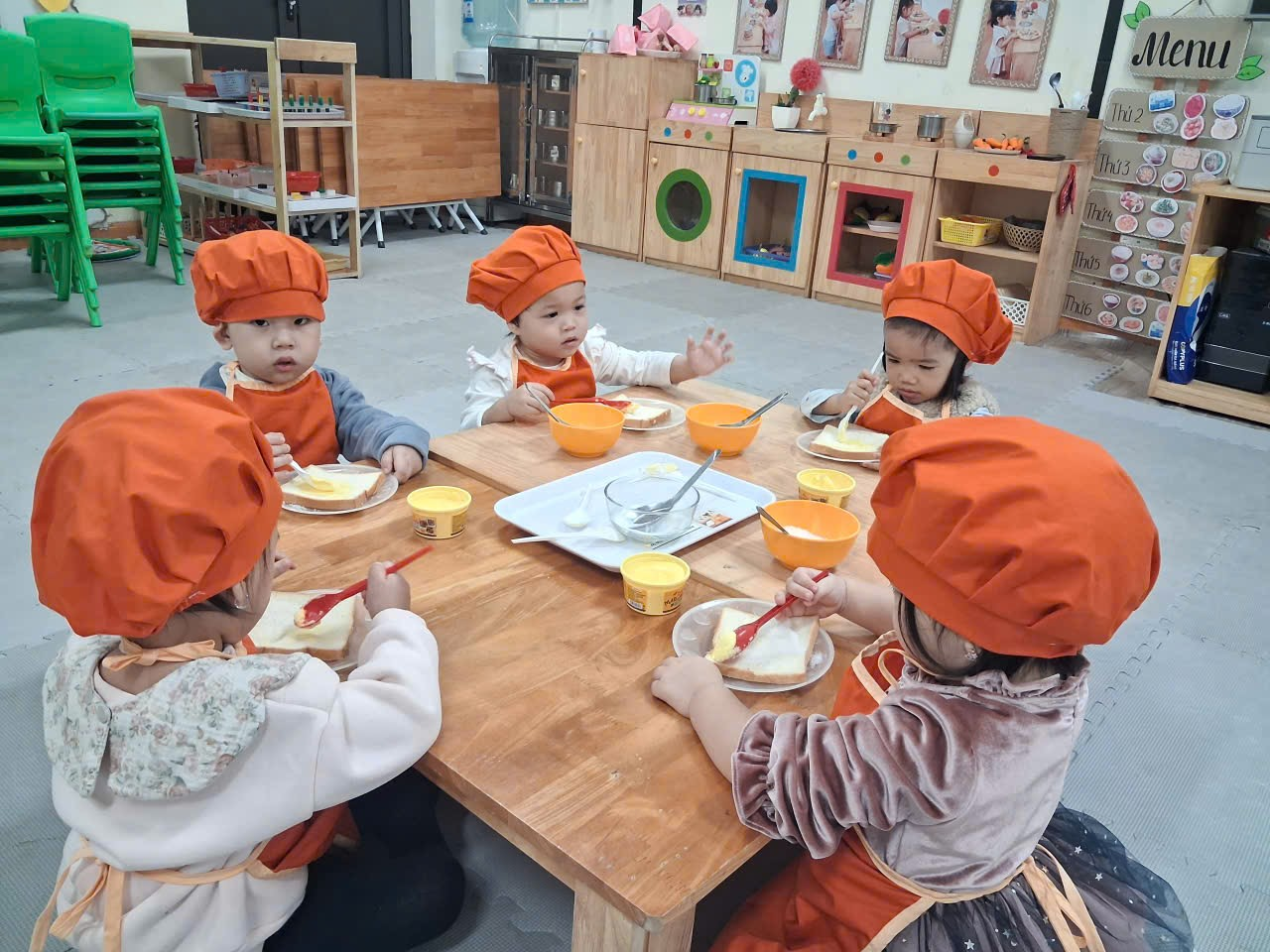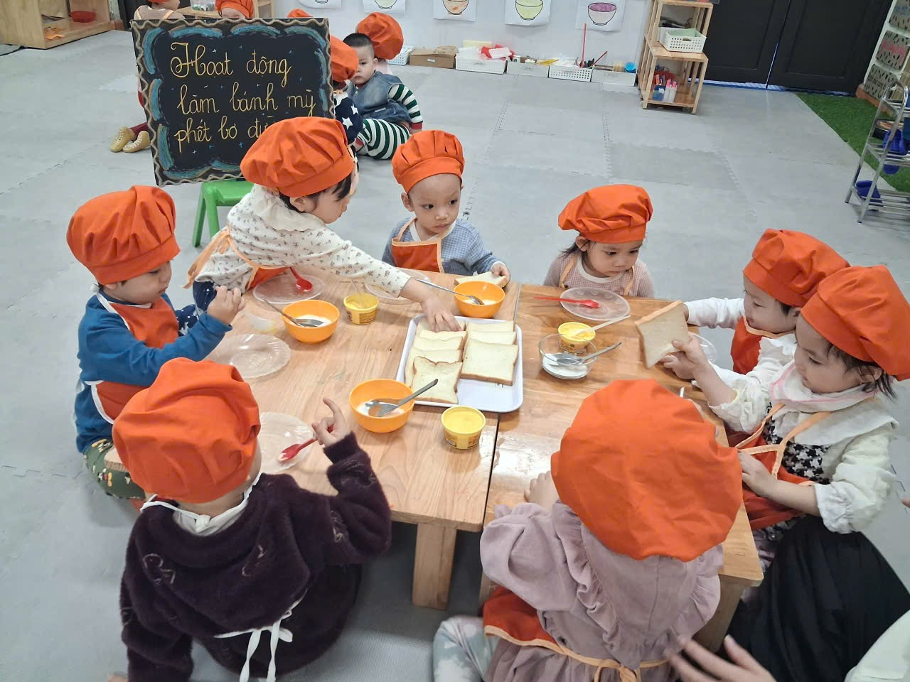 Dưới sự hướng dẫn của cô, từng bạn được nhận dao phết bơ an toàn và nhẹ nhàng tập thao tác phết bơ lên mặt bánh. Có bạn còn chấm chấm thật nhiều bơ lên một chỗ, rồi cười khúc khích khi thấy bánh “béo ú”. Có bạn lại rất cẩn thận, phết từng chút một như một đầu bếp thực thụ. Trong đôi mắt trẻ thơ ánh lên sự thích thú, háo hứng và đầy mong chờ thành quả của mình.