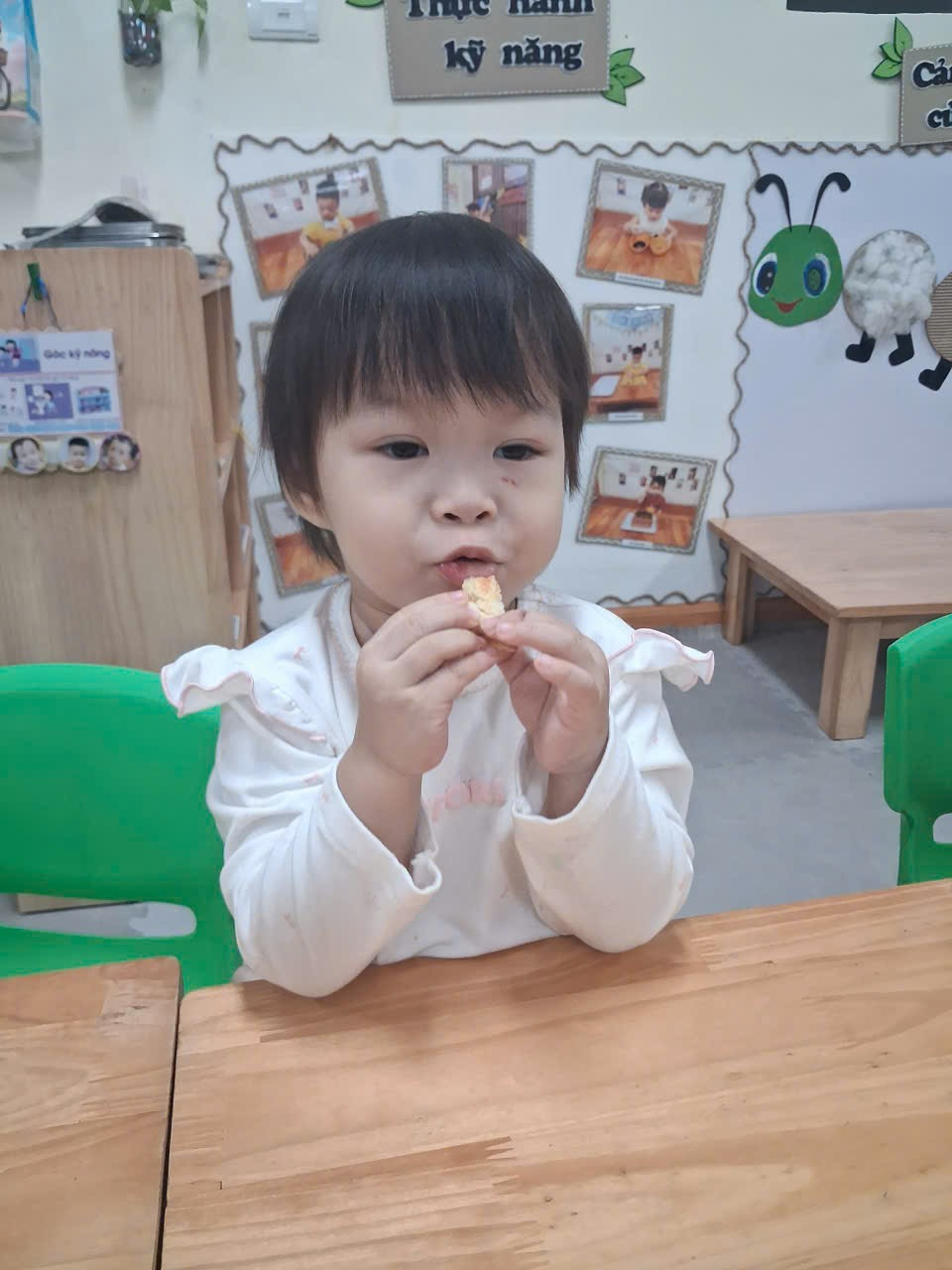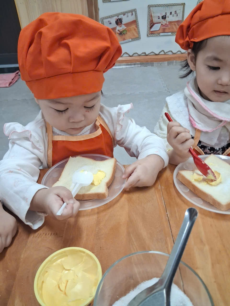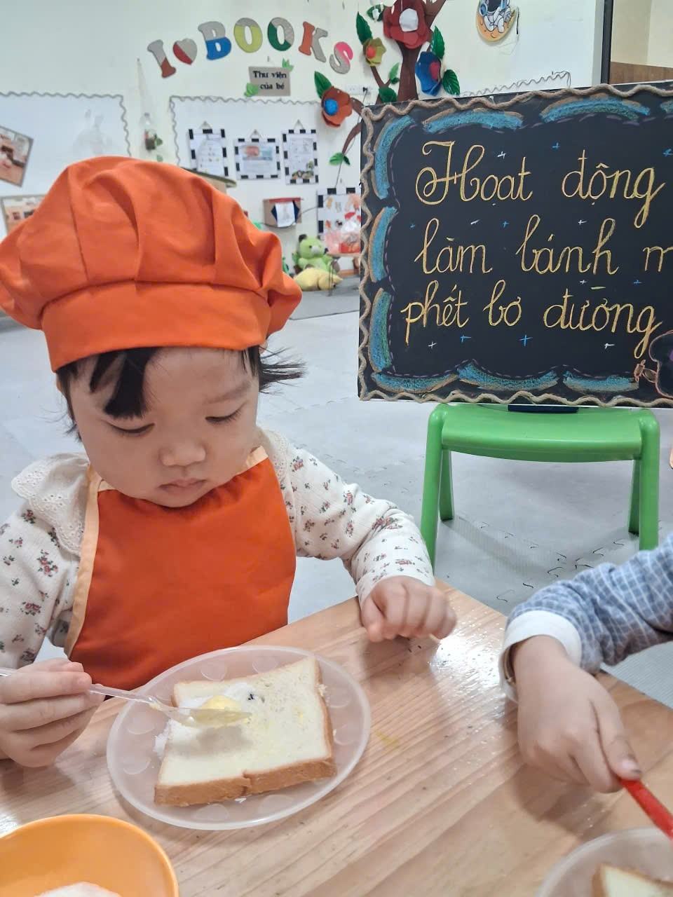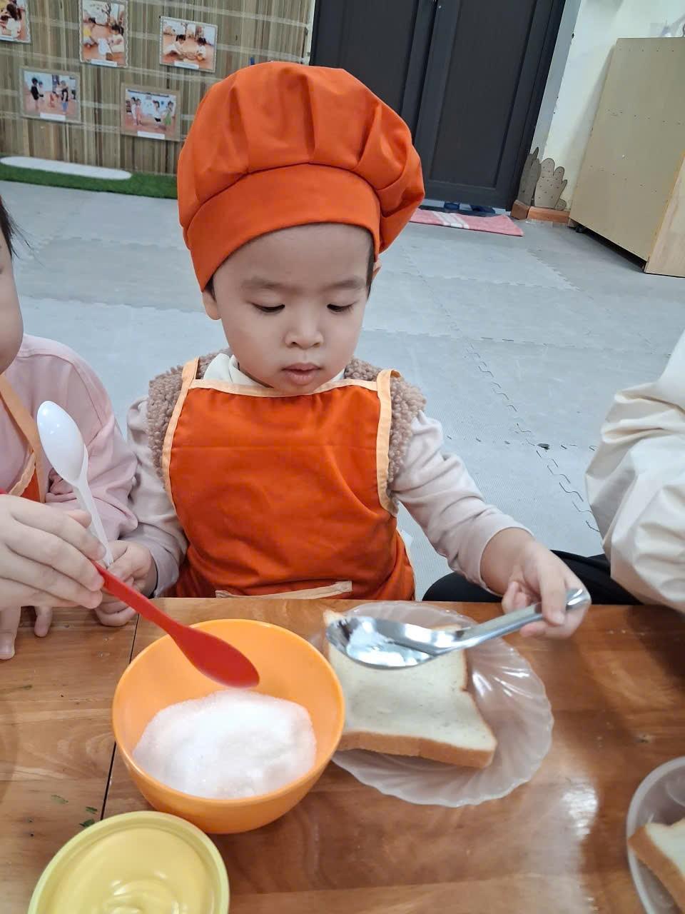 Dưới sự hướng dẫn của cô, từng bạn được nhận dao phết bơ an toàn và nhẹ nhàng tập thao tác phết bơ lên mặt bánh. Có bạn còn chấm chấm thật nhiều bơ lên một chỗ, rồi cười khúc khích khi thấy bánh “béo ú”. Có bạn lại rất cẩn thận, phết từng chút một như một đầu bếp thực thụ. Trong đôi mắt trẻ thơ ánh lên sự thích thú, háo hứng và đầy mong chờ thành quả của mình.