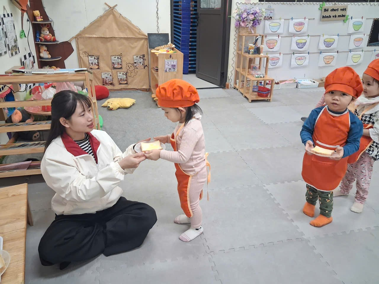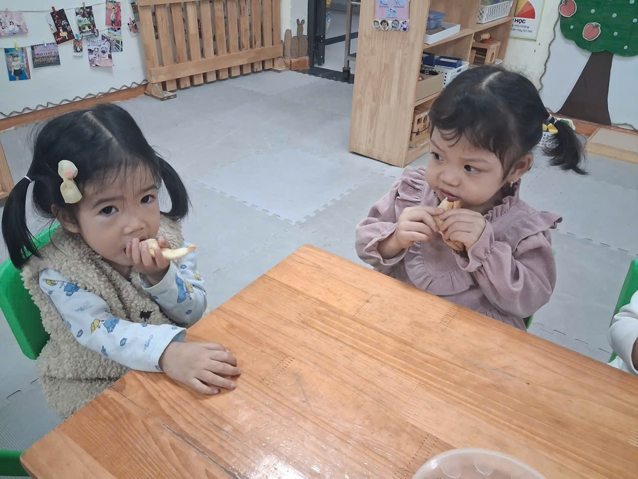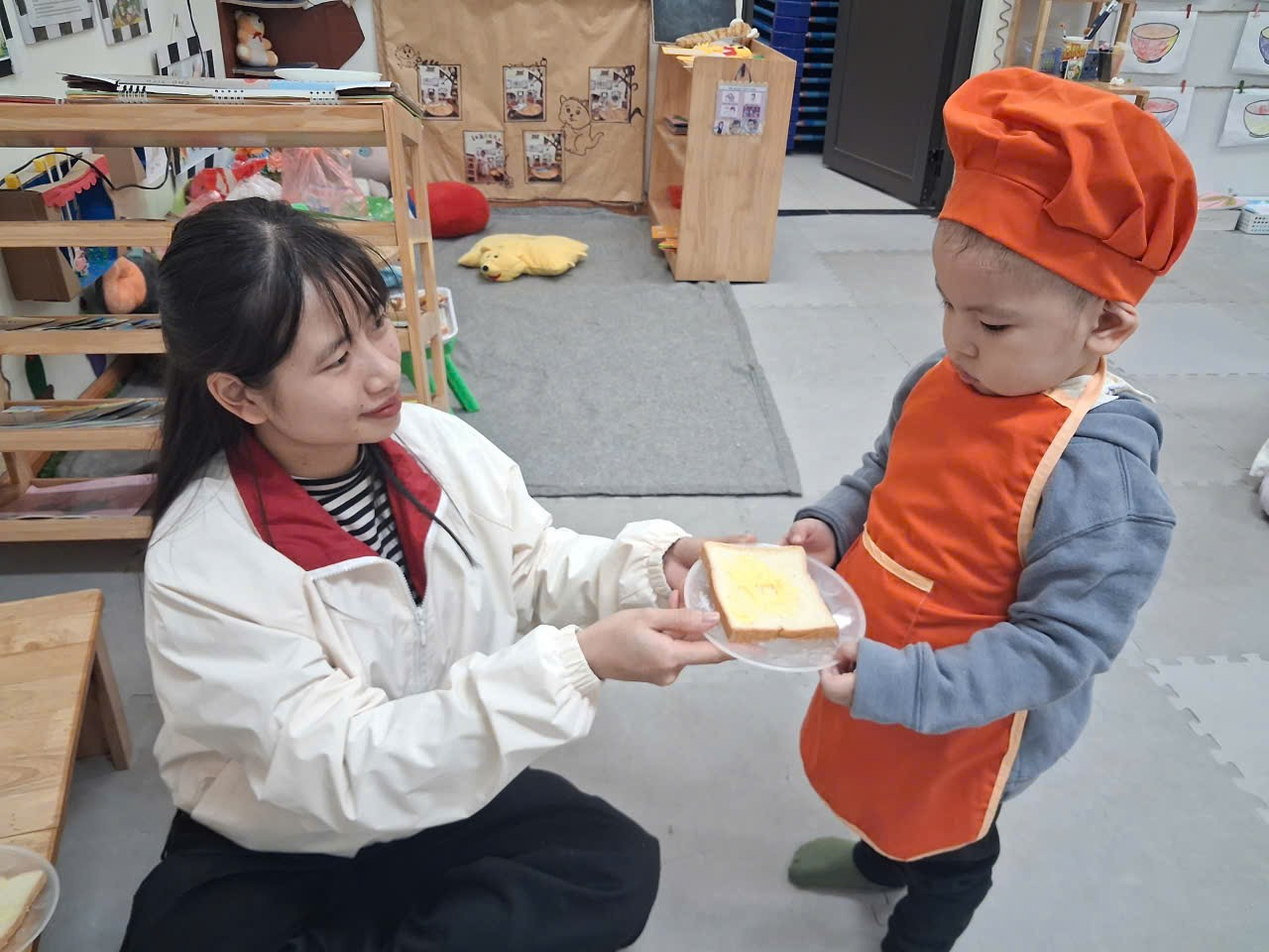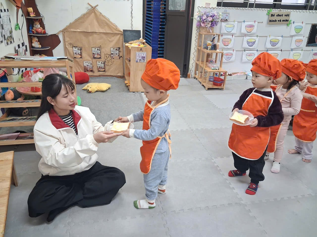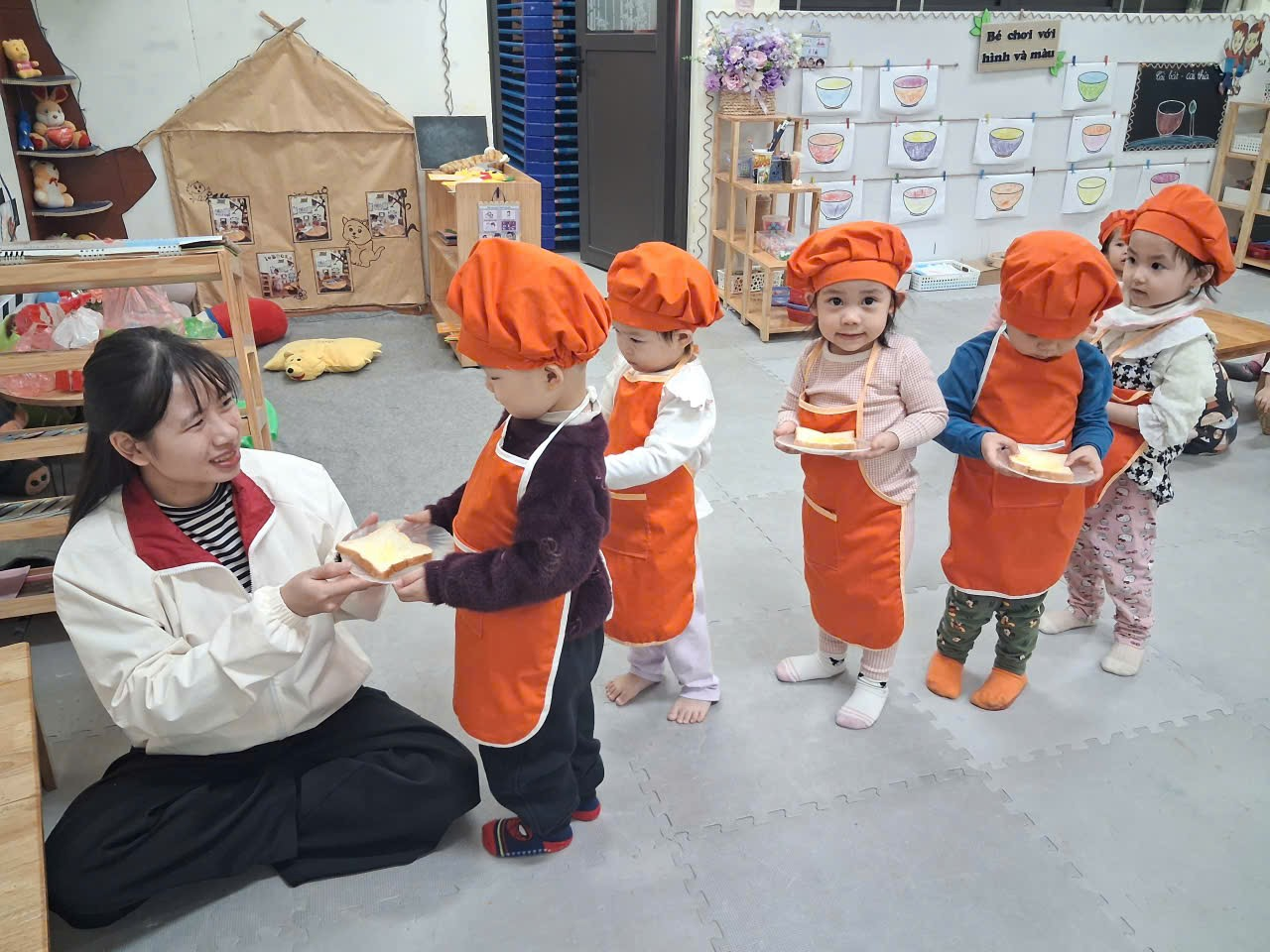 Dưới sự hướng dẫn của cô, từng bạn được nhận dao phết bơ an toàn và nhẹ nhàng tập thao tác phết bơ lên mặt bánh. Có bạn còn chấm chấm thật nhiều bơ lên một chỗ, rồi cười khúc khích khi thấy bánh “béo ú”. Có bạn lại rất cẩn thận, phết từng chút một như một đầu bếp thực thụ. Trong đôi mắt trẻ thơ ánh lên sự thích thú, háo hứng và đầy mong chờ thành quả của mình.