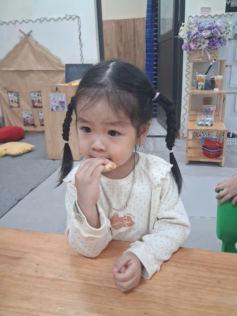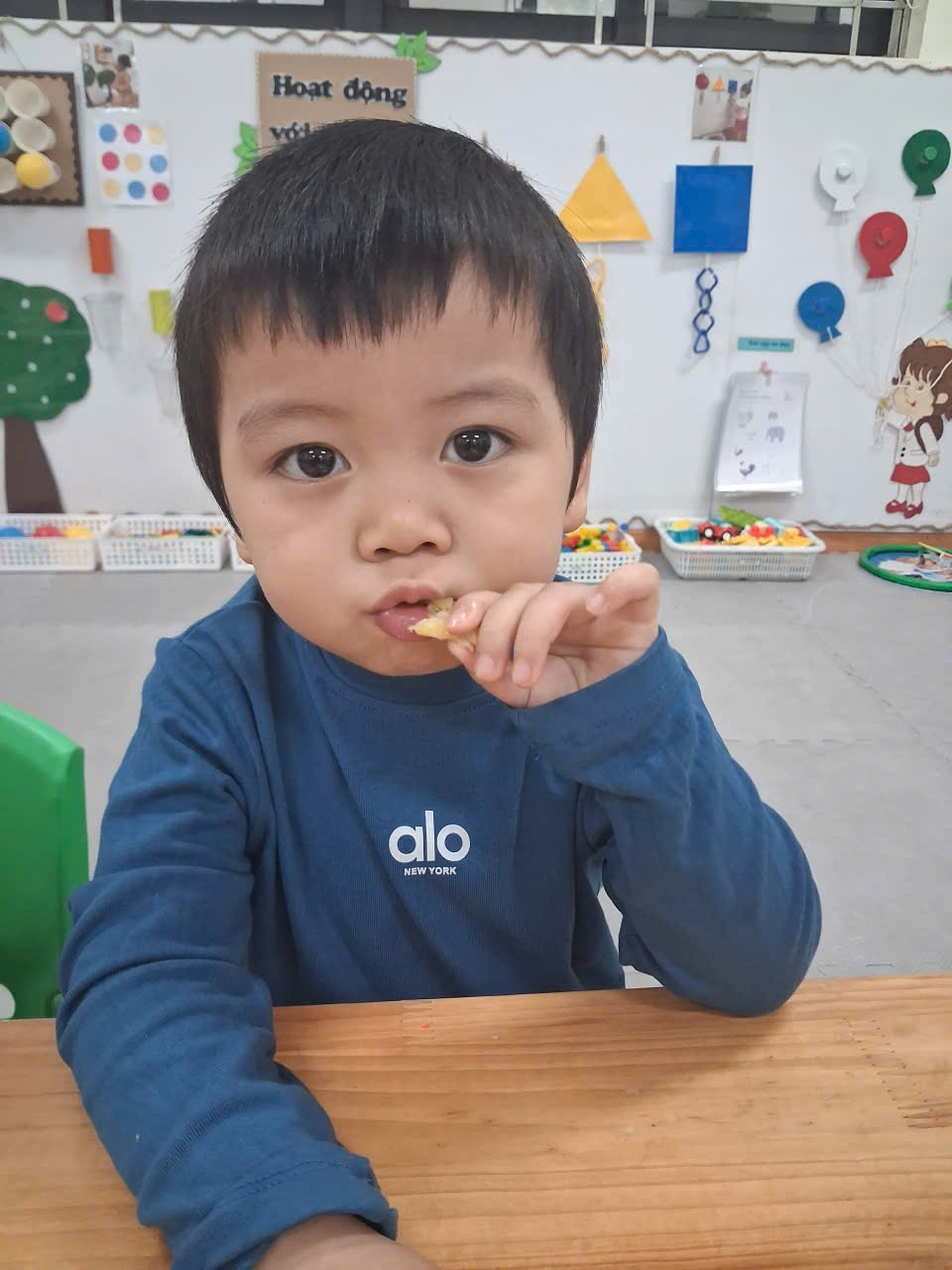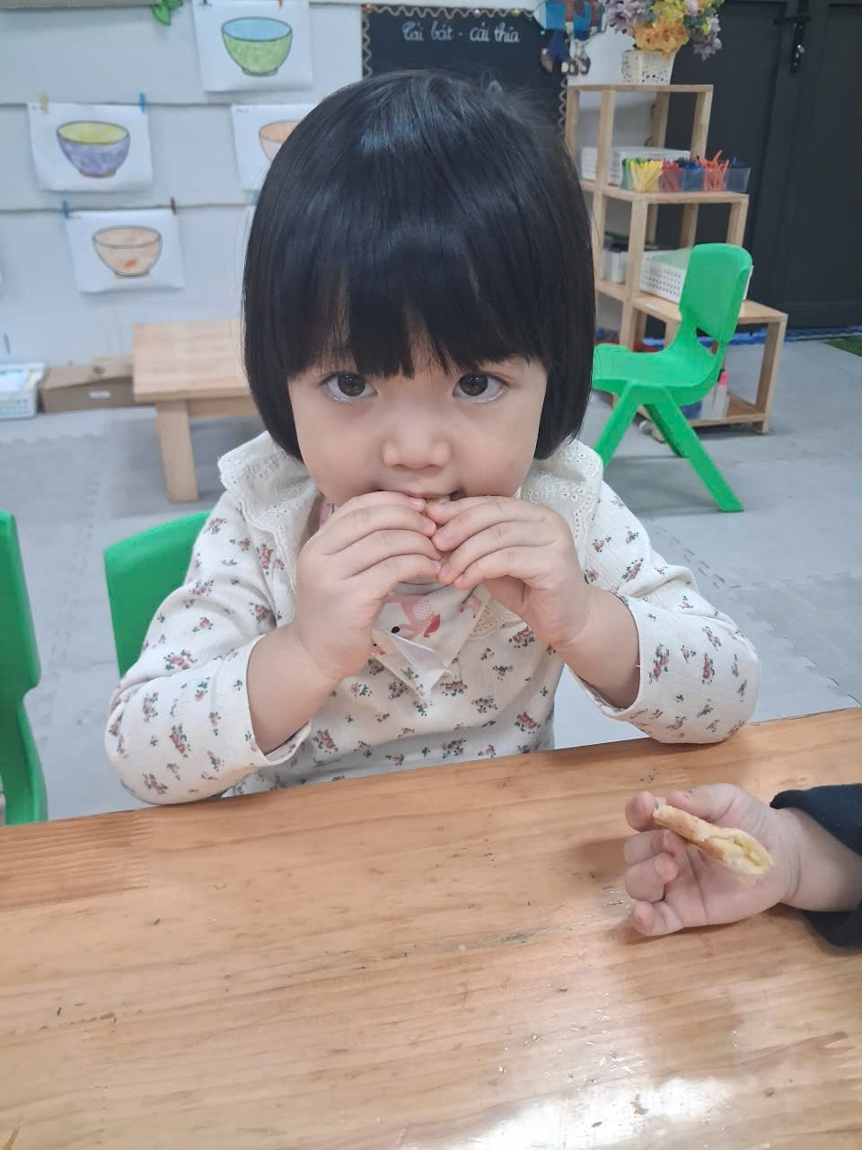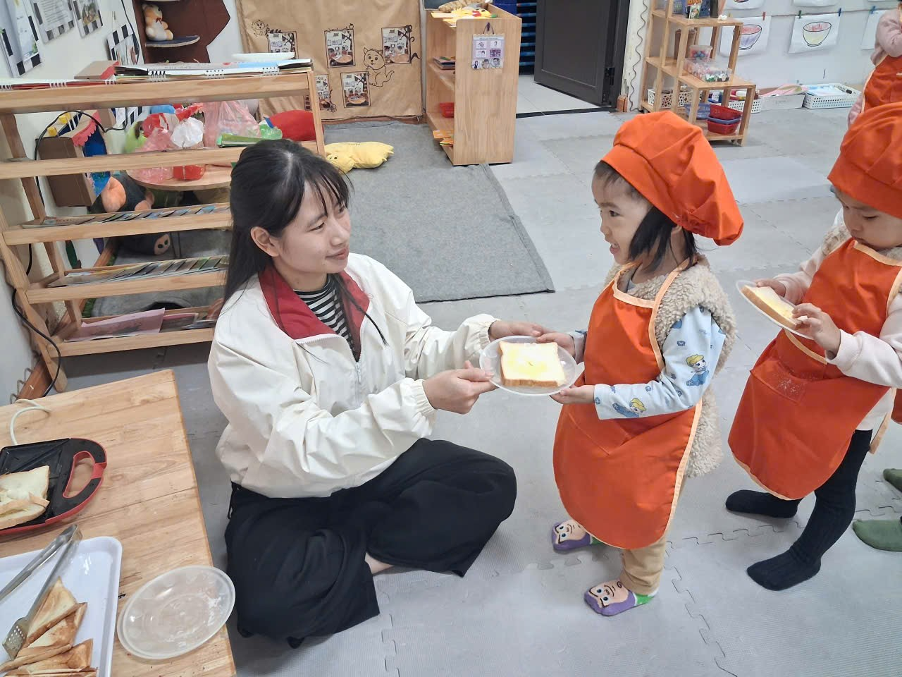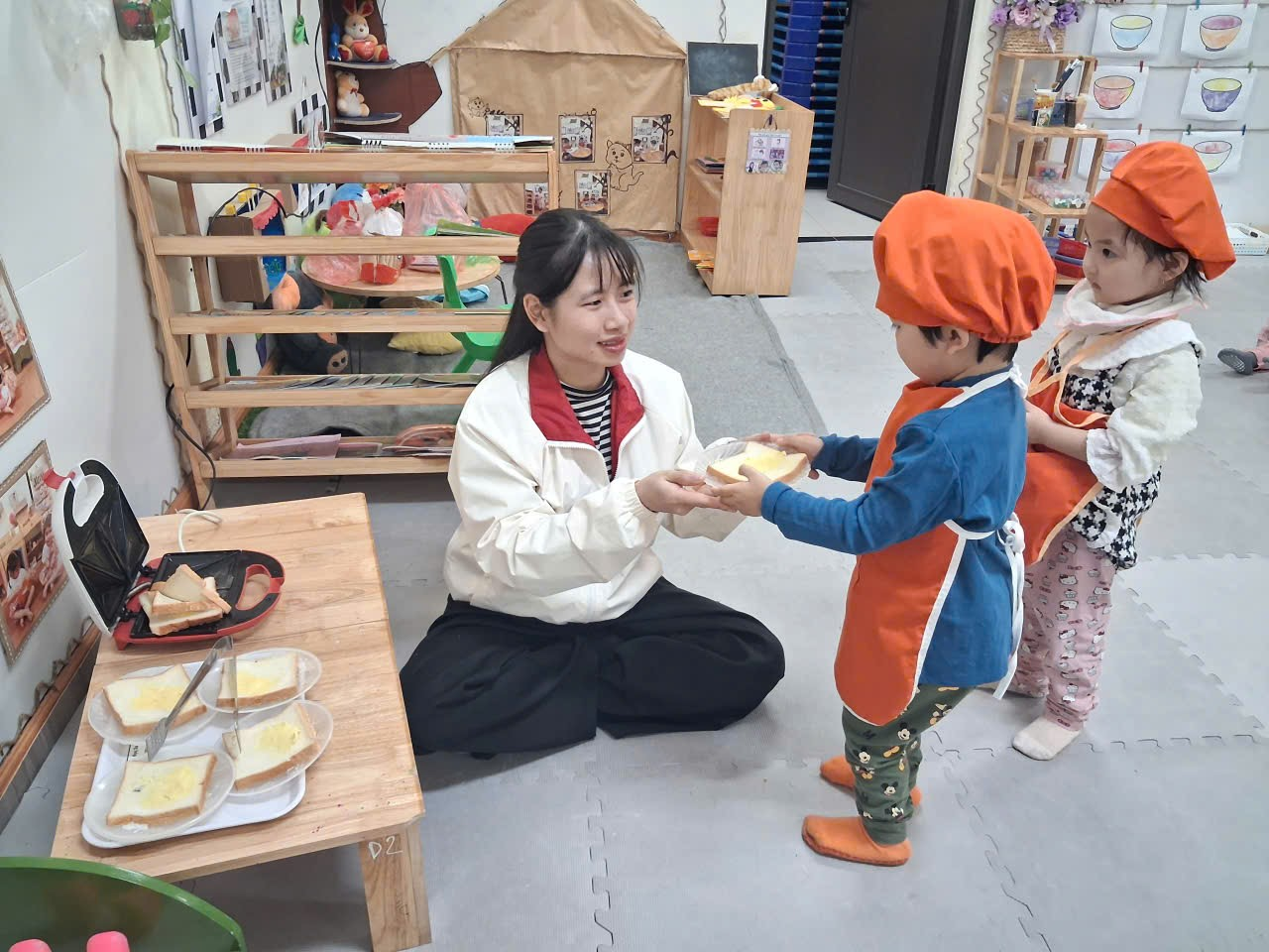 Dưới sự hướng dẫn của cô, từng bạn được nhận dao phết bơ an toàn và nhẹ nhàng tập thao tác phết bơ lên mặt bánh. Có bạn còn chấm chấm thật nhiều bơ lên một chỗ, rồi cười khúc khích khi thấy bánh “béo ú”. Có bạn lại rất cẩn thận, phết từng chút một như một đầu bếp thực thụ. Trong đôi mắt trẻ thơ ánh lên sự thích thú, háo hứng và đầy mong chờ thành quả của mình.