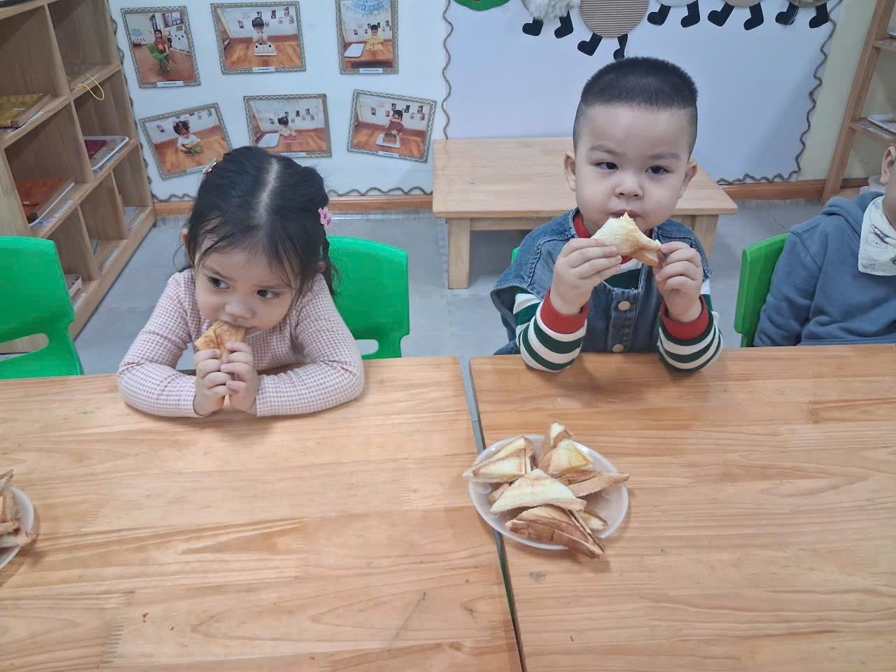 Tiếng cười nói rộn rã khắp lớp khi các con nhìn “thành quả” của mình. Những chiếc bánh mì được khoác “áo bơ” vàng ươm, thơm lừng. Và giây phút được thưởng thức chính chiếc bánh do tự tay mình làm khiến các con vô cùng thích thú. Bạn nào cũng ăn thật ngon miệng, miệng còn bám chút bơ trông vô cùng đáng yêu. Những tiếng nói ríu rít “ Ngon quá!’ “Cô ơi, mai làm tiếp nhé!”, cười rồi khi cầm miếng bánh trên tay khoe các bạn và cô.